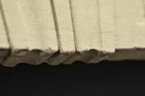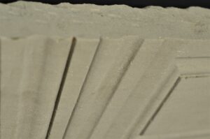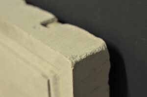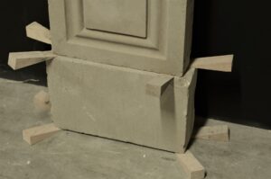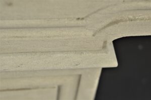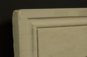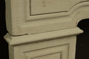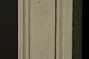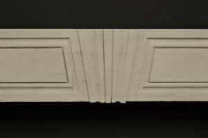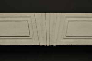 Gecentreerd in et front zit een sluitsteen met schuine cannelures, geflankeerd door panelen die ook terug komen in de stijlen die eindigen in massieve rechthoekige neuten.