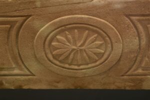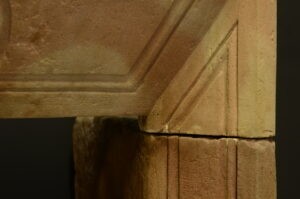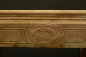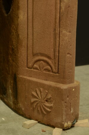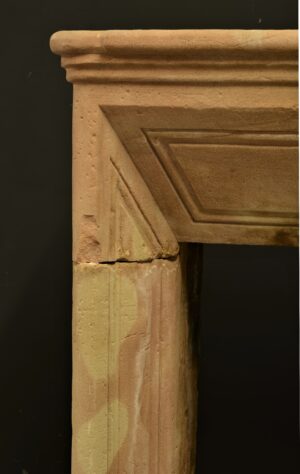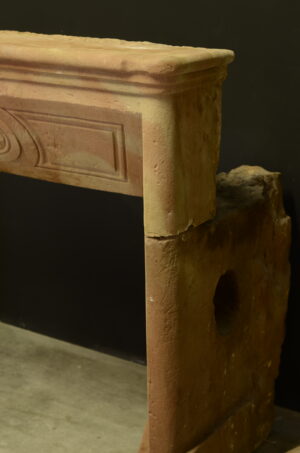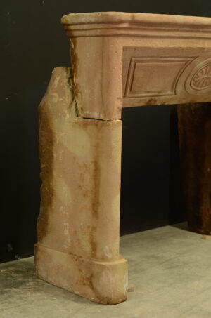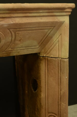 De schoorsteenmantel is gemaakt van Zandsteen uit het “Massif de Vosges” genaamd Grès Rose, roze zandsteen.
