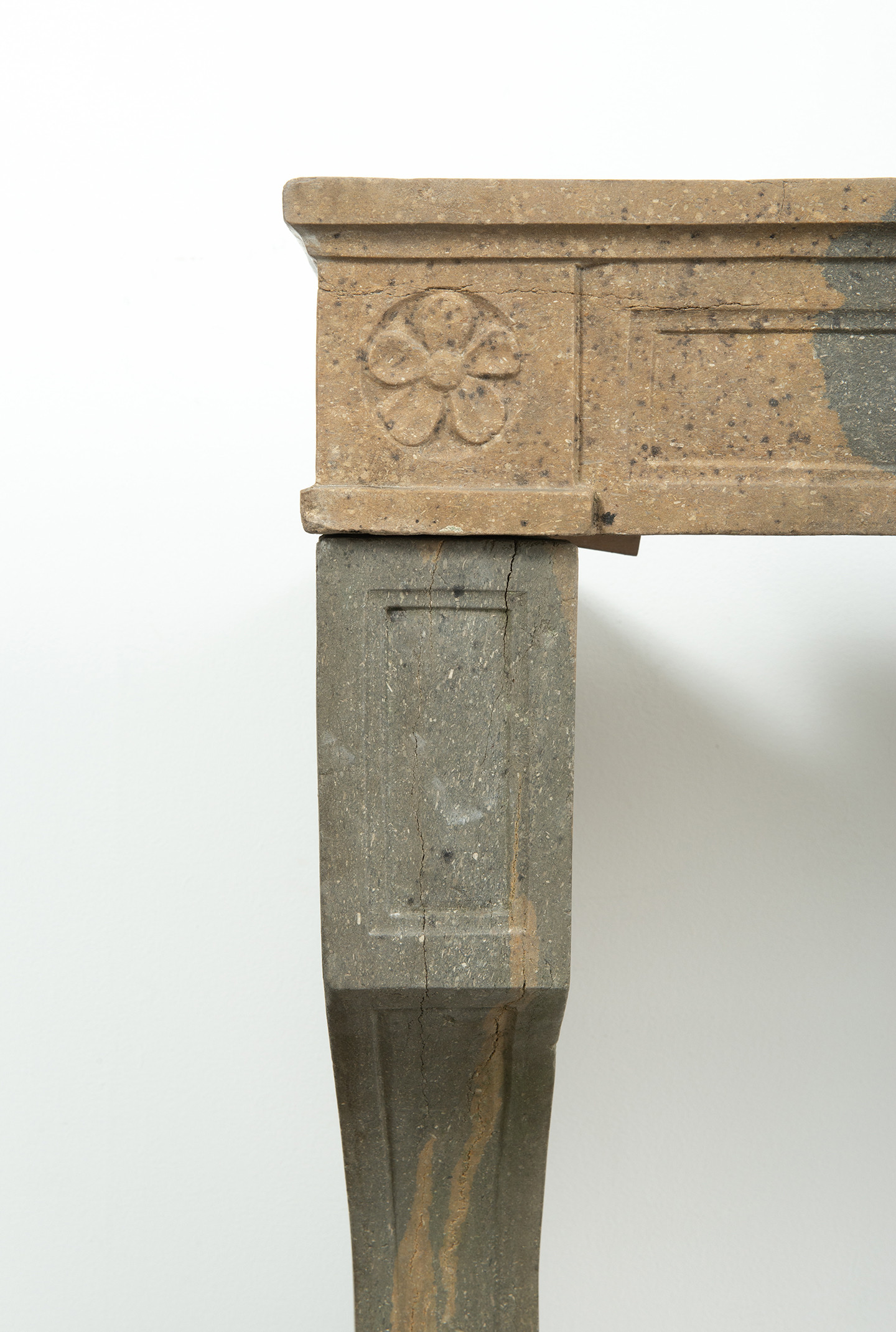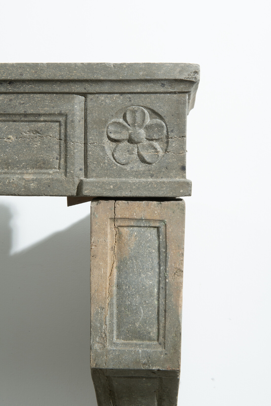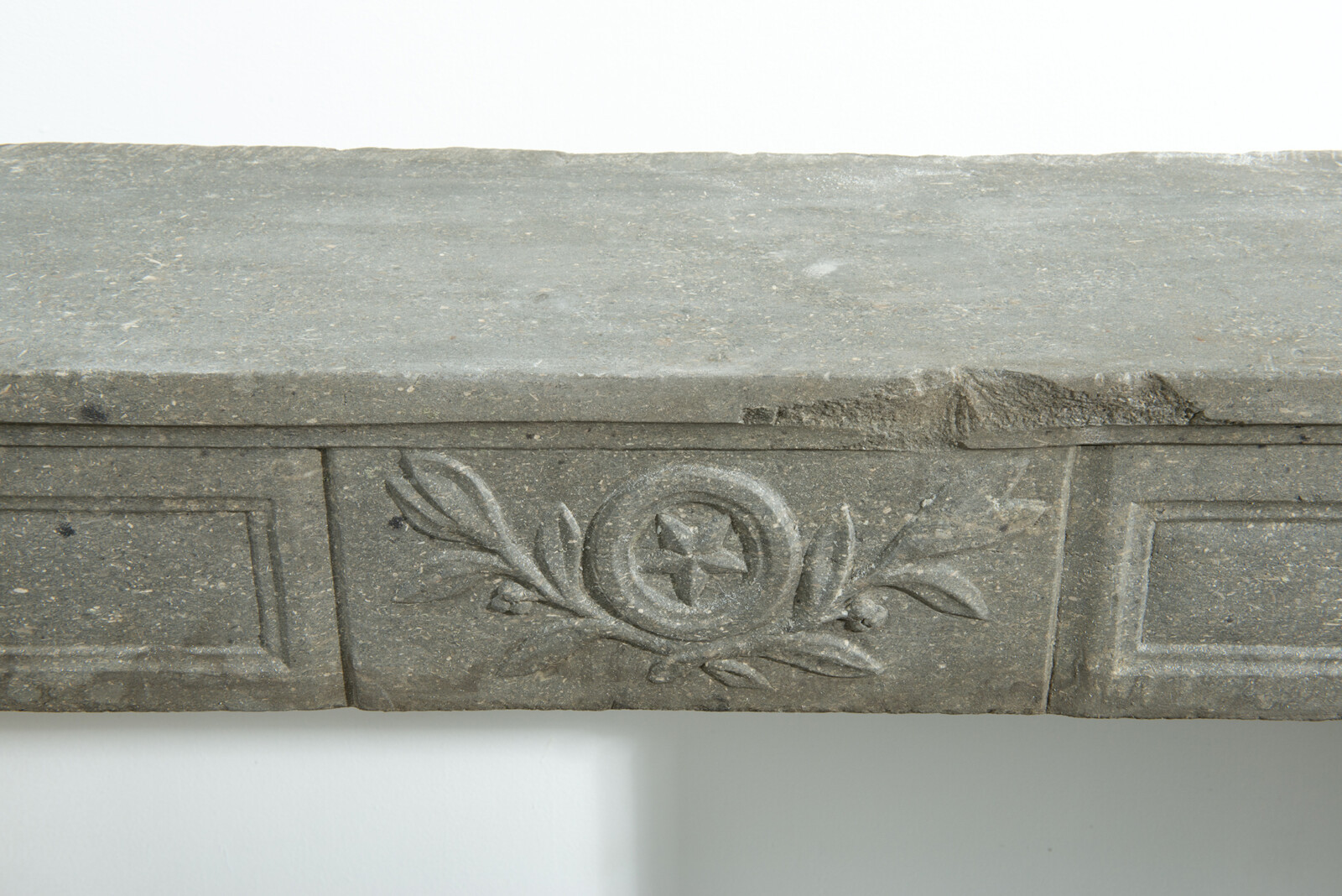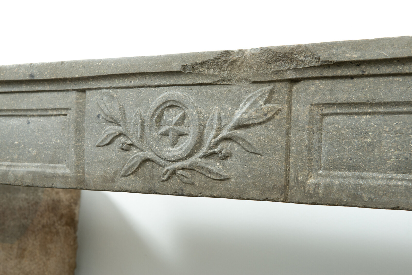 Het ontwerp volgt de soberheid en symmetrie van de Louis XVI-stijl, met panelen, bloemen en een krans die in de kalksteen gehakt zijn. Deze decoraties blijven bewust ingetogen en ondersteunen vooral de monumentale vorm van de schouw. Het resultaat is een indrukwekkend stuk waarin kracht, eenvoud en historische stijl samenkomen.
