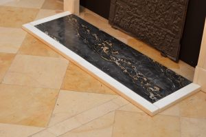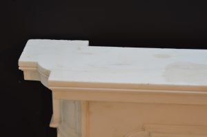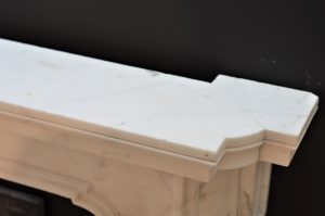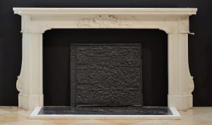 De prachtige schouw heeft een mooie geprofileerd en overhangend dekblad met daaronder een front met een doorlopend paneel met een gecentreerd en prachtige uitlopende schelp.
