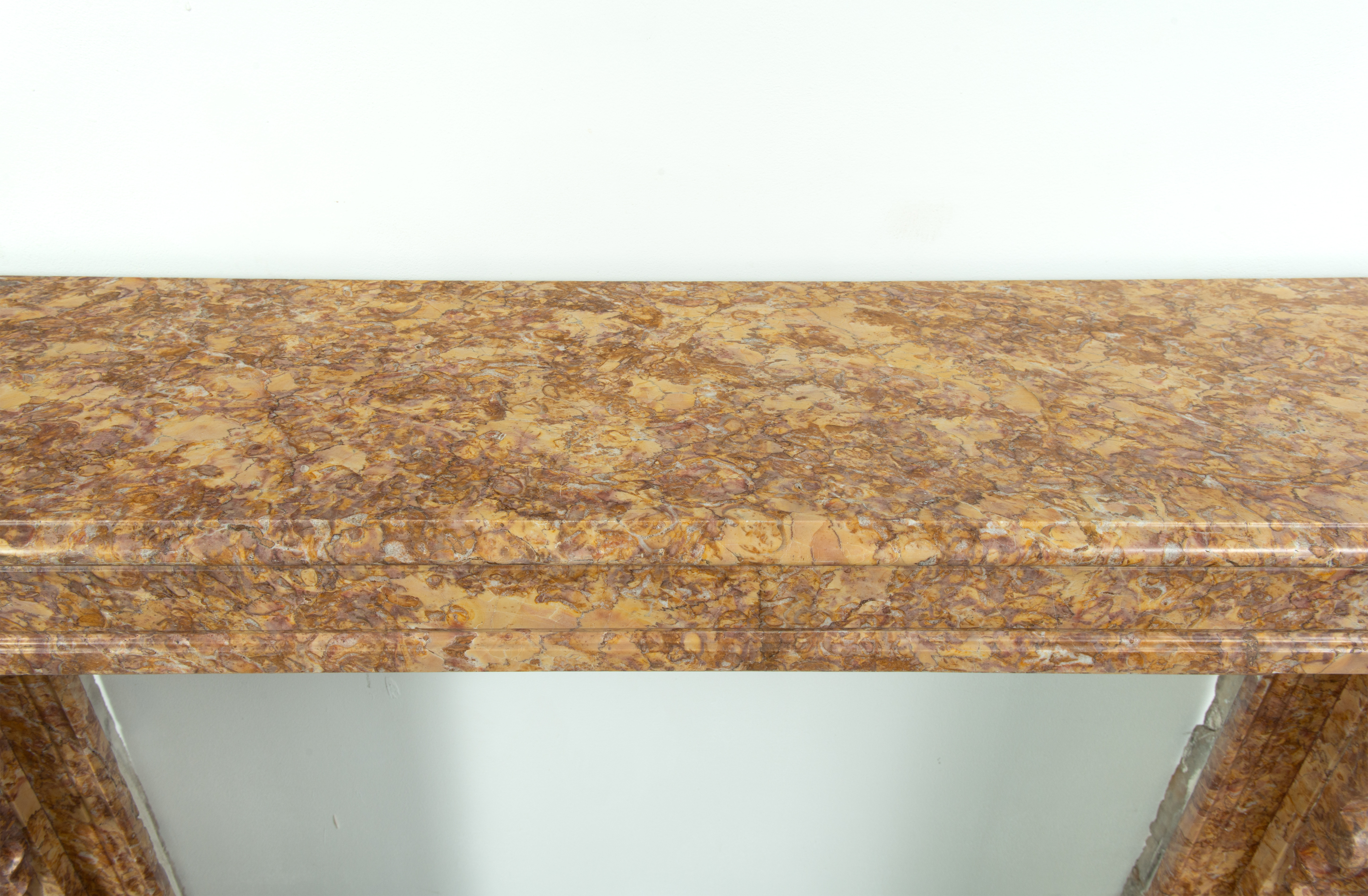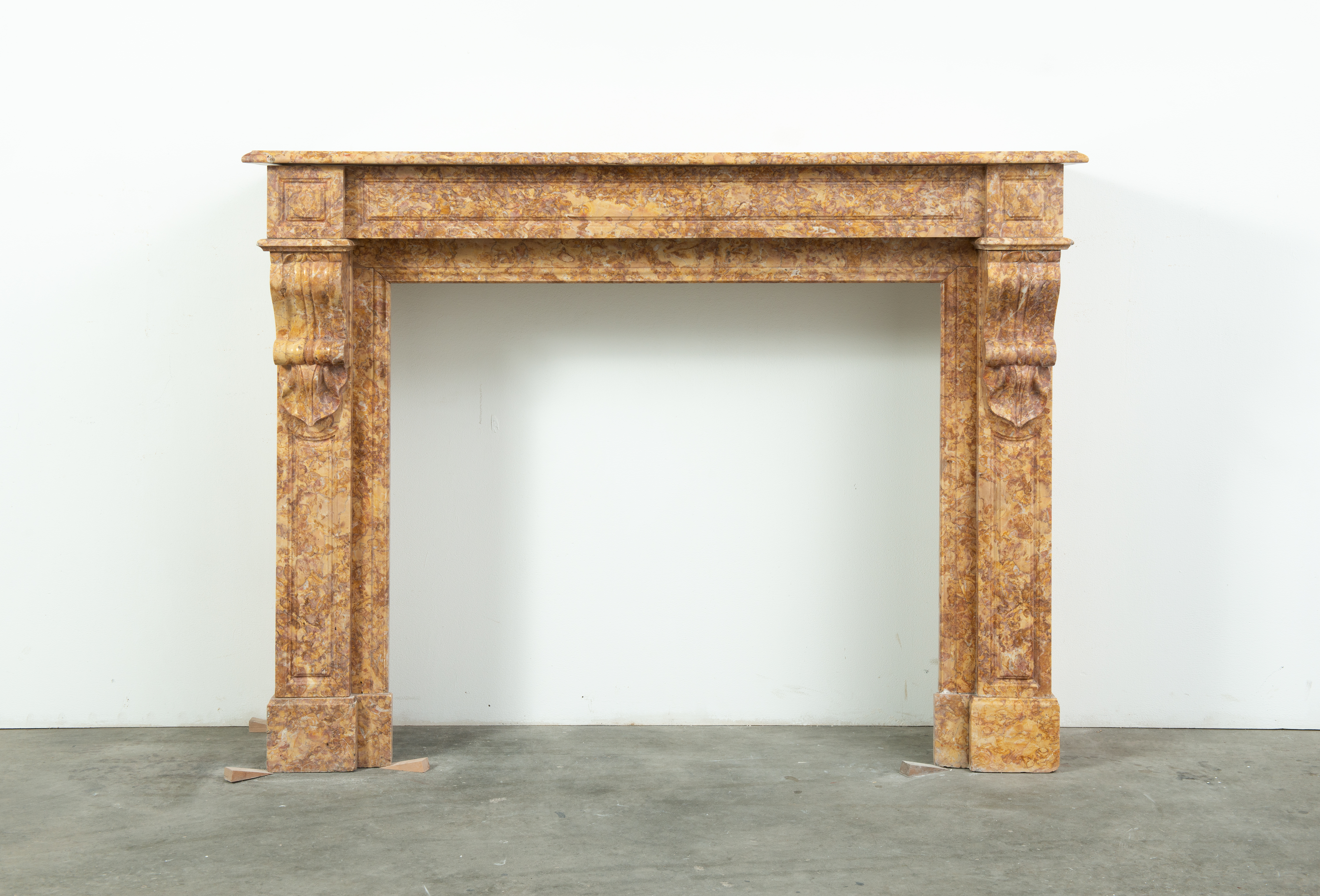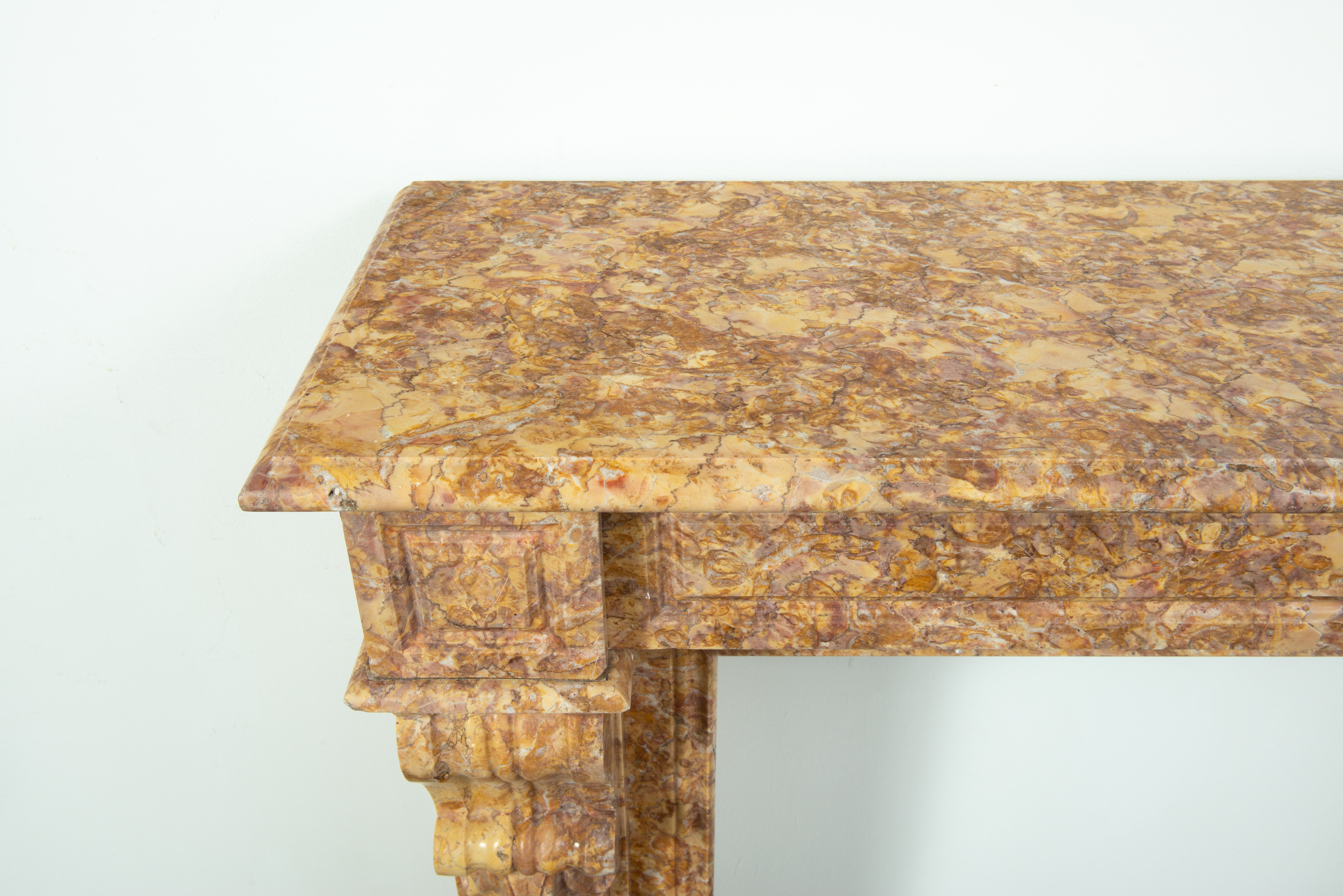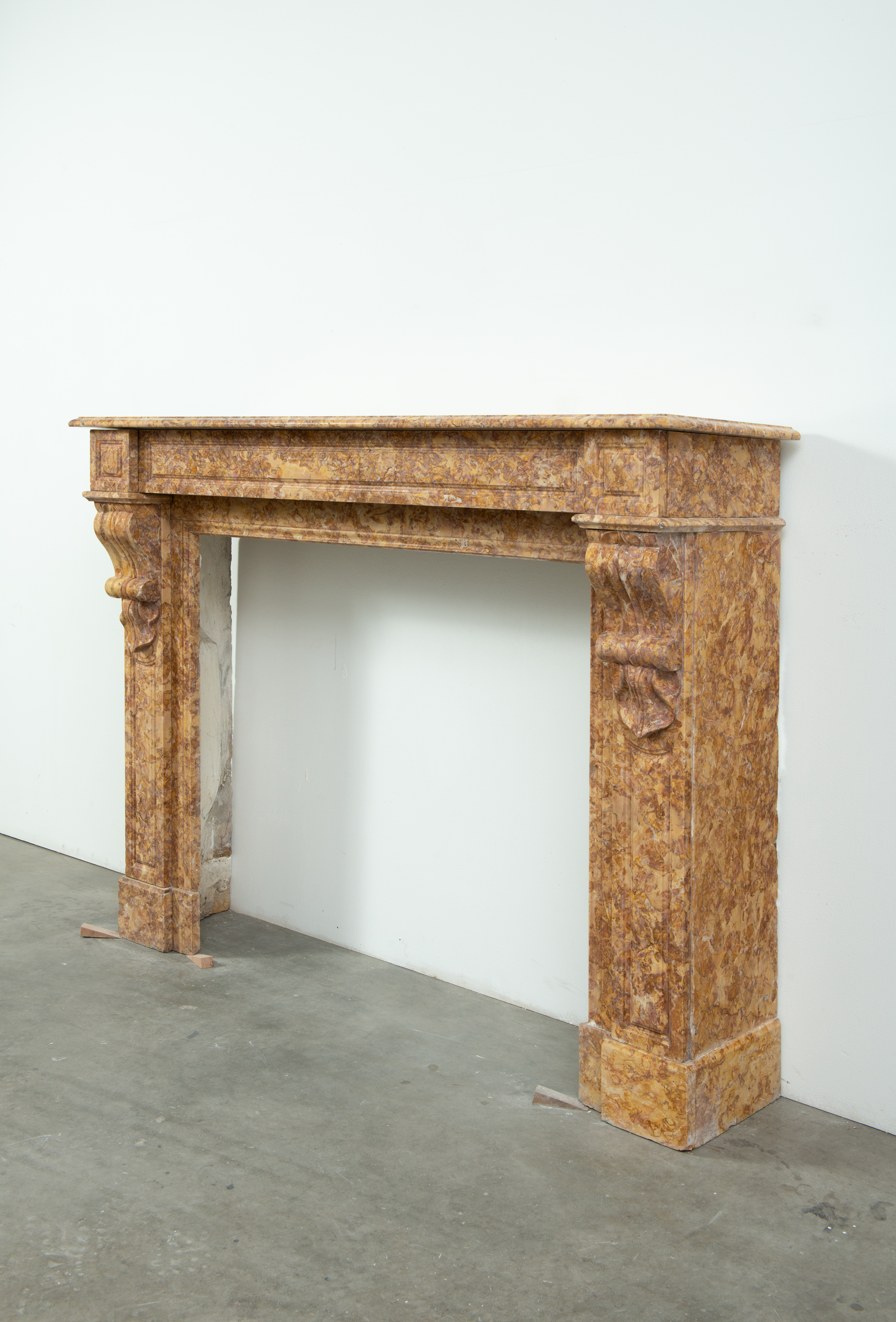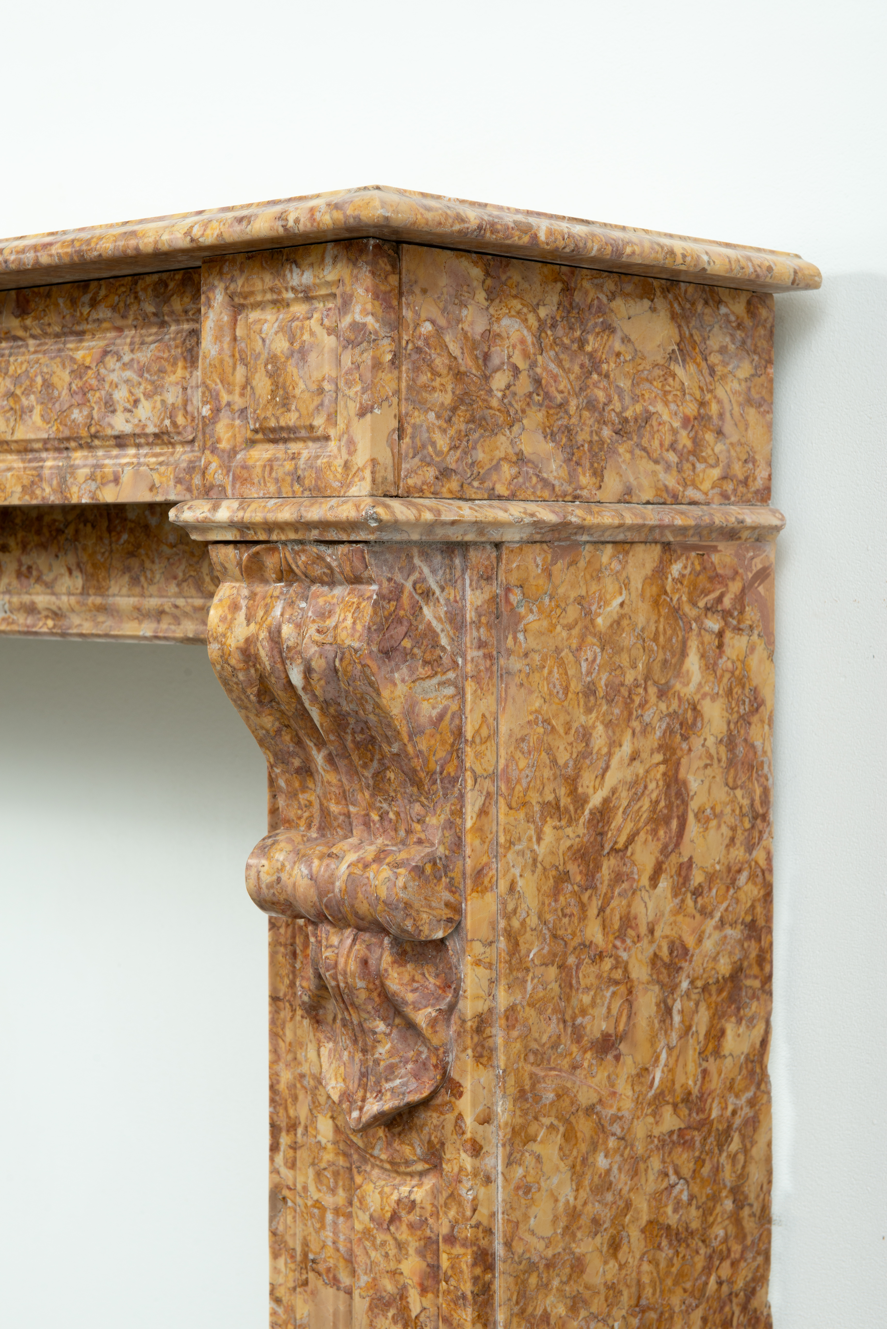 Deze schouw is vervaardigd uit een decoratieve brocatelle marmer met een zachte gele kleur. De vormgeving met de consoles onder het dekblad is kenmerkend voor Louis Philippe-stijl, zoals die in Frankrijk in de 19e eeuw werd toegepast. Onder de consoles een schelpmotief als extra detail. Elegante profileringen op het dekblad, boven de consoles en rondom het stookgat geven elegantie aan deze brocatelle console schouw. Het front en de stijlen hebben panelering gekregen om meer diepte toe te voegen aan het oppervlak.