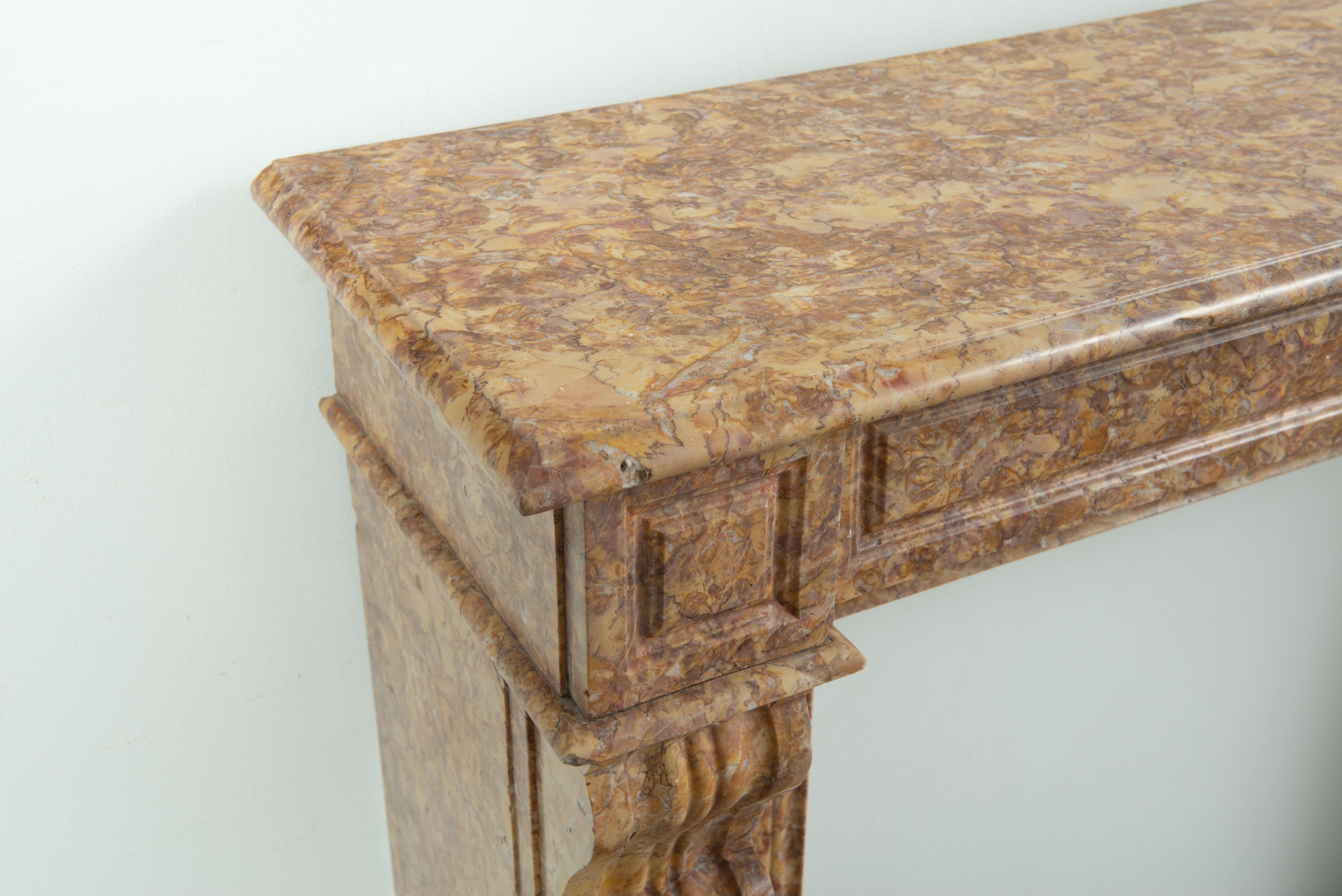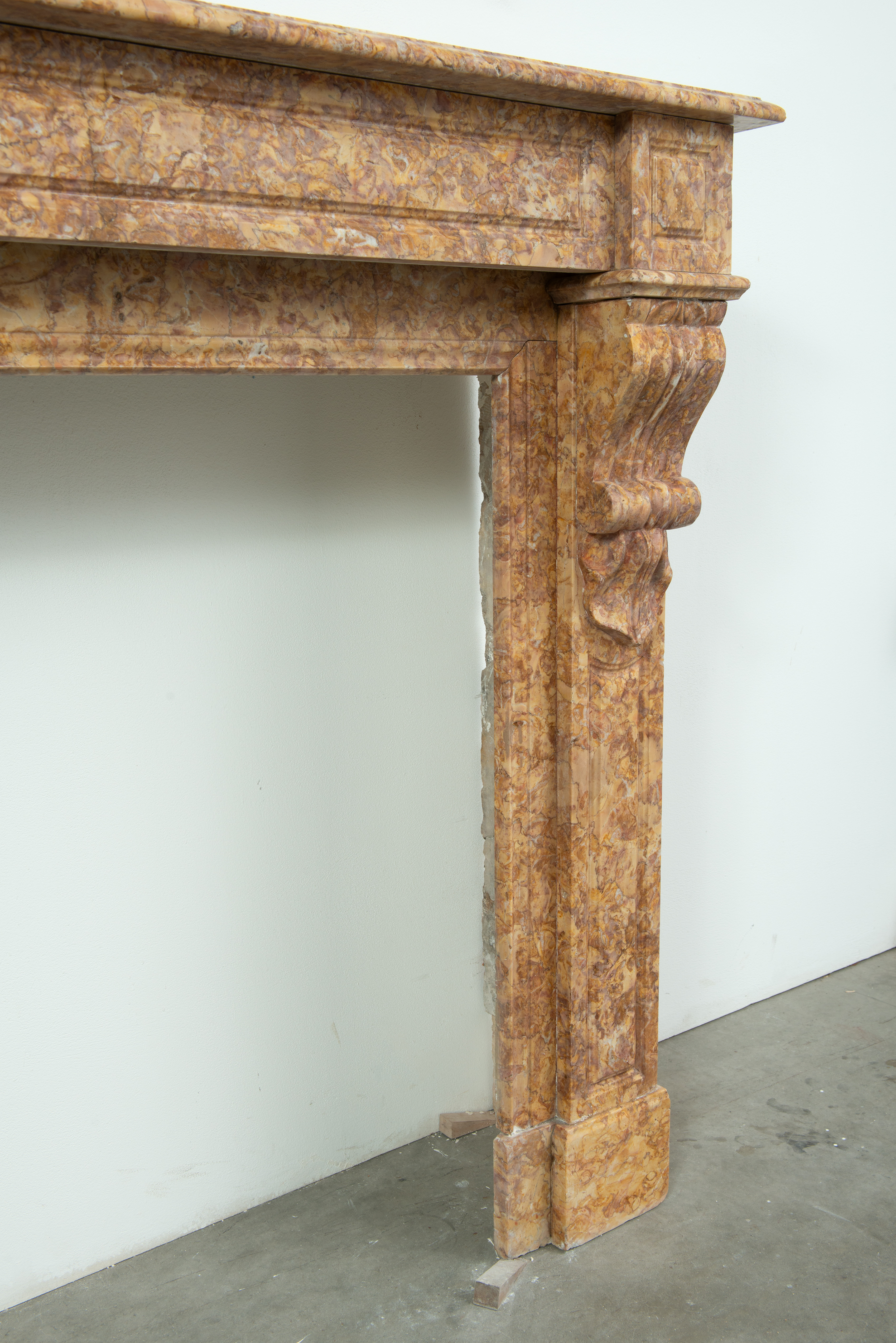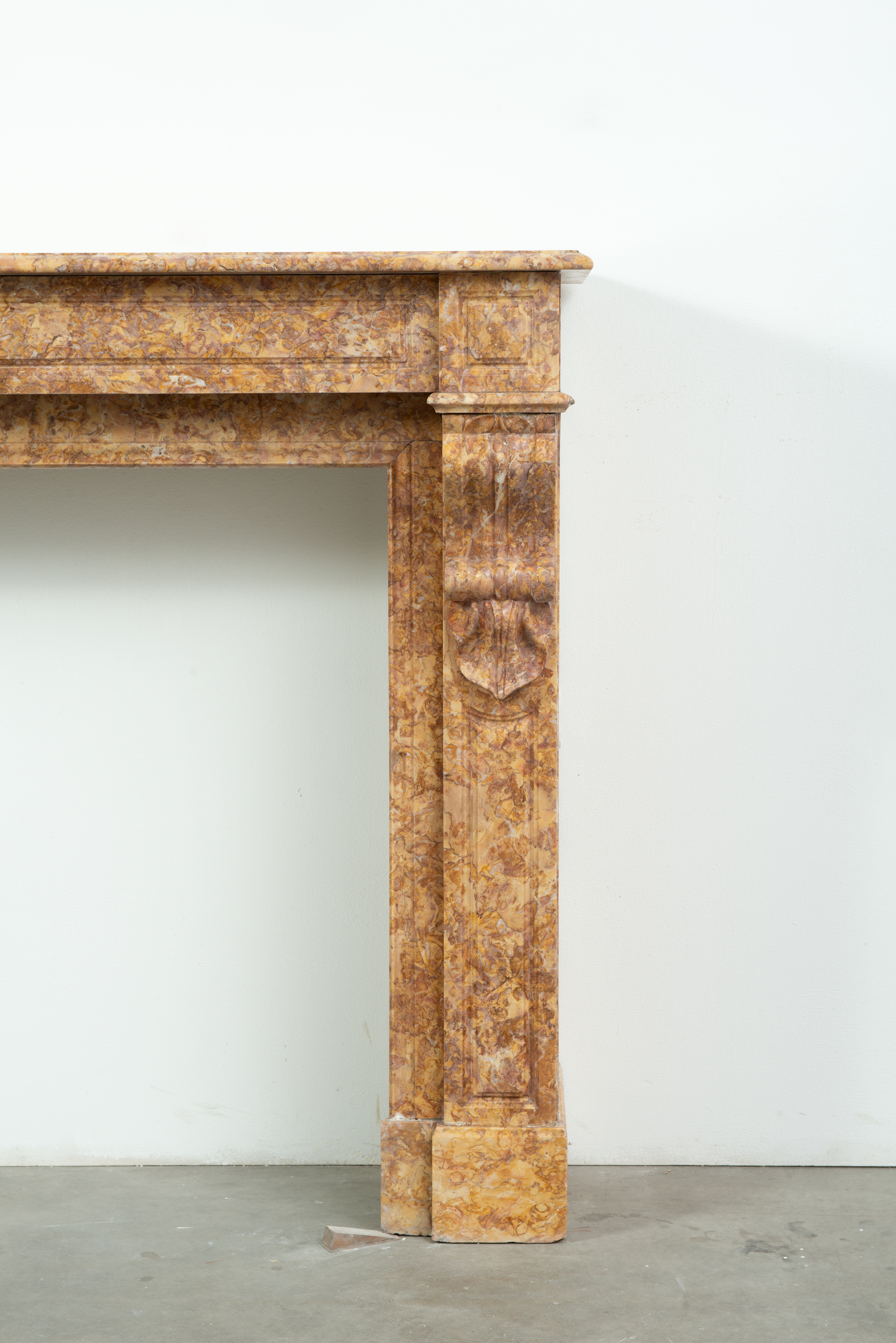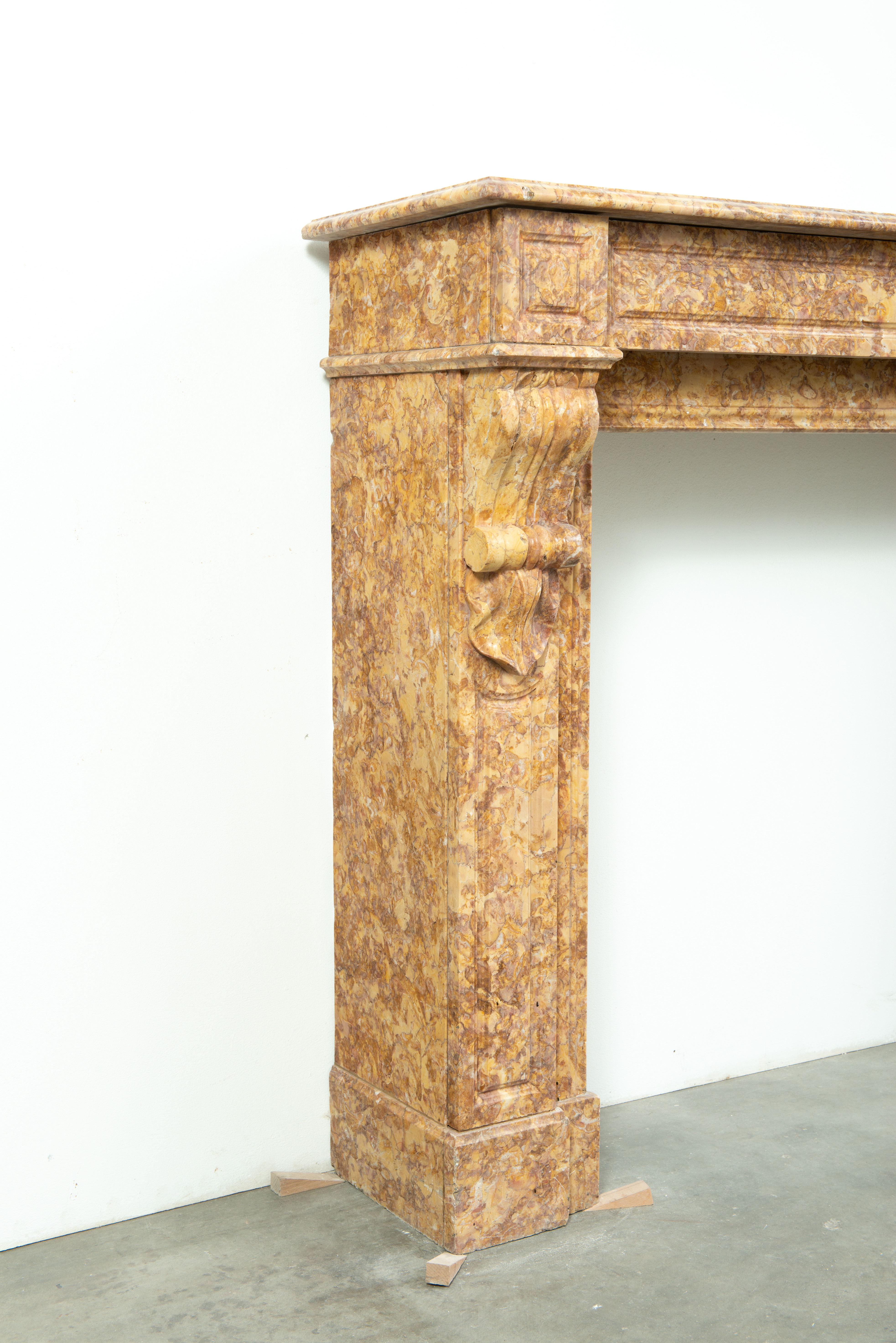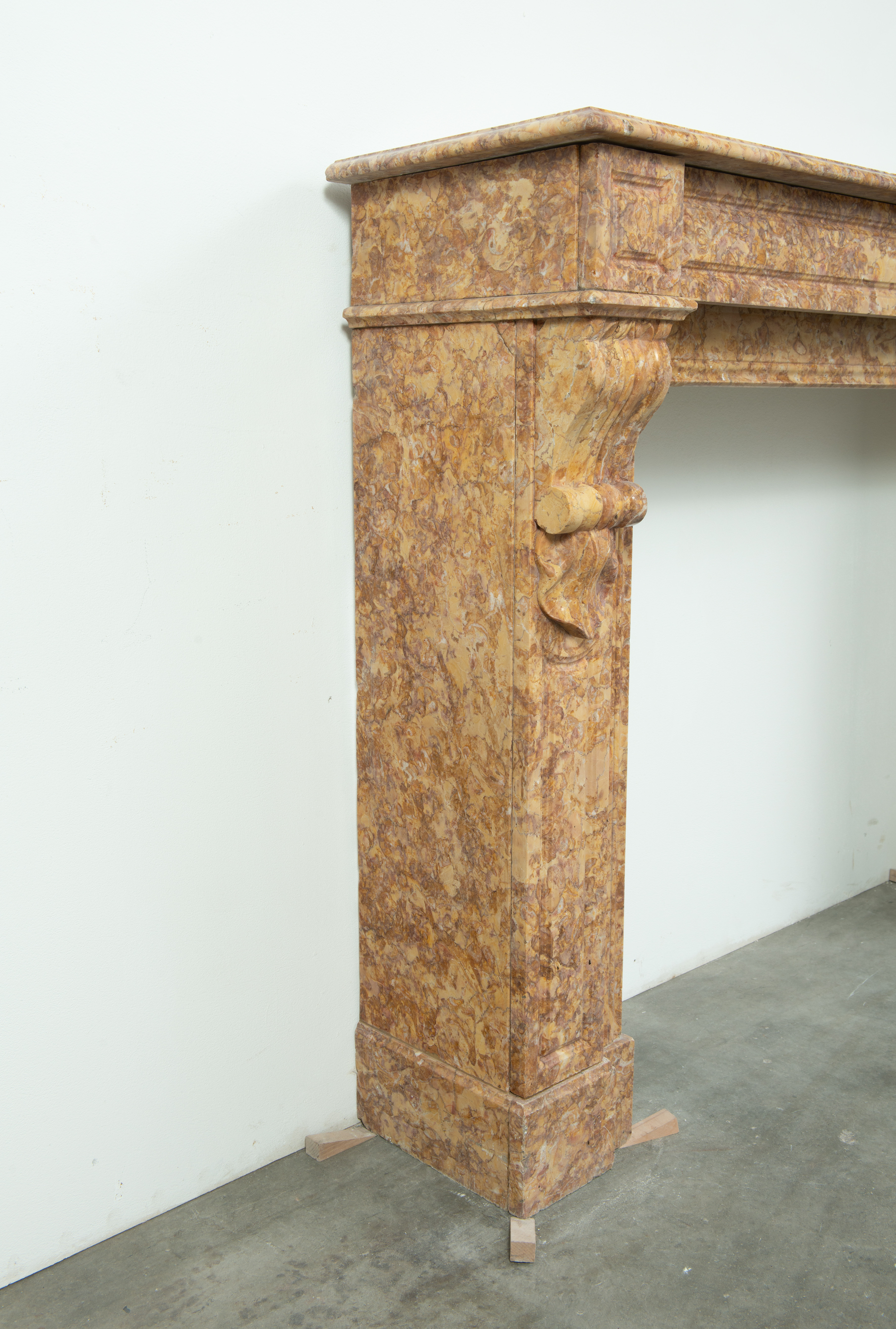 Deze schouw is vervaardigd uit een decoratieve brocatelle marmer met een zachte gele kleur. De vormgeving met de consoles onder het dekblad is kenmerkend voor Louis Philippe-stijl, zoals die in Frankrijk in de 19e eeuw werd toegepast. Onder de consoles een schelpmotief als extra detail. Elegante profileringen op het dekblad, boven de consoles en rondom het stookgat geven elegantie aan deze brocatelle console schouw. Het front en de stijlen hebben panelering gekregen om meer diepte toe te voegen aan het oppervlak.