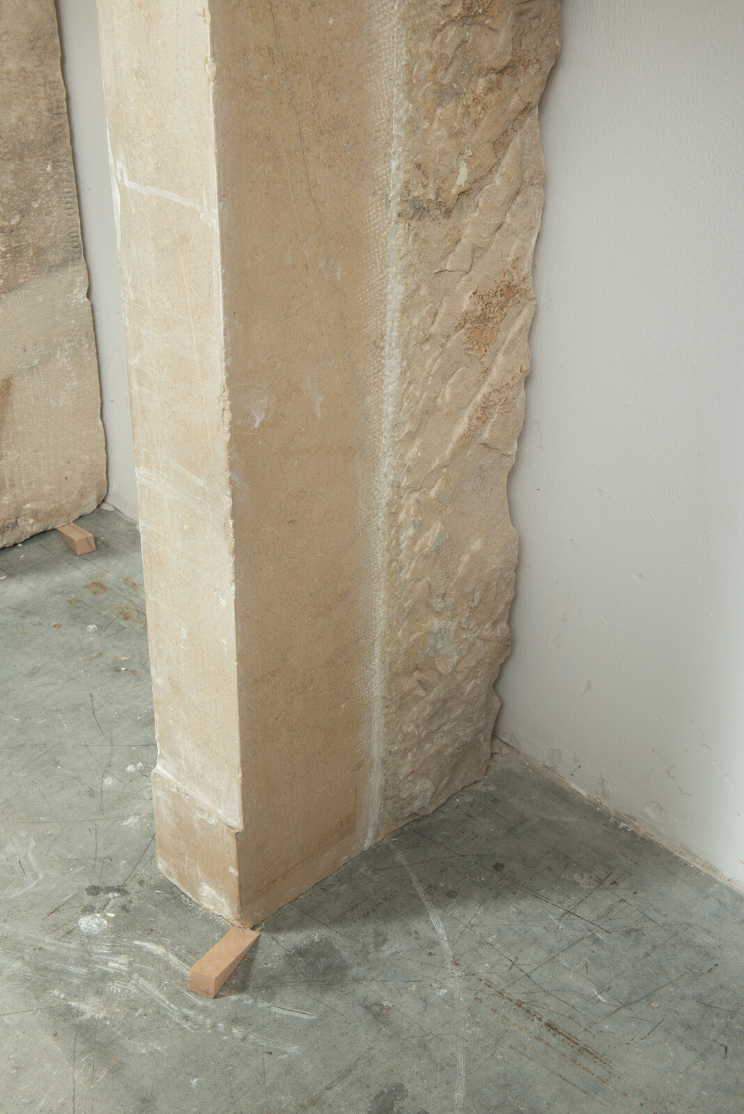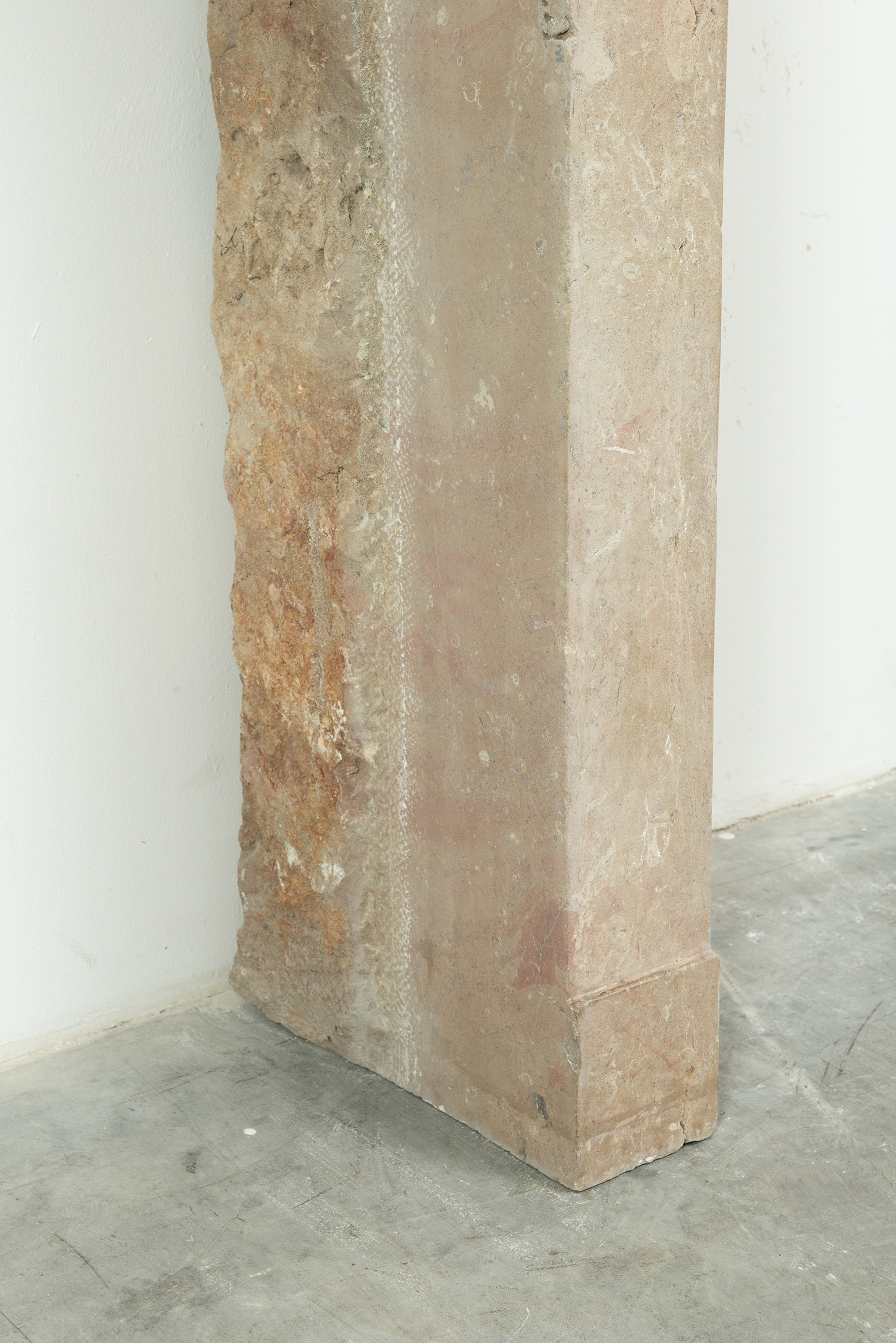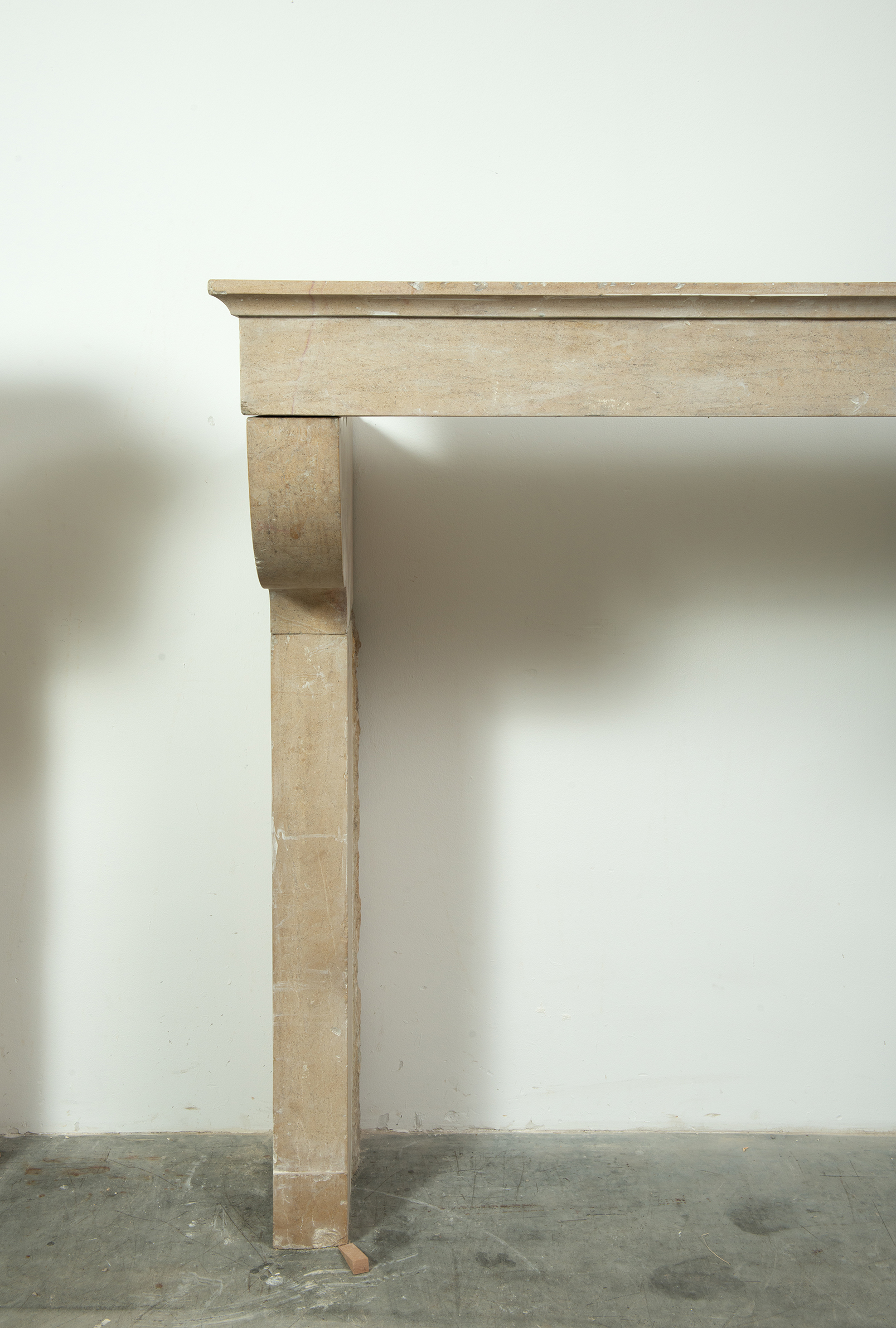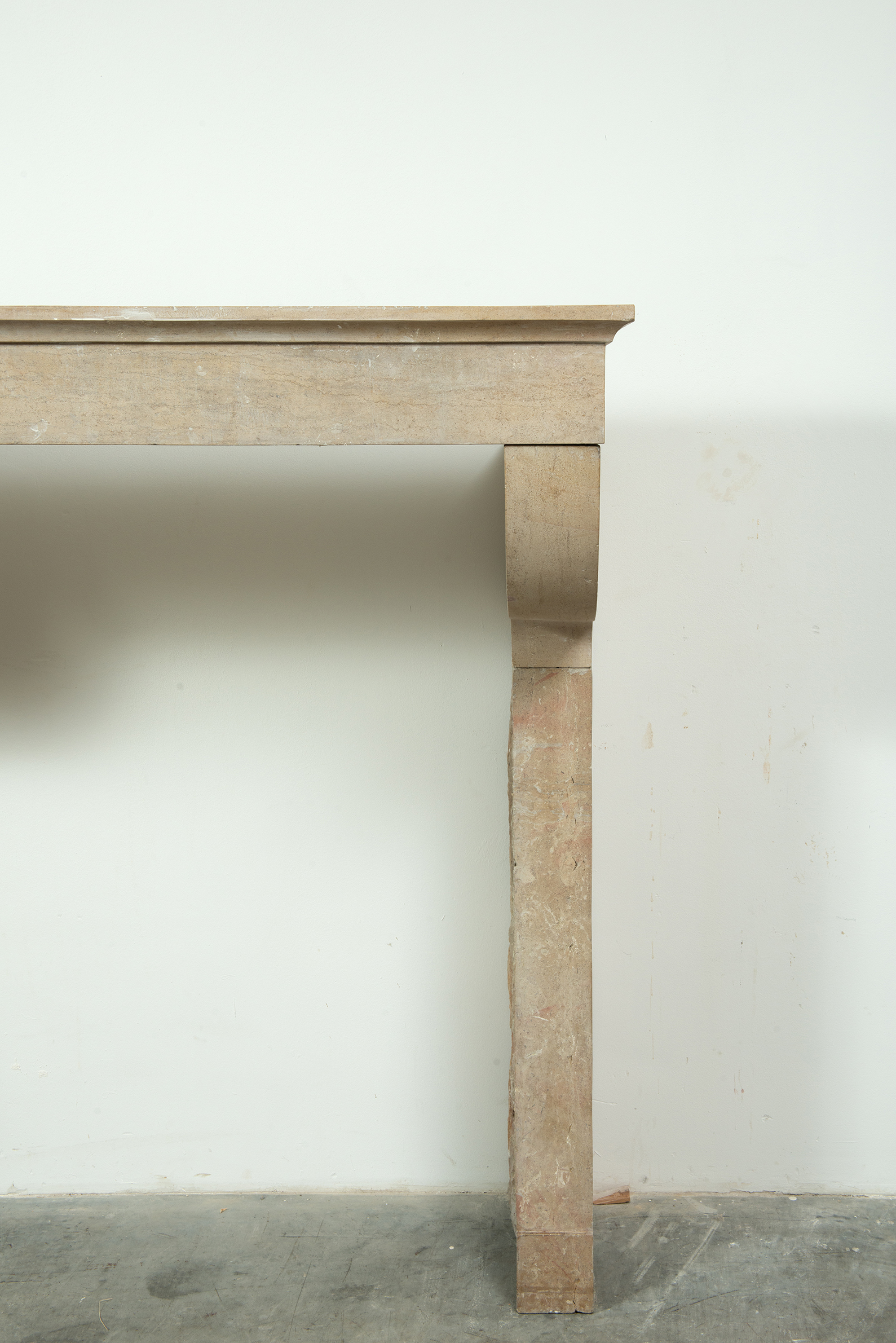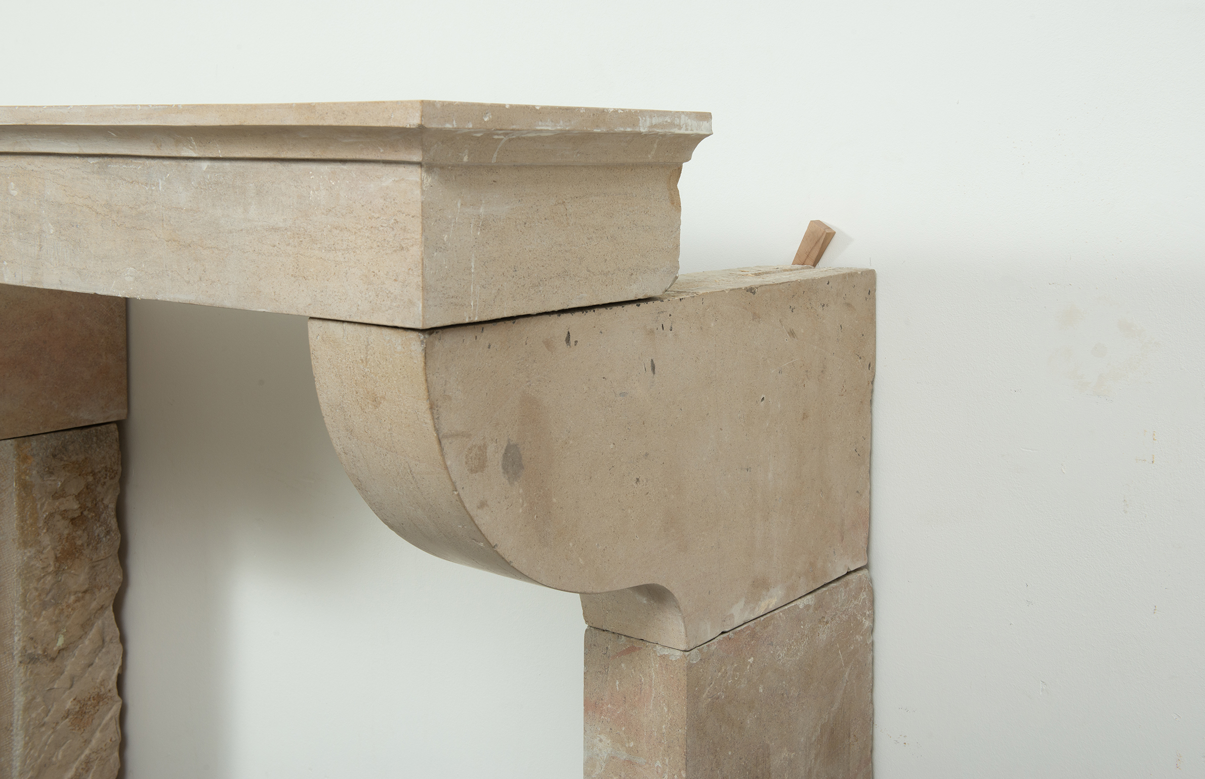 Door de ronde consoles steekt het front uit voor de stijlen, wat de schouw diepte geeft. Het dekblad van de schouw heeft een krachtig profiel. In de stijlen is een plint gehakt. Door de kalksteen te polijsten heeft het geheel een meer verfijnde uitstraling gekregen. Deze gladde kalkstenen console schouw vormt een fraai Frans element in een herenhuis of landhuis.