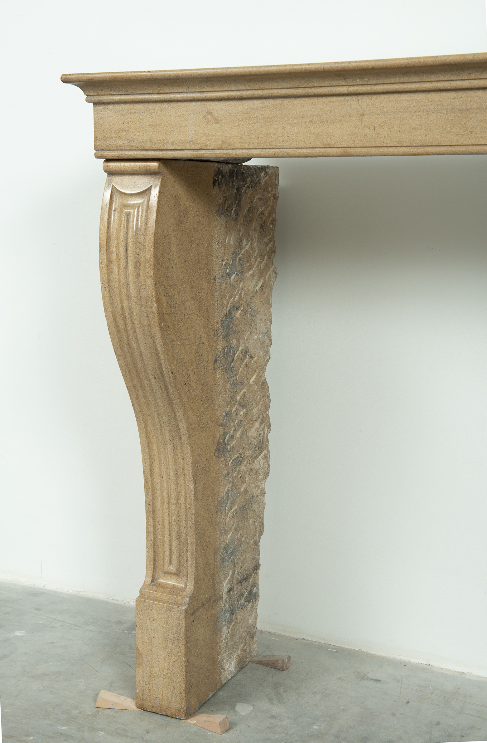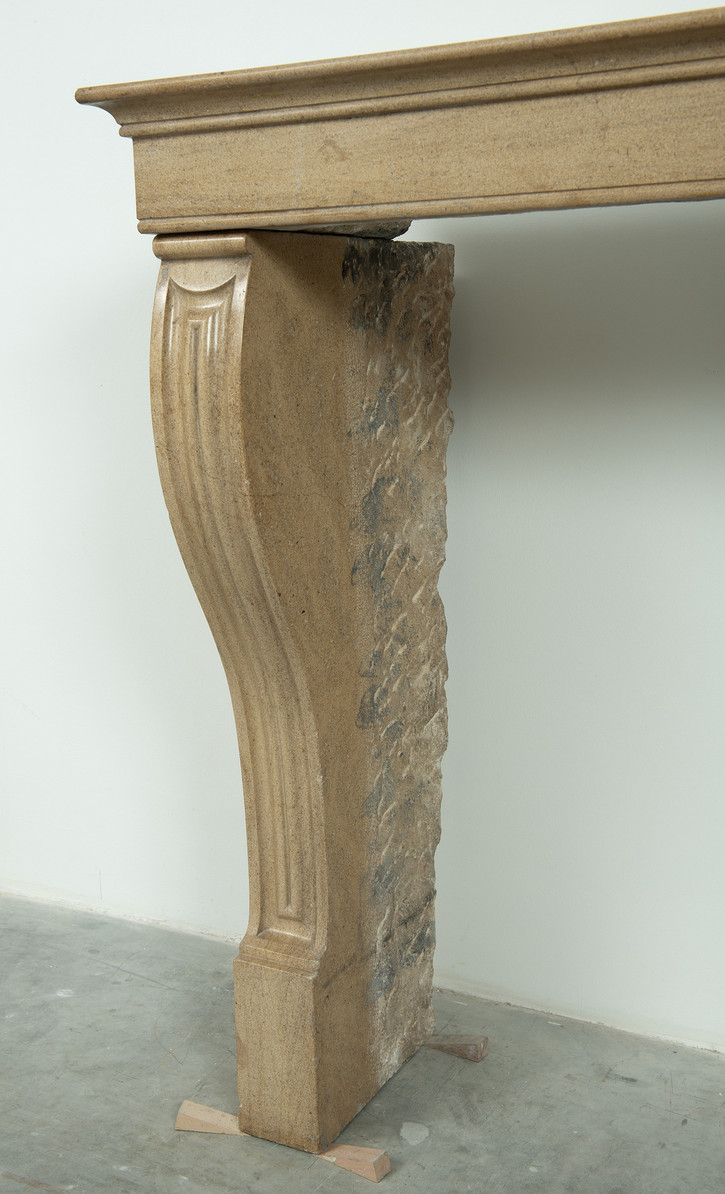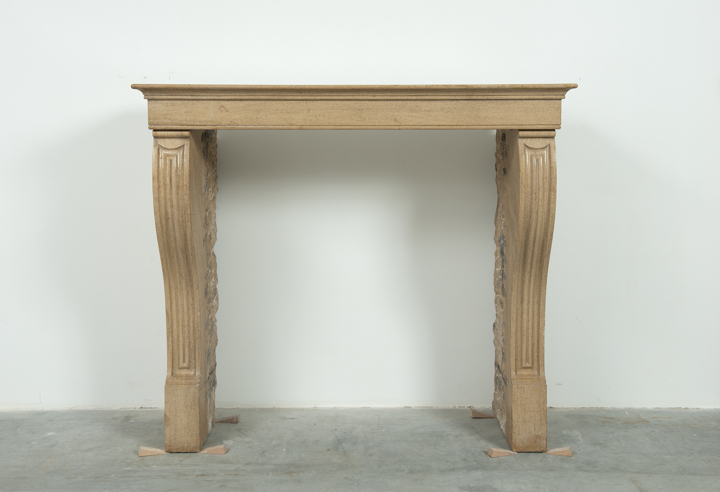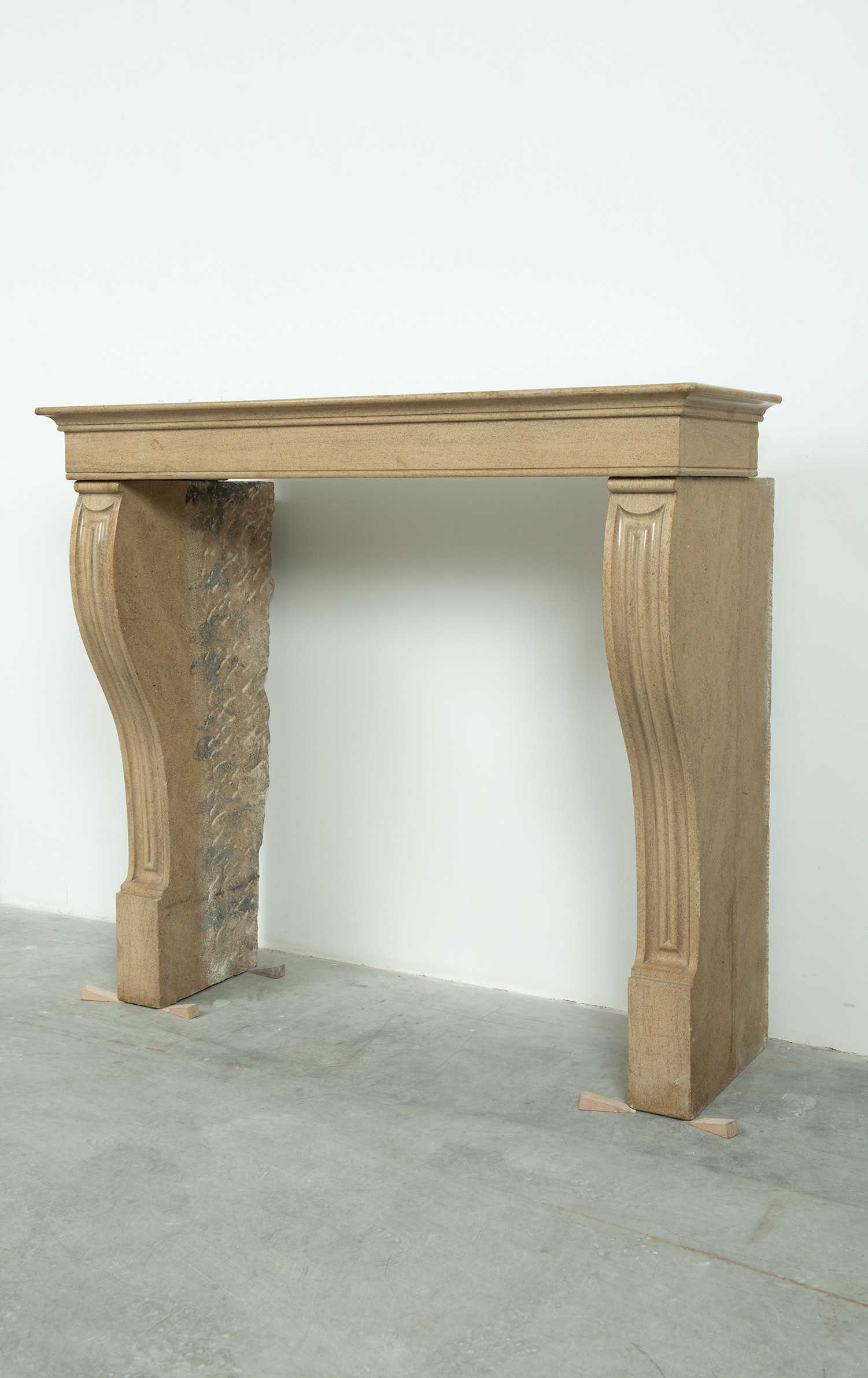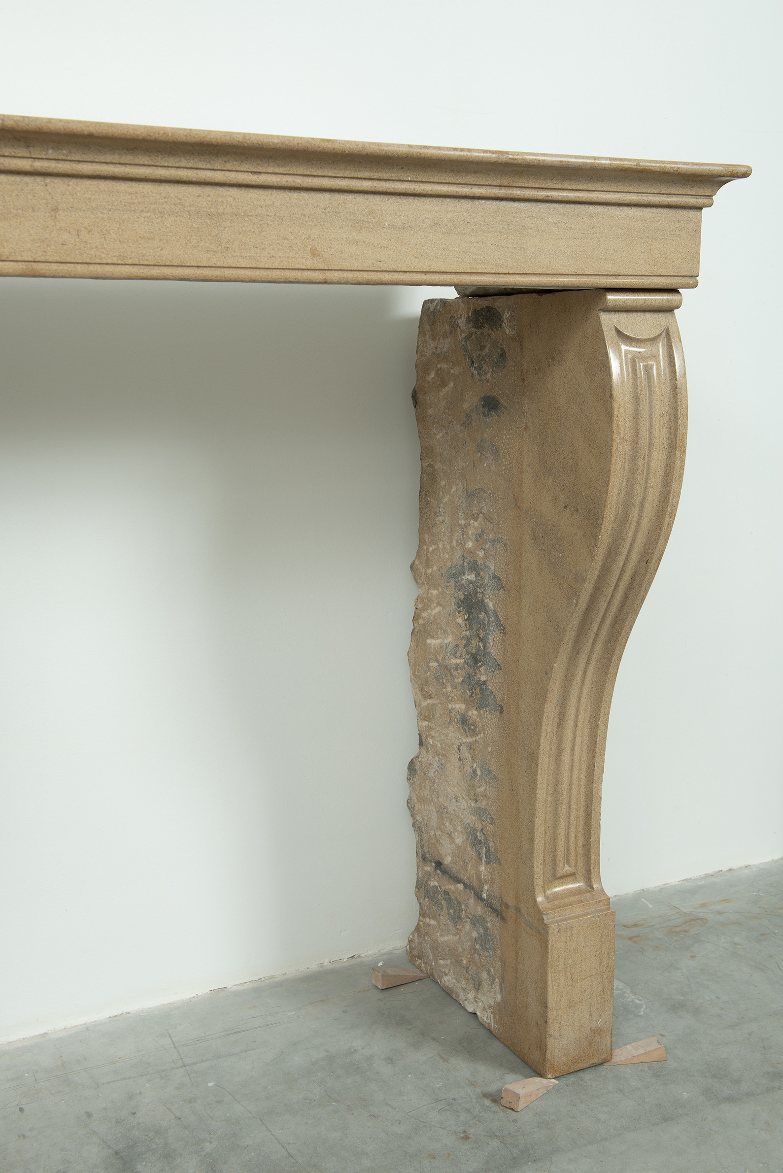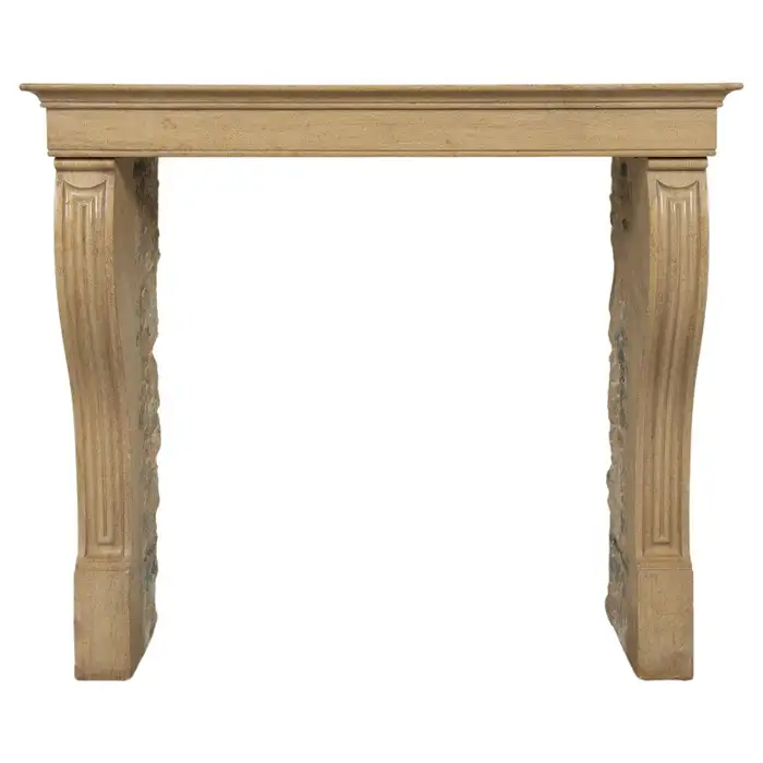 Het front van deze kalkstenen schouw ligt op stijlen met grote, geprofileerde consoles. In deze schouw komen verfijnde Franse vormgeving en een rustiek materiaal samen. Klein formaat schouw.