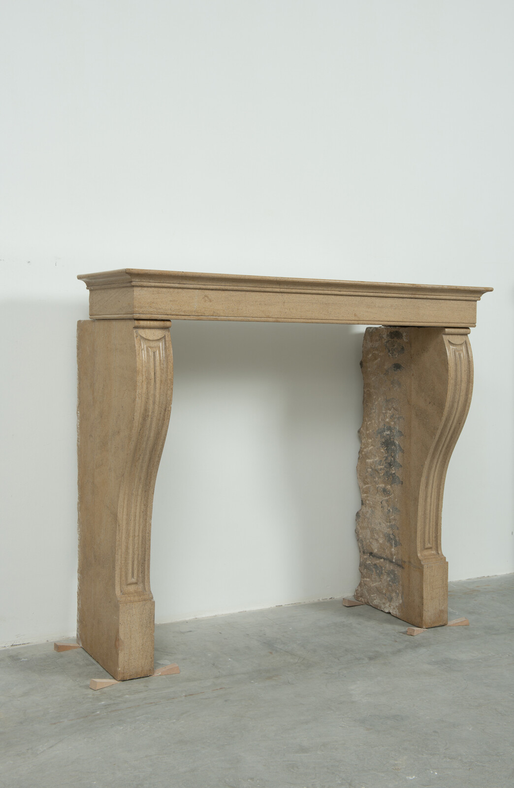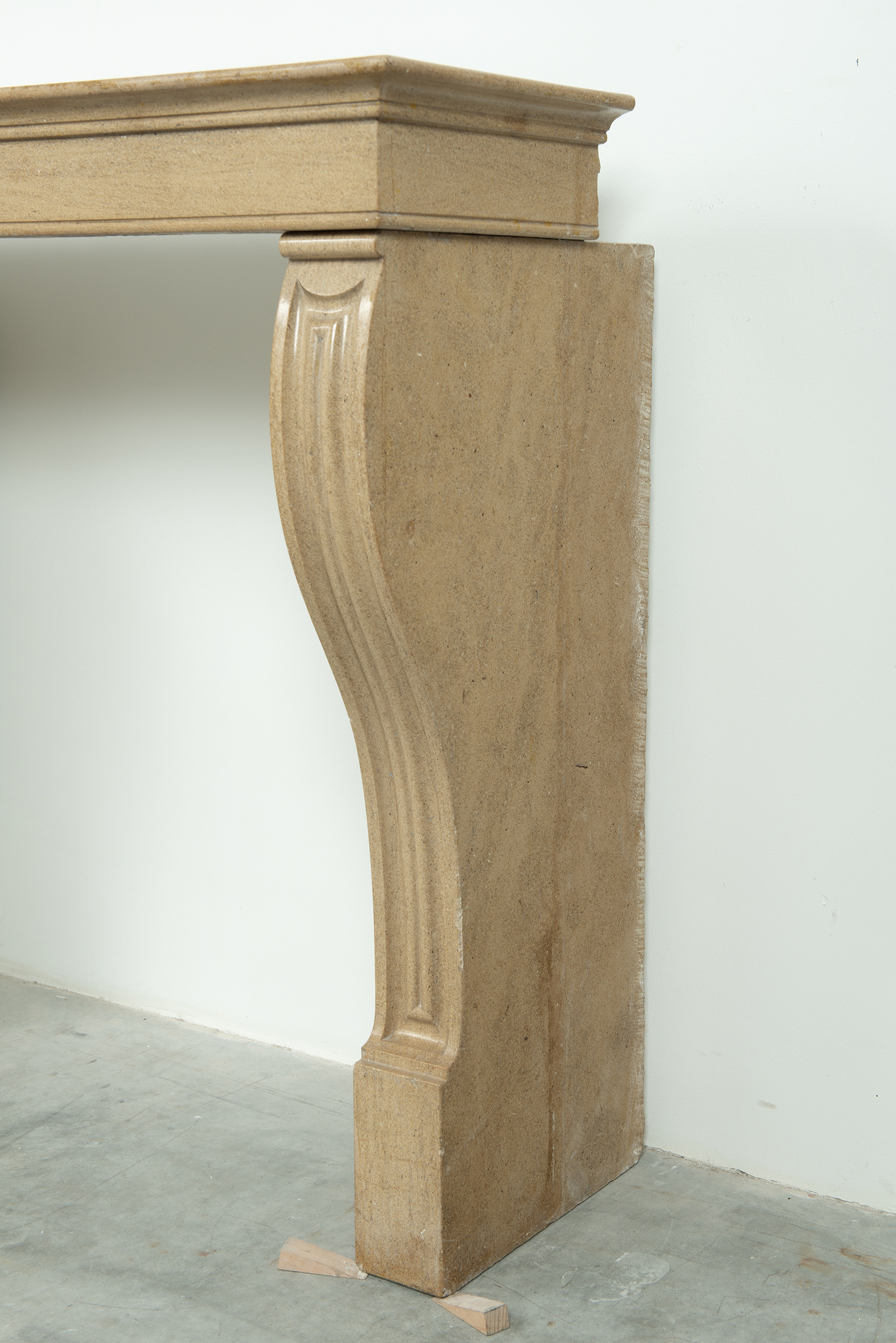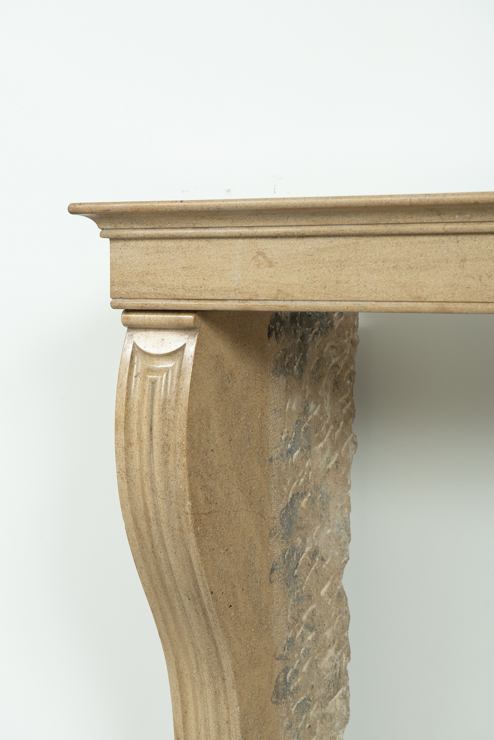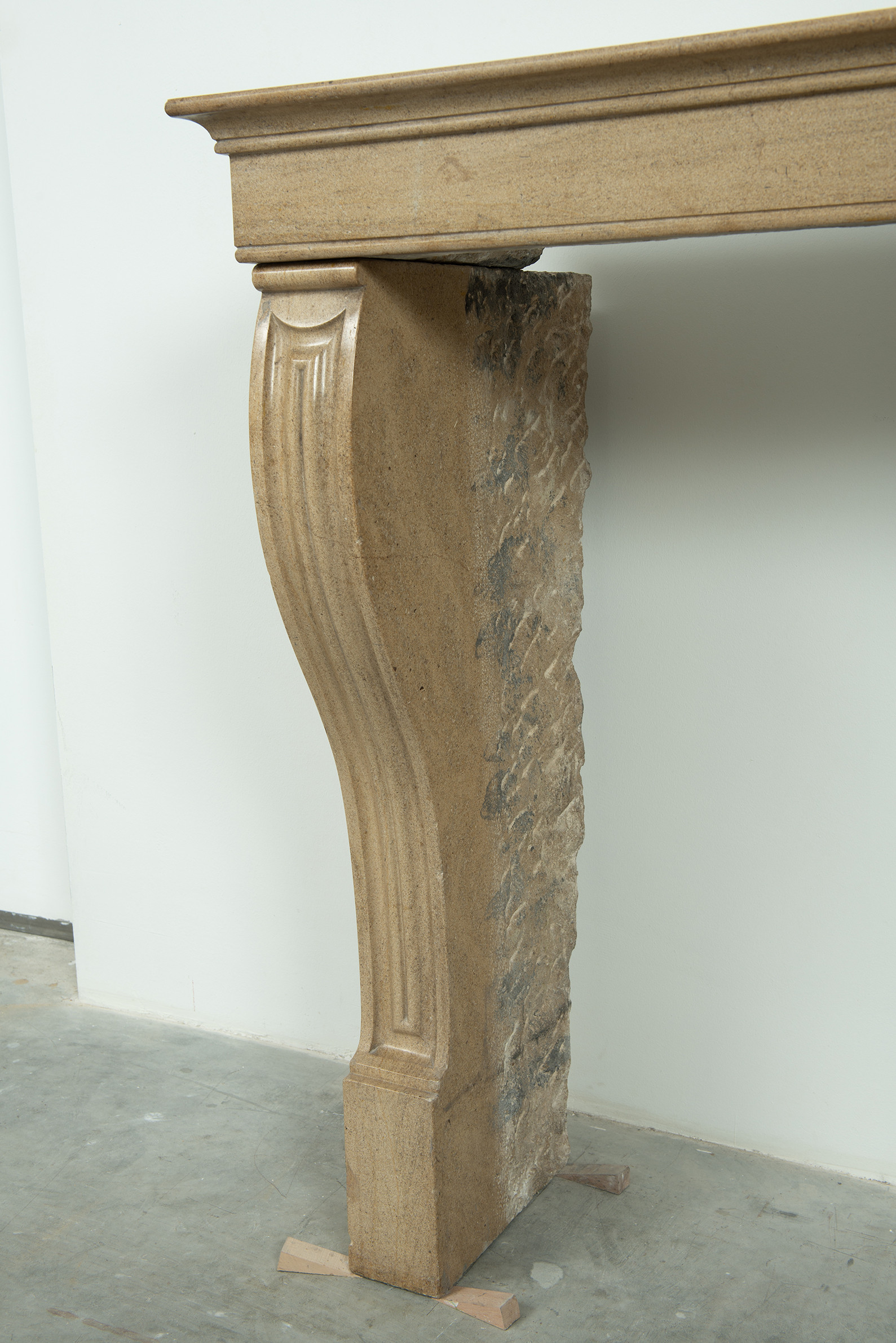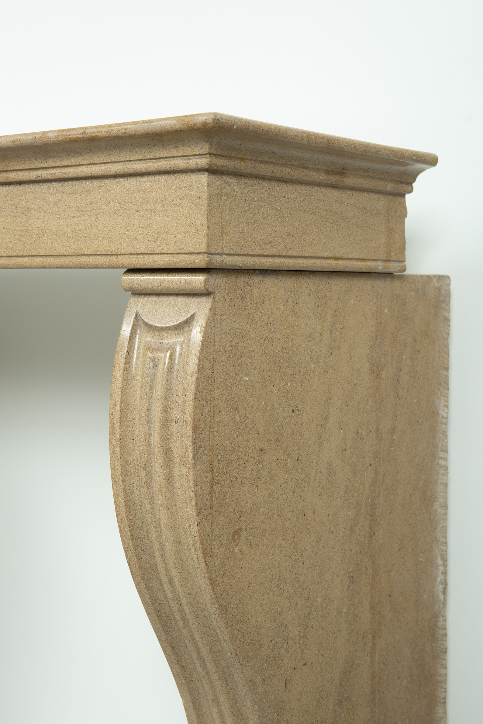 Het front van deze kalkstenen schouw ligt op stijlen met grote, geprofileerde consoles. In deze schouw komen verfijnde Franse vormgeving en een rustiek materiaal samen. Klein formaat schouw.