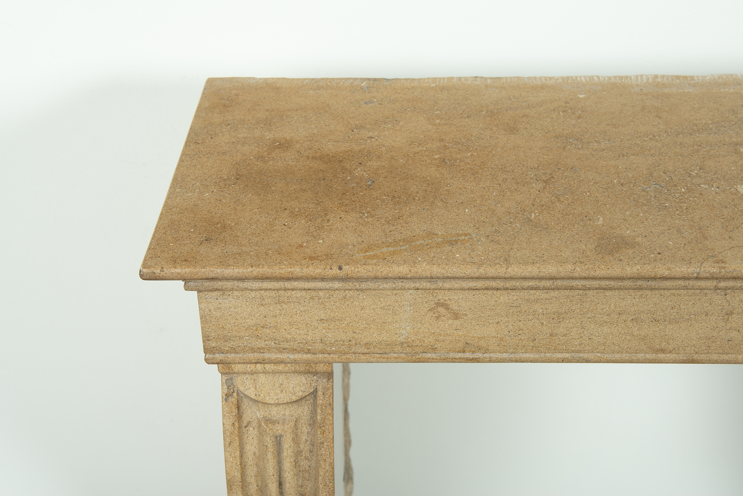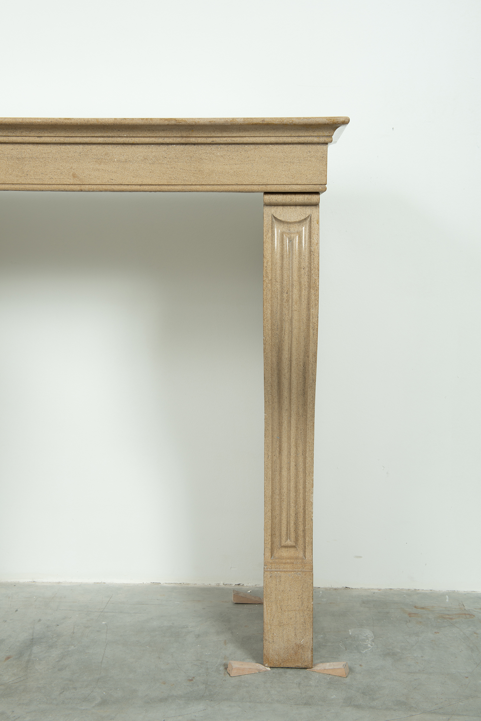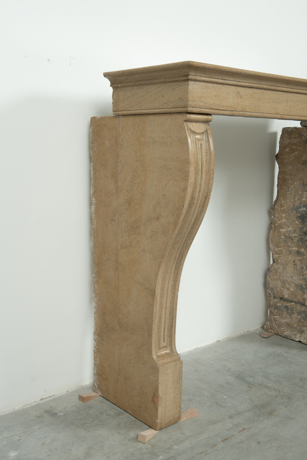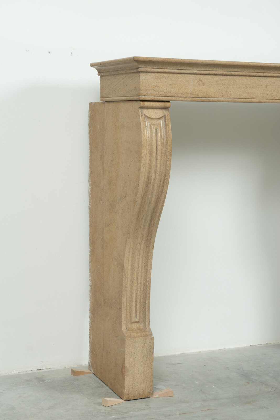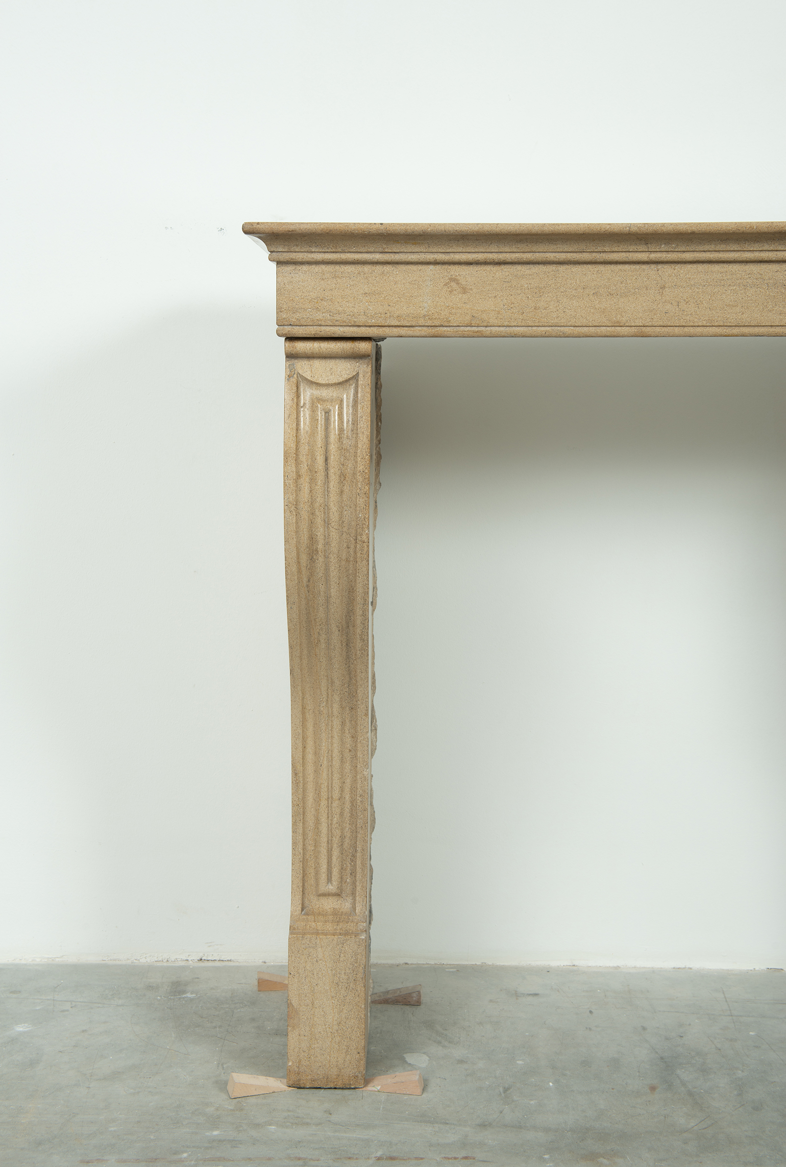 Het front van deze kalkstenen schouw ligt op stijlen met grote, geprofileerde consoles. In deze schouw komen verfijnde Franse vormgeving en een rustiek materiaal samen. Klein formaat schouw.
