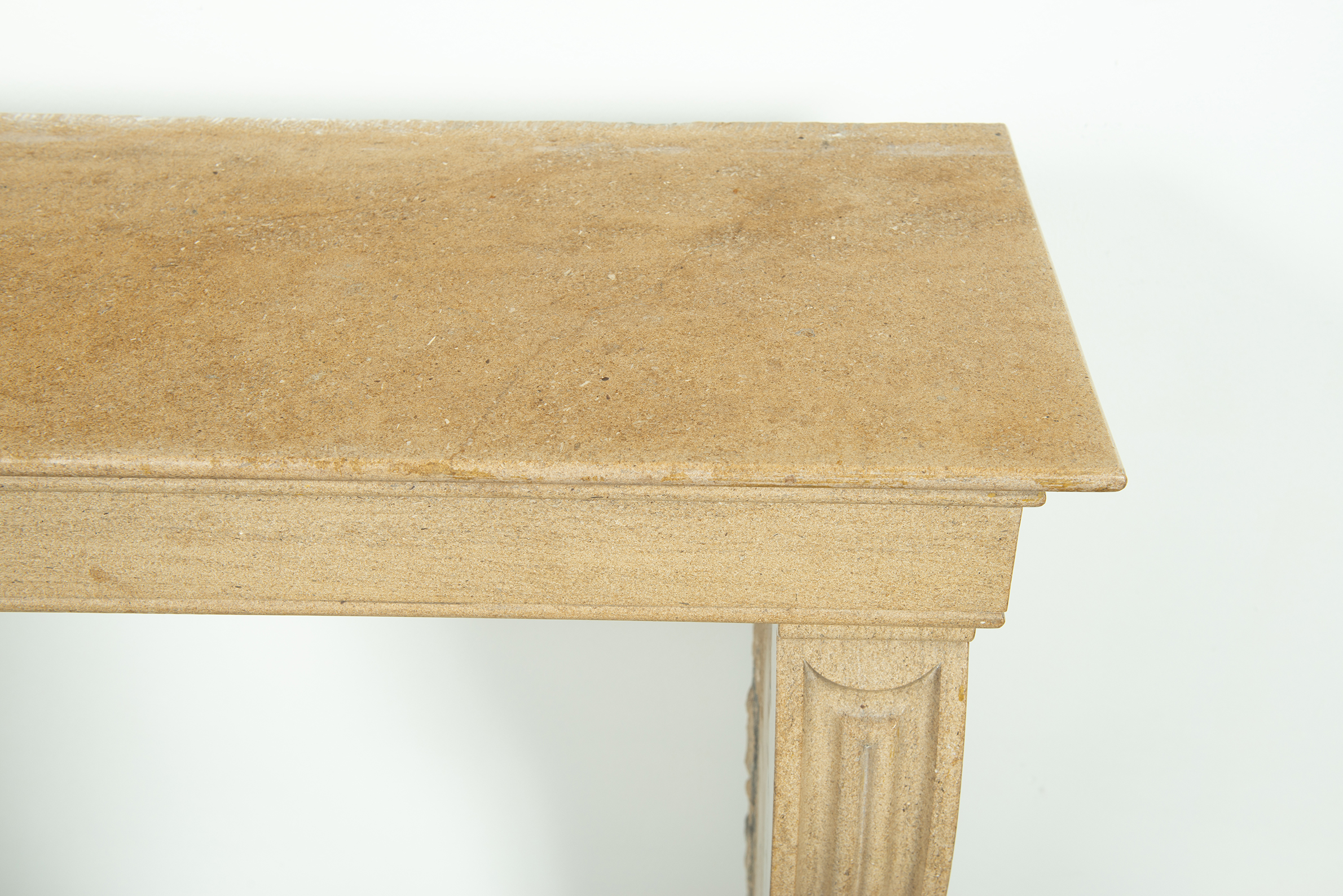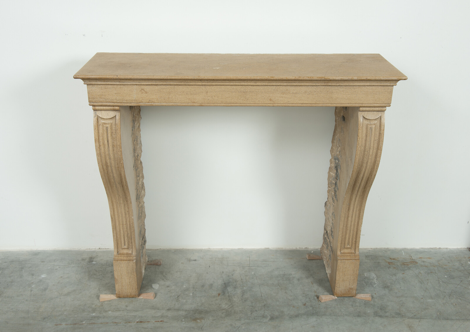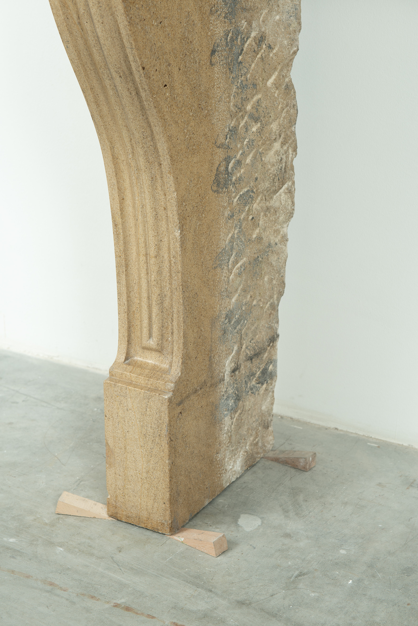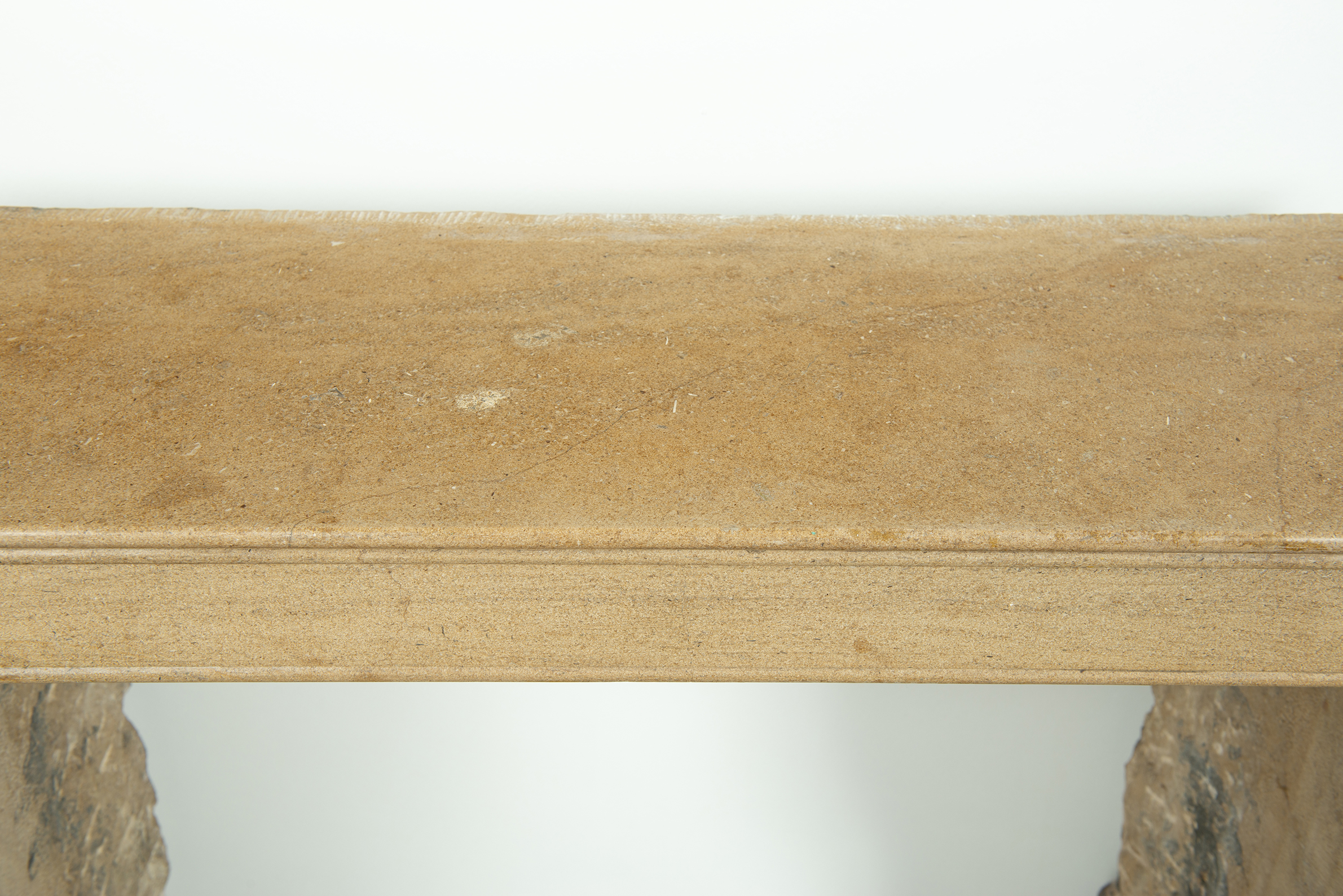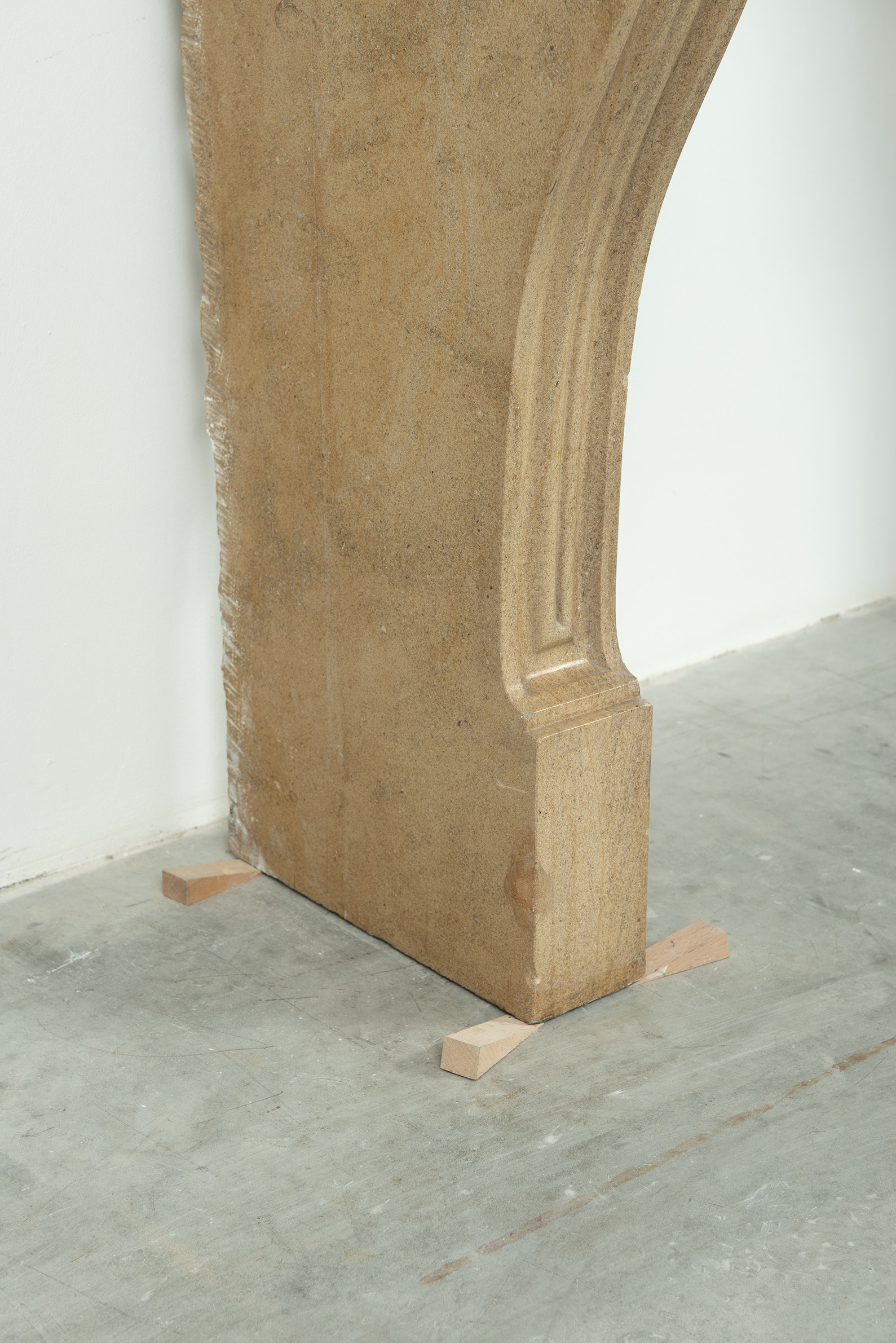 Het front van deze kalkstenen schouw ligt op stijlen met grote, geprofileerde consoles. In deze schouw komen verfijnde Franse vormgeving en een rustiek materiaal samen. Klein formaat schouw.