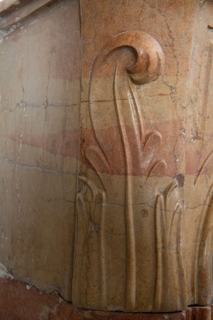 Het massieve front heeft een mooie geprofileerde bovenkant met daaronder een prachtige schelp met daarnaast meelopende panelen en blad versieringen op de zijkanten die op stijlen met panelen rusten en waar de bladeren boven de neut ook weer terug komen.