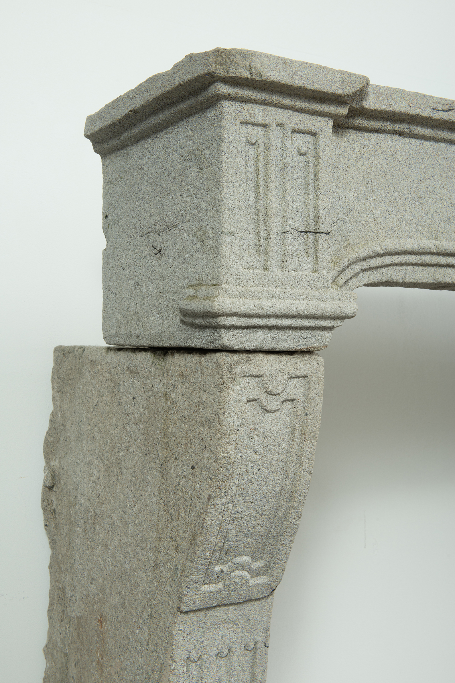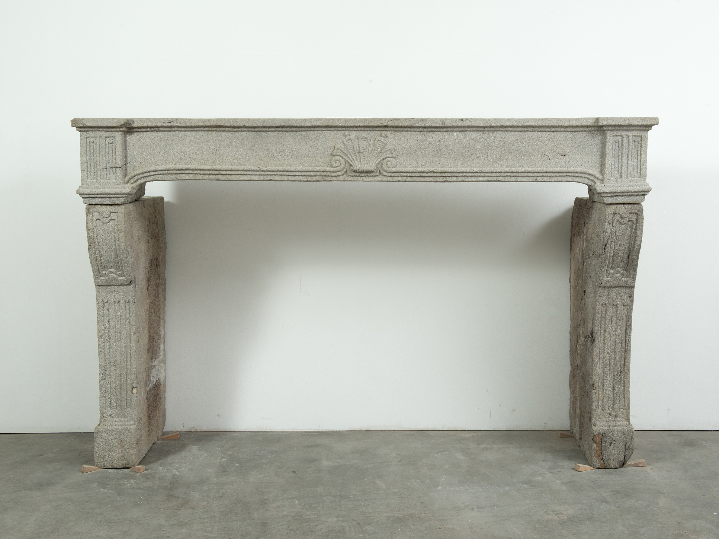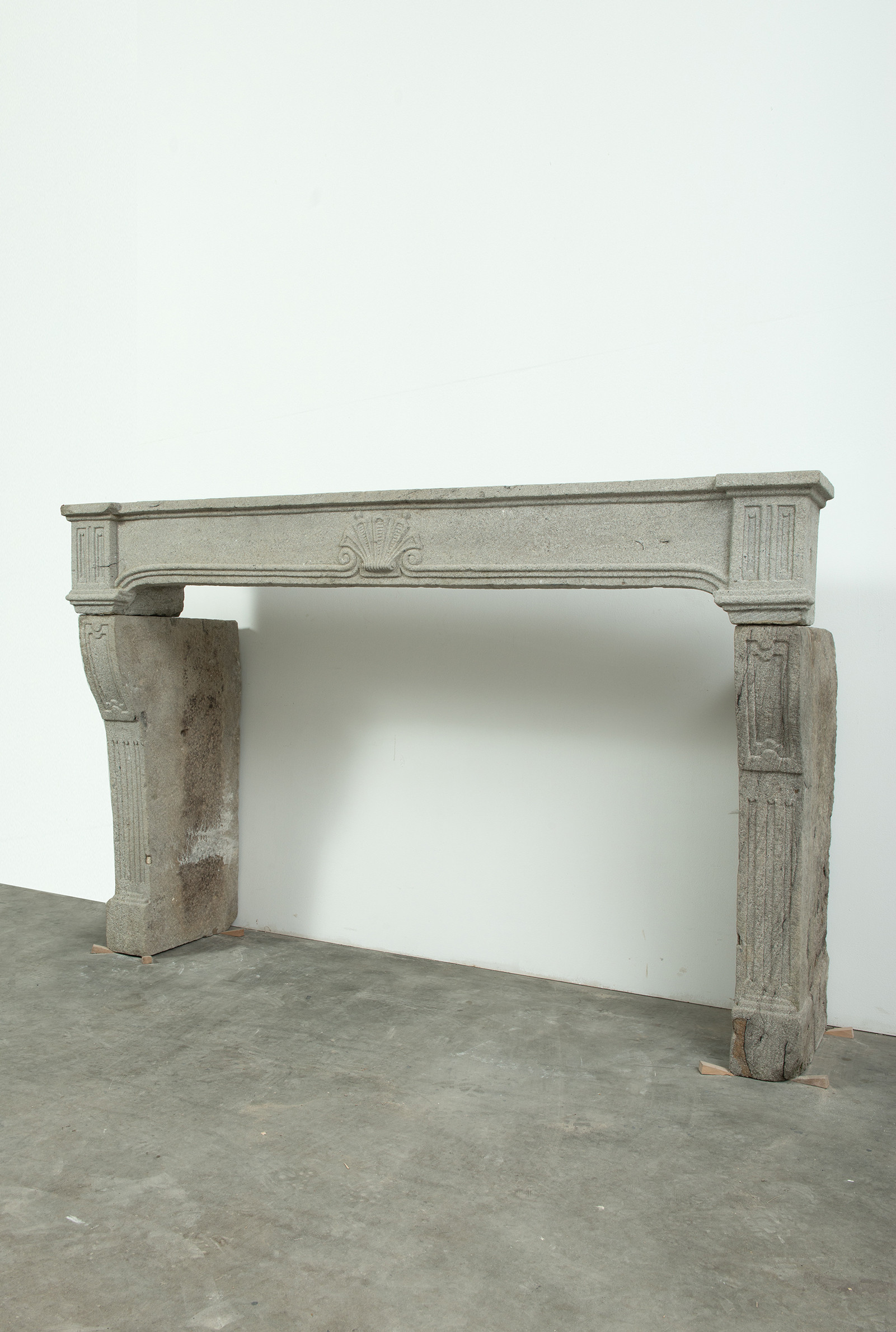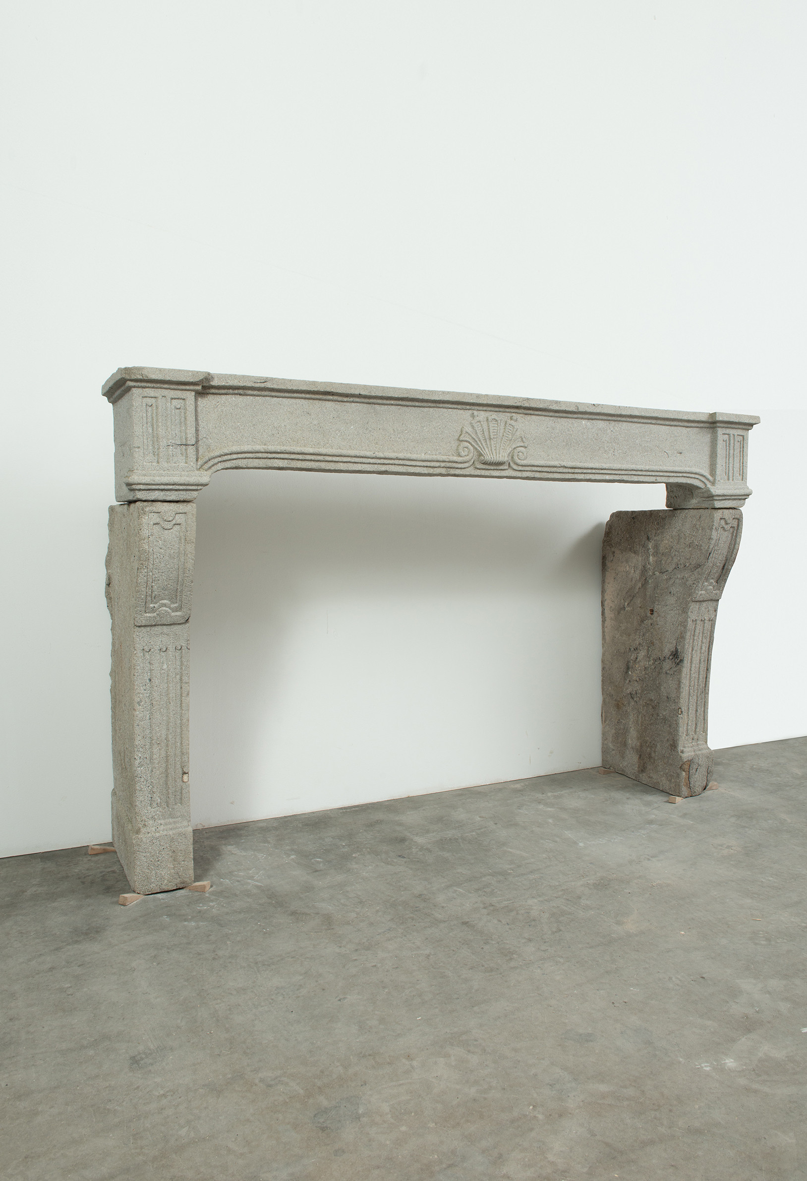 Het grove lavasteen geeft deze schouw een stoere uitstraling, de Louis XIV ornamentiek voegt verfijning toe. In het front is een schelp aangebracht. Aan de onder- en bovenkant is het front geprofileerd. De stijlen hebben de vorm van een console, onder de bolling zijn drie cannelures aangebracht.