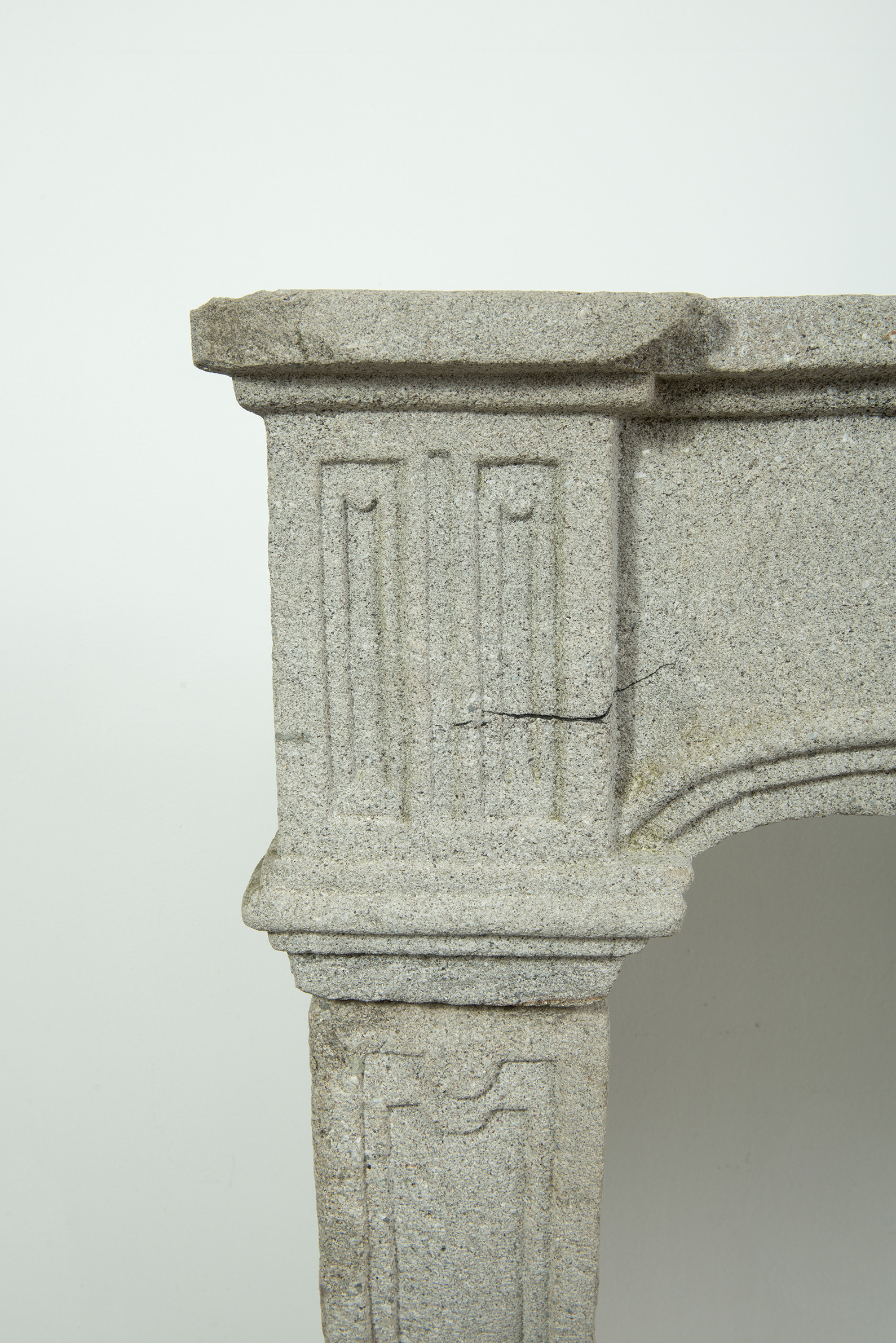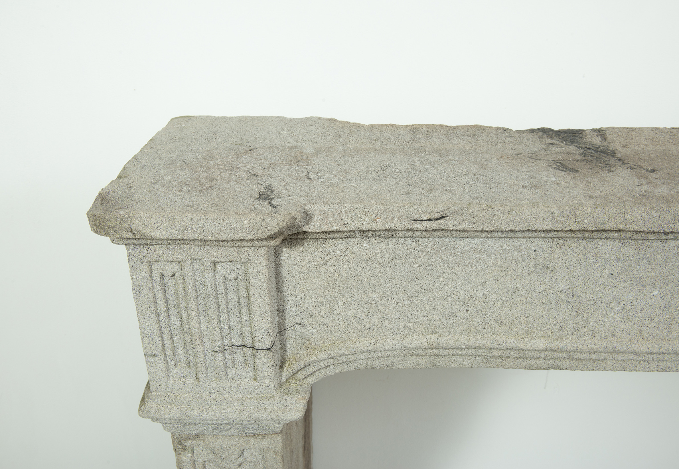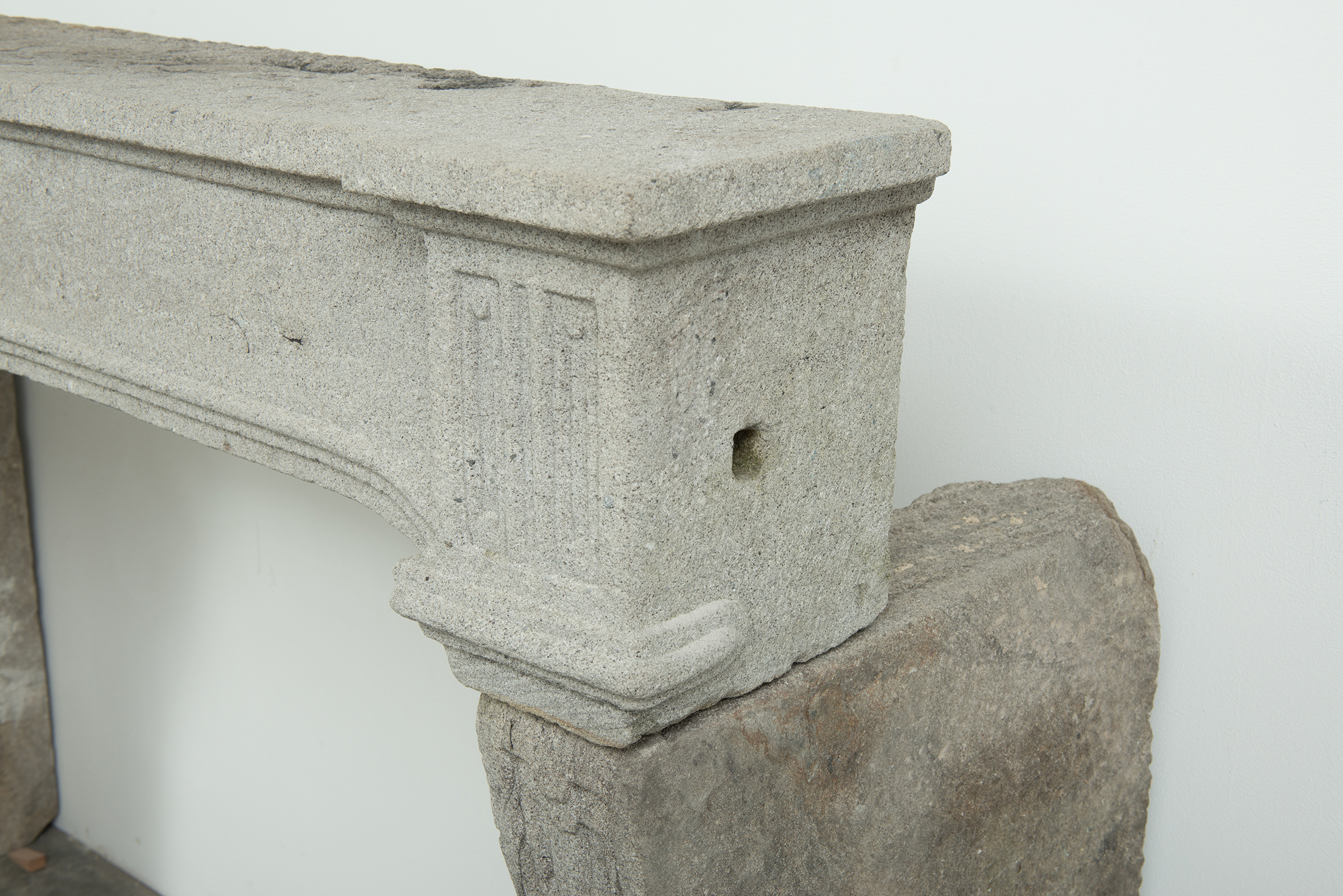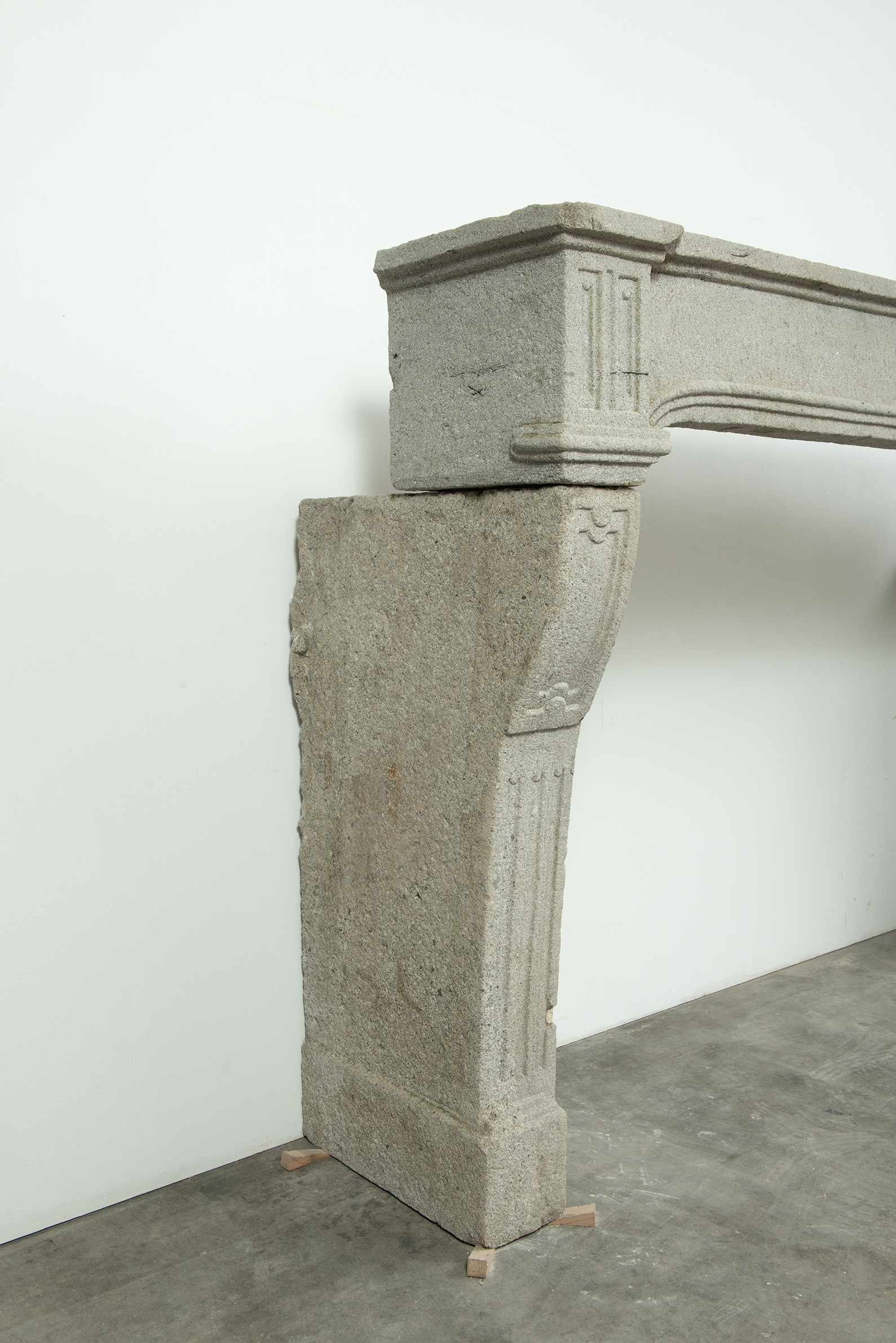 Het grove lavasteen geeft deze schouw een stoere uitstraling, de Louis XIV ornamentiek voegt verfijning toe. In het front is een schelp aangebracht. Aan de onder- en bovenkant is het front geprofileerd. De stijlen hebben de vorm van een console, onder de bolling zijn drie cannelures aangebracht.
