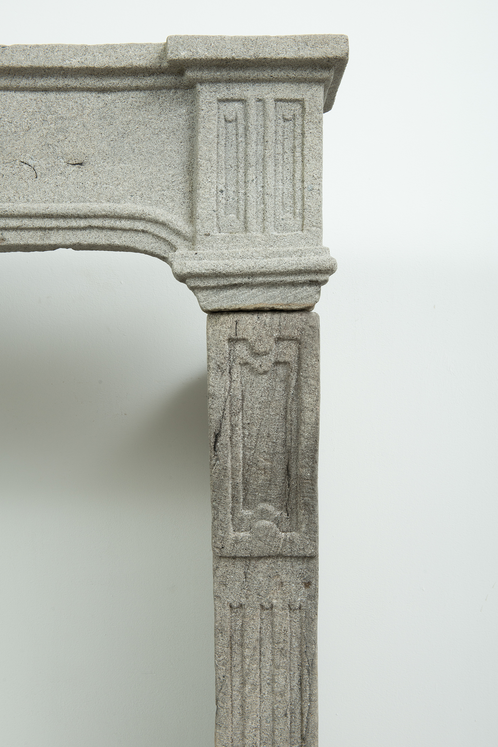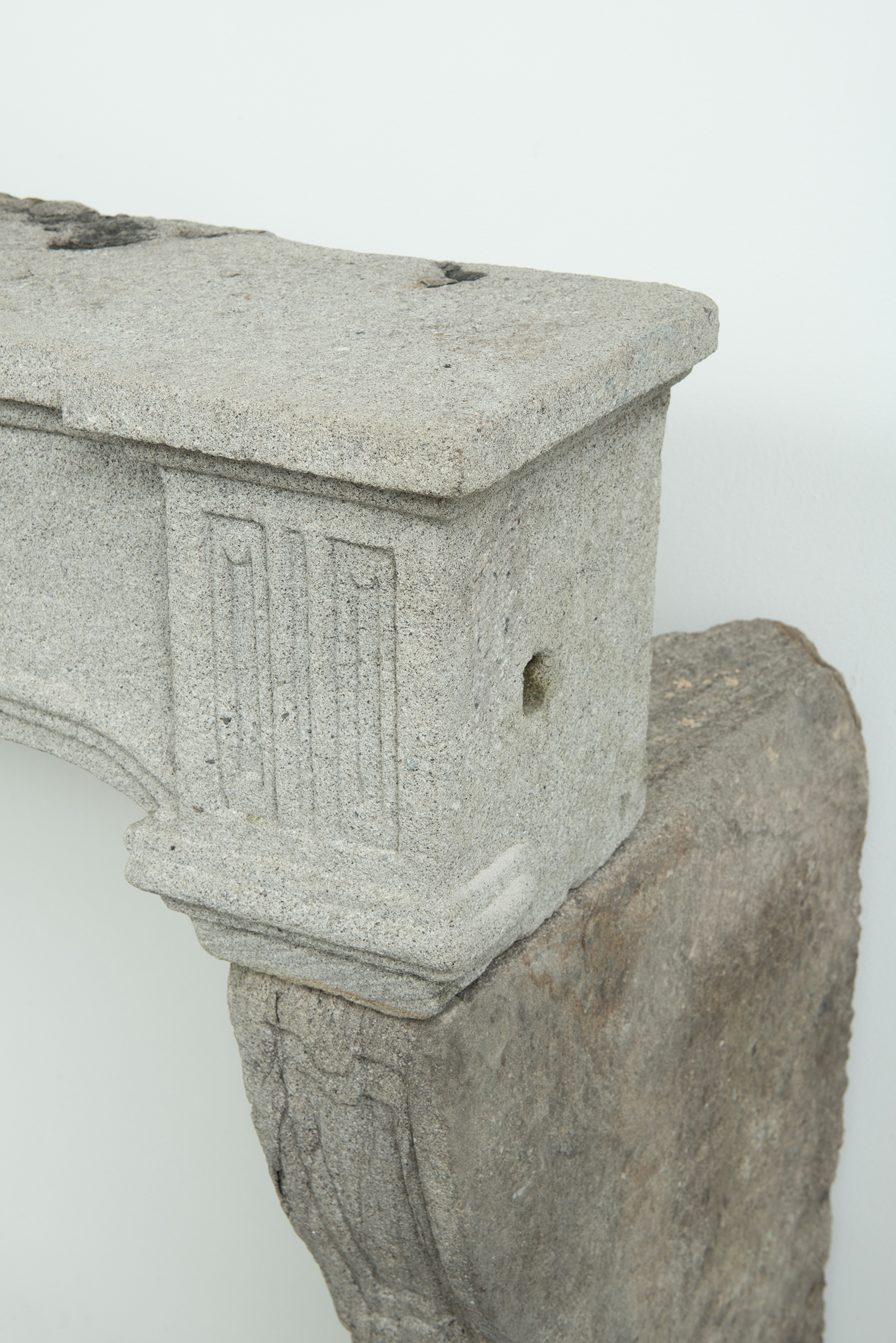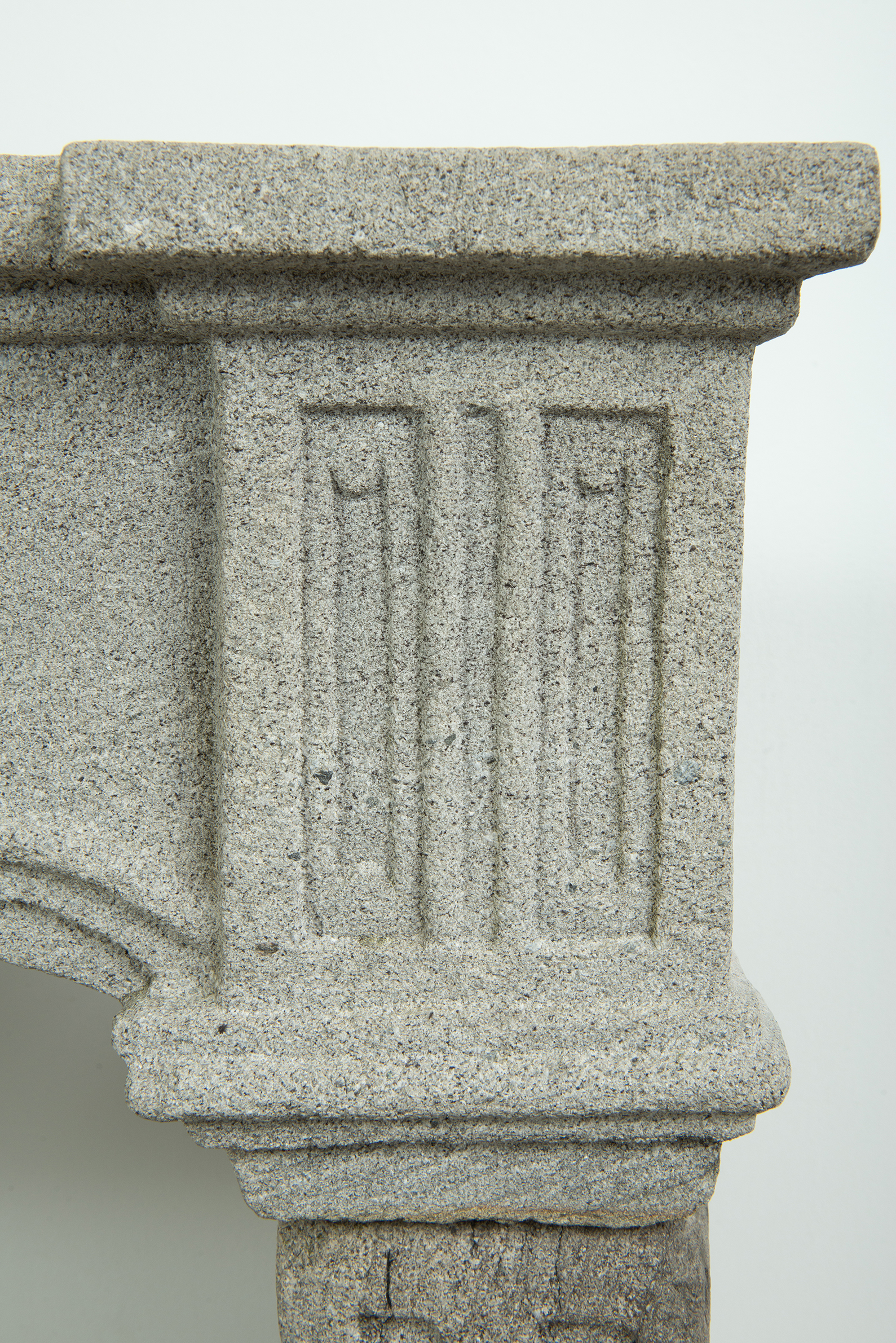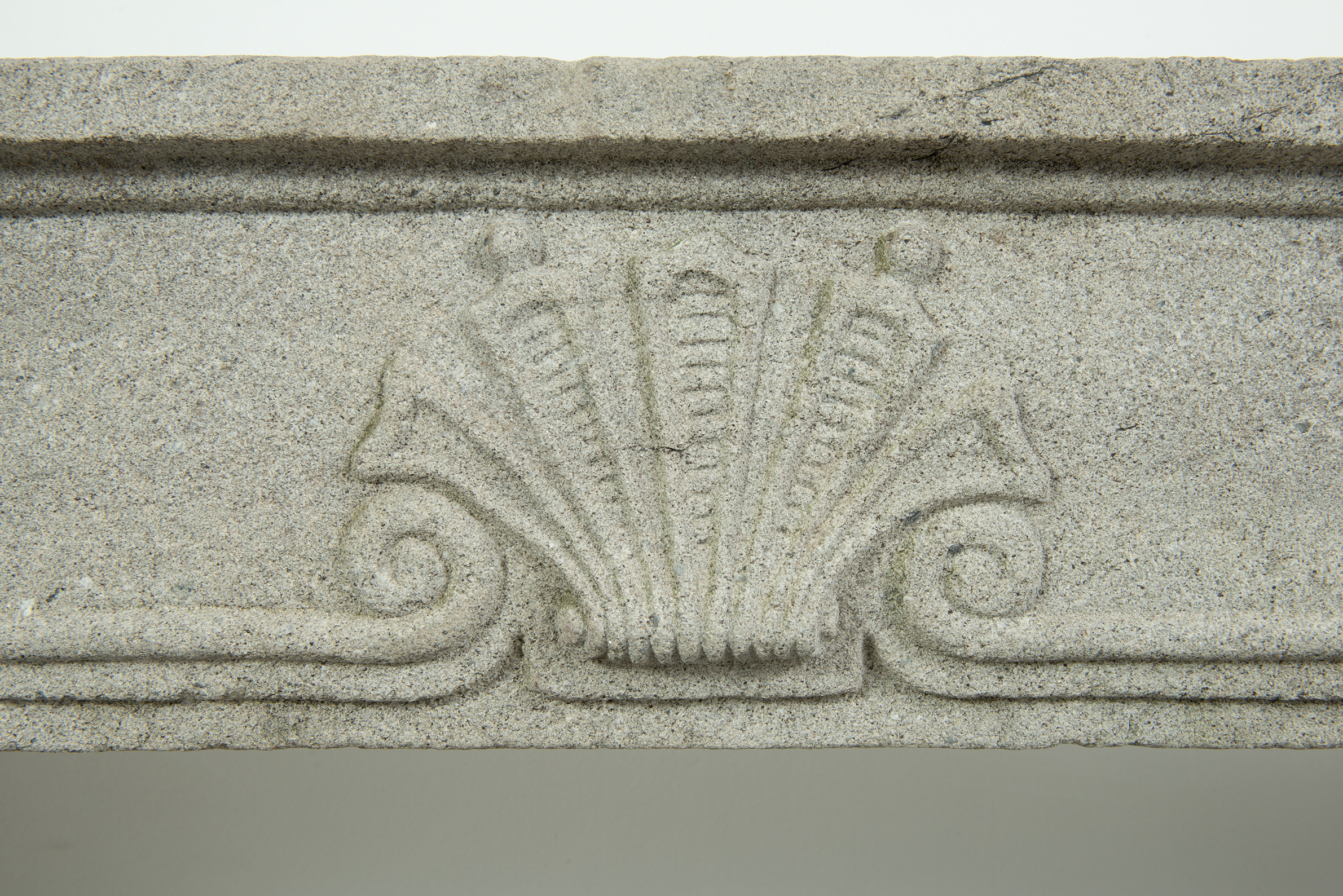 Het grove lavasteen geeft deze schouw een stoere uitstraling, de Louis XIV ornamentiek voegt verfijning toe. In het front is een schelp aangebracht. Aan de onder- en bovenkant is het front geprofileerd. De stijlen hebben de vorm van een console, onder de bolling zijn drie cannelures aangebracht.