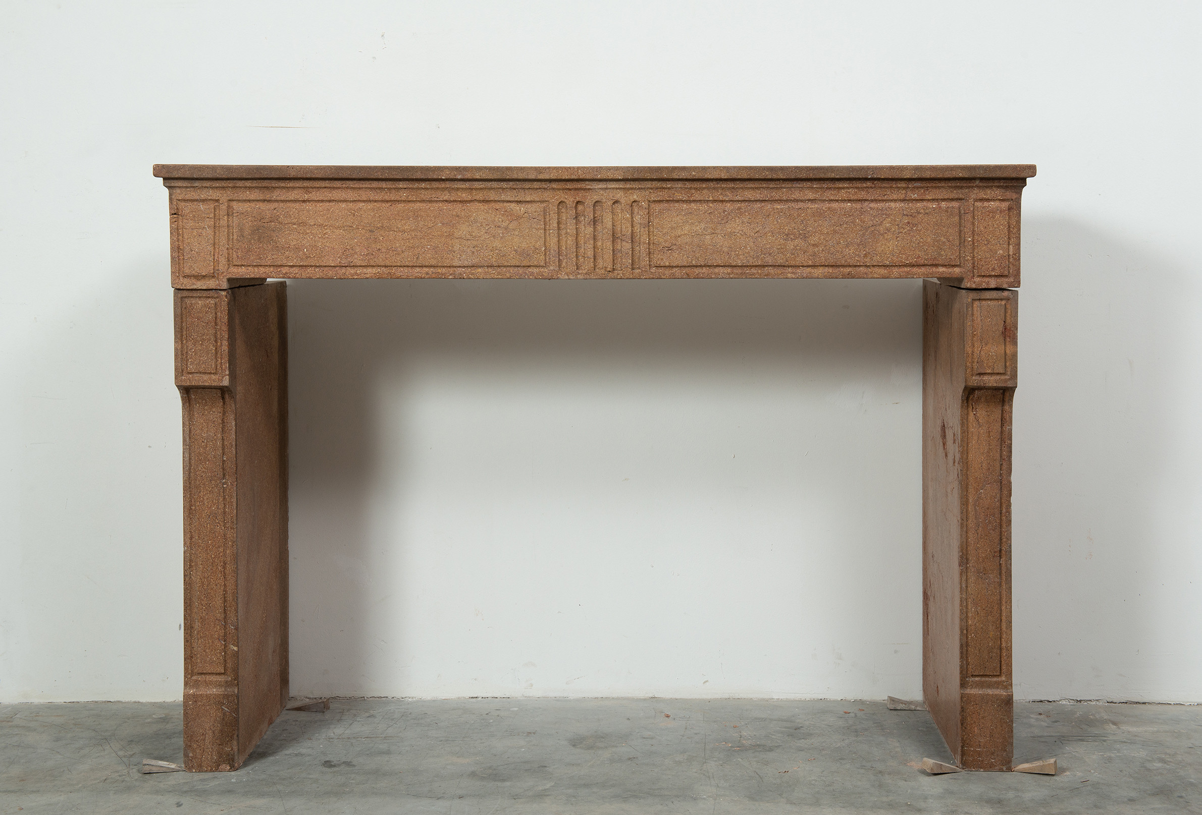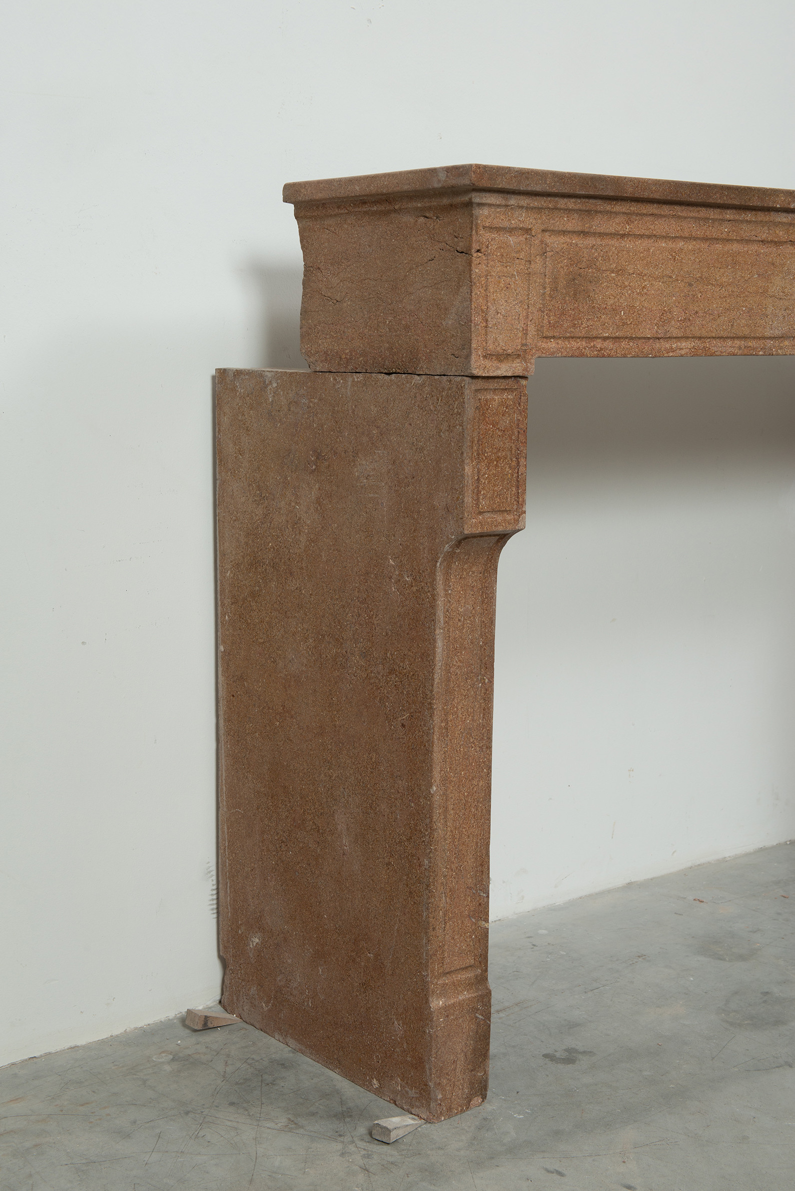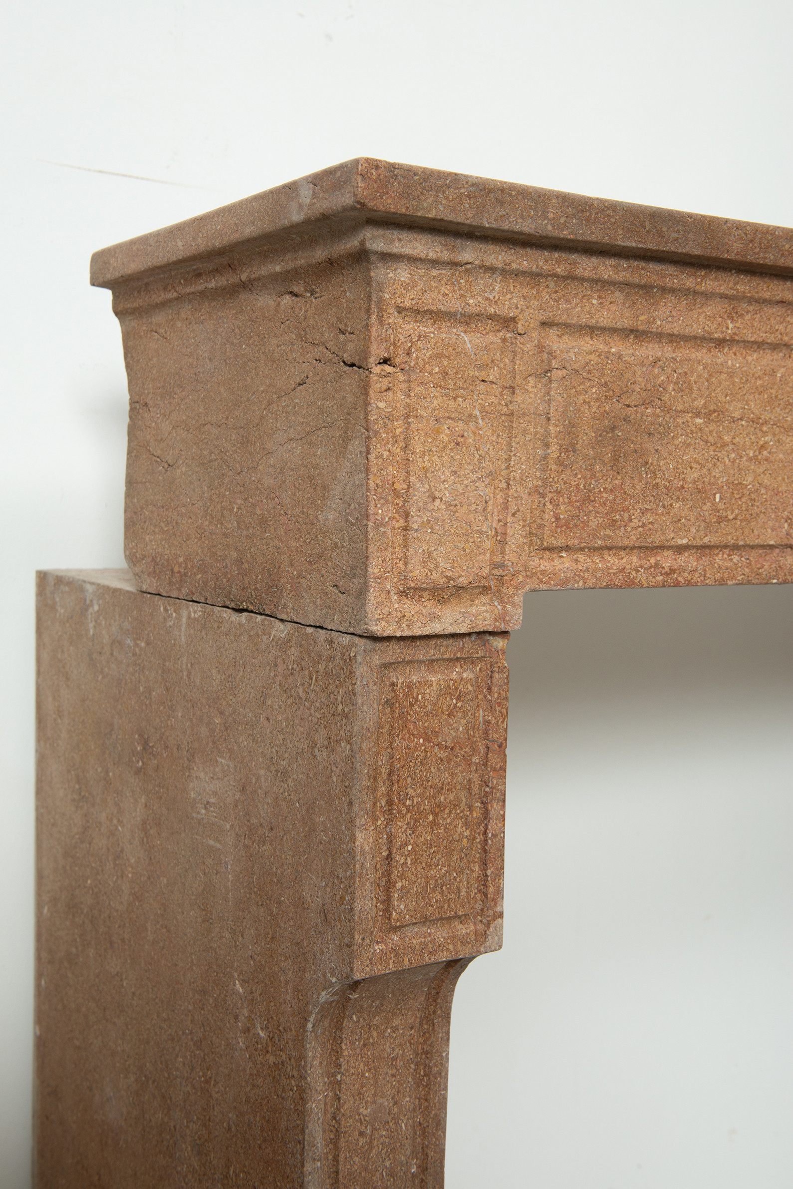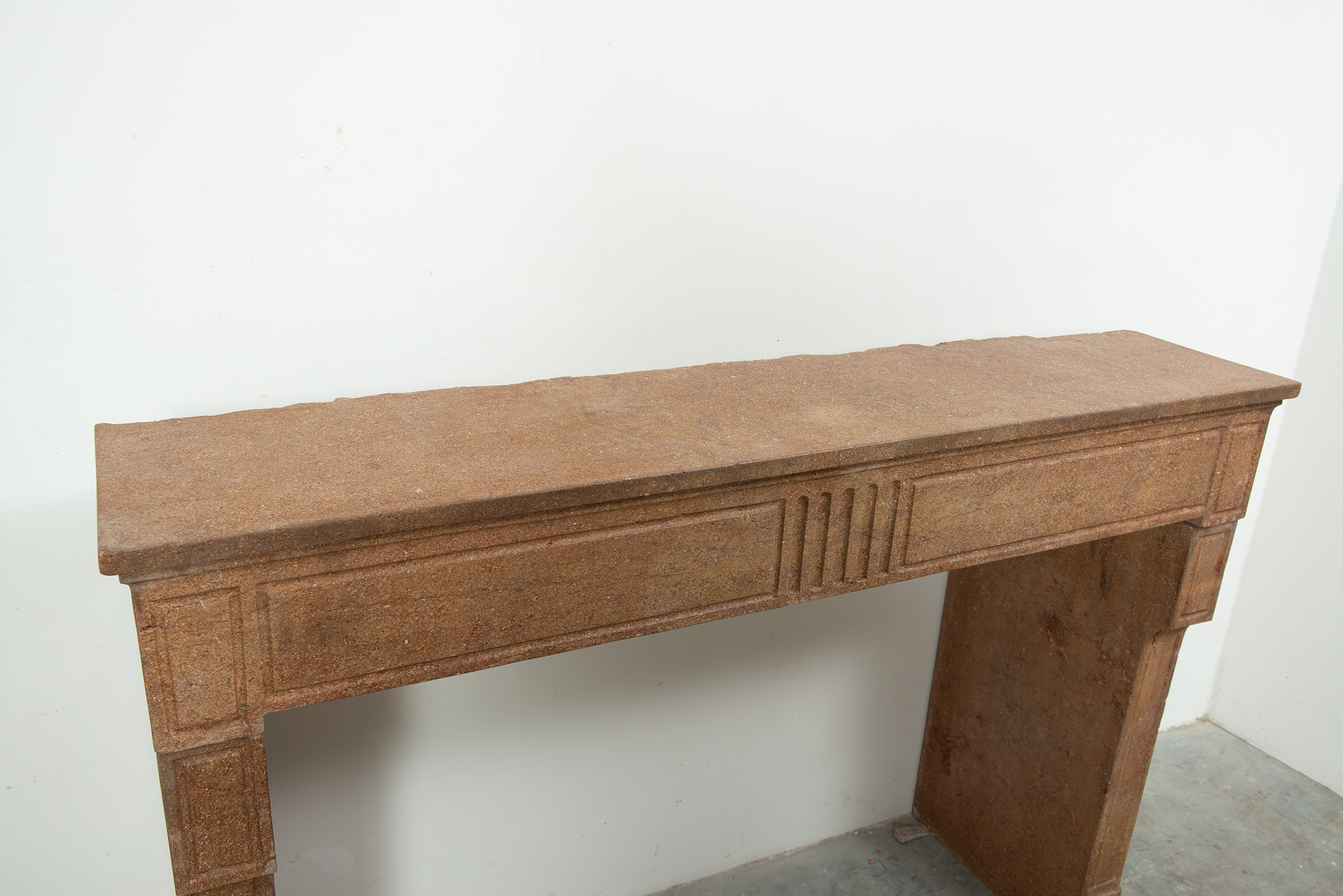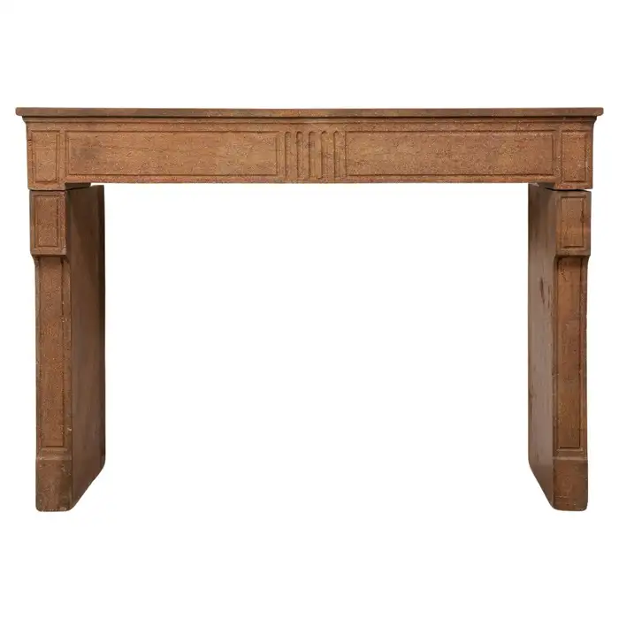 Deze schouw heeft strakke lijnen, en is voorzien van panelering als decoratie, zowel in het front als op de stijlen. In het midden van het front een vijftal cannelure’s. De stijlen hebben de vorm van hoekige consoles die het front dragen. Deze kalksteen heeft een warme kleur, dat van dichtbij een bijzonder patroon laat zien met verschillende kleuren en vormen, wat zorgt voor een fascinerend oppervlak. Met deze kalkstenen Louis XVI schouw haalt u tegelijkertijd een robuust stuk met historie en verfijnende uitstraling in huis.