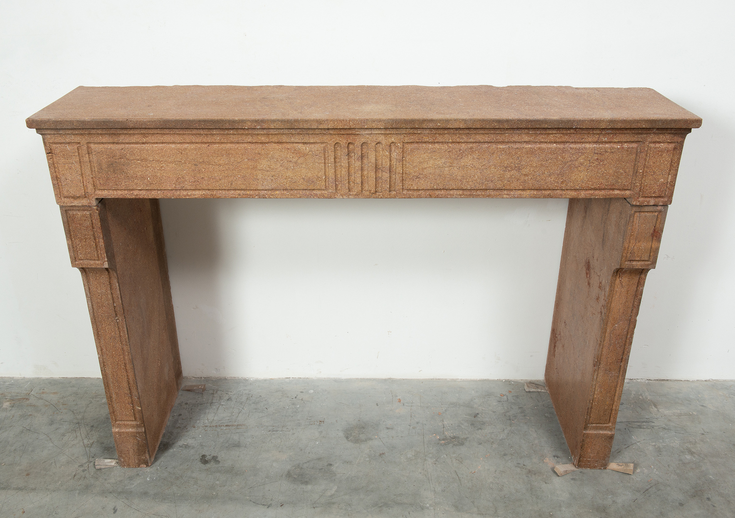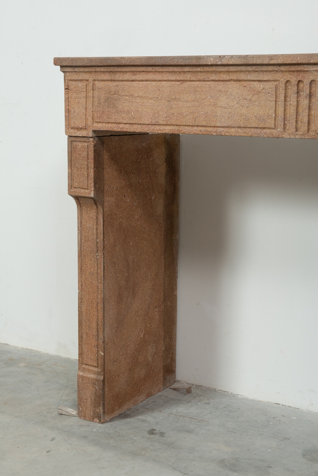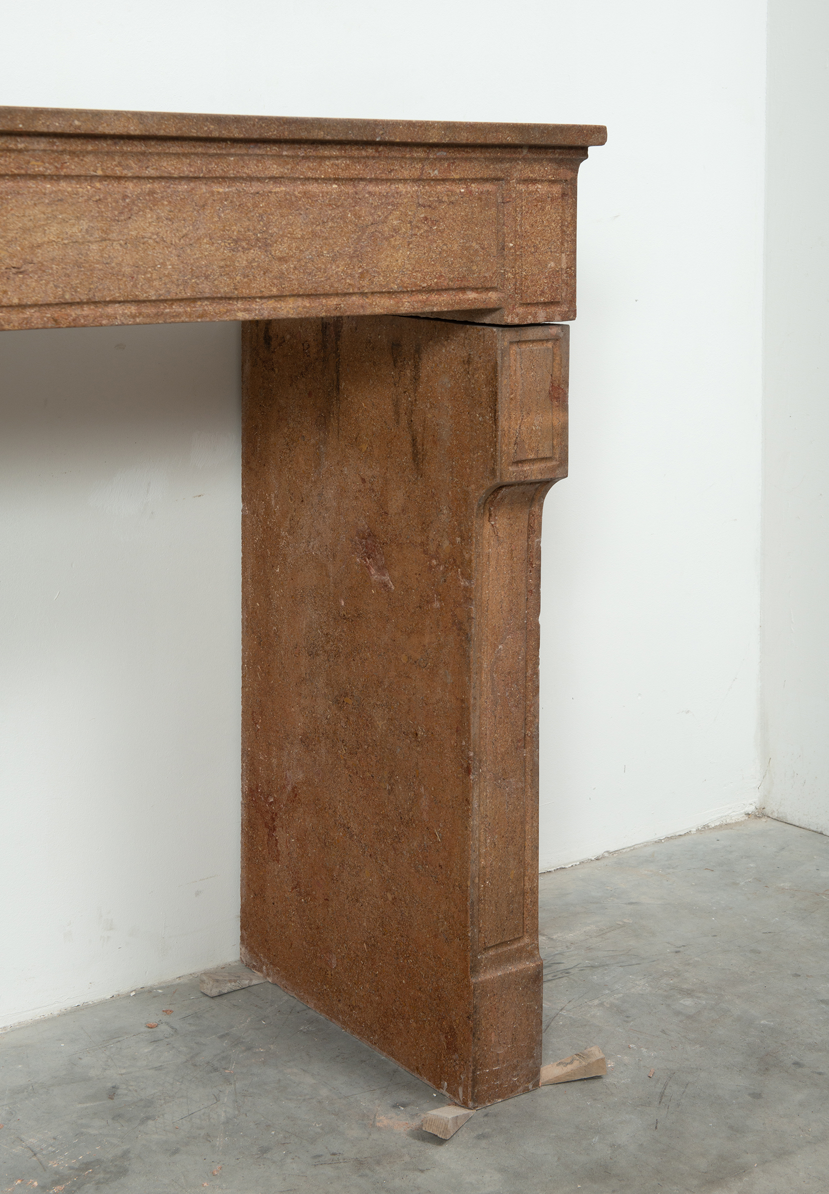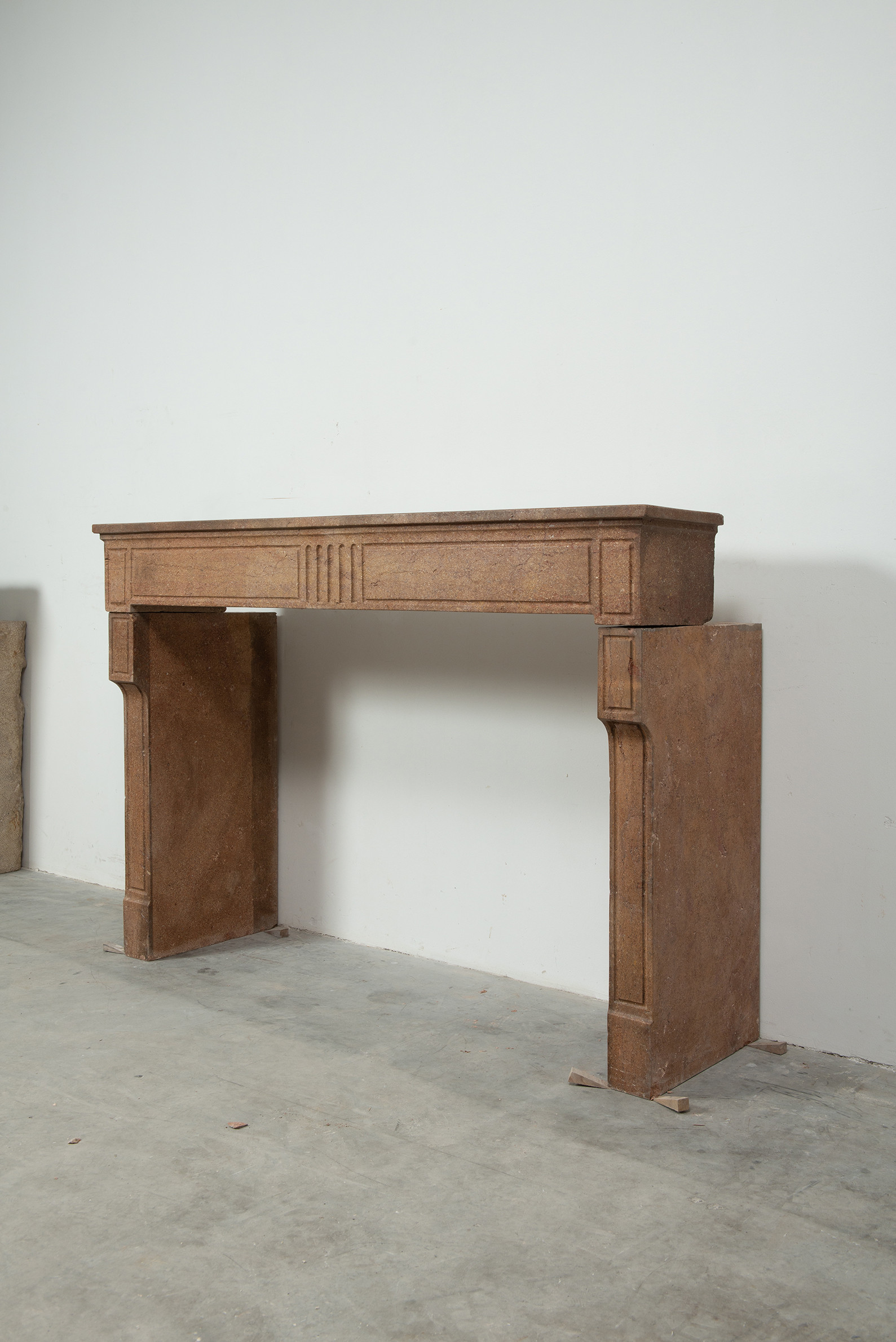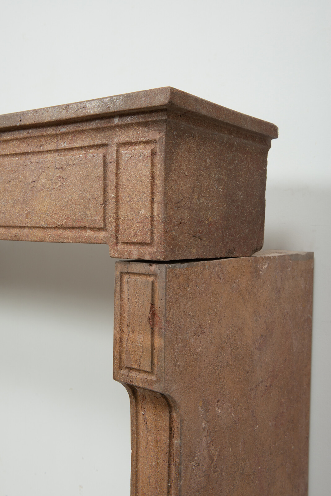 Deze schouw heeft strakke lijnen, en is voorzien van panelering als decoratie, zowel in het front als op de stijlen. In het midden van het front een vijftal cannelure’s. De stijlen hebben de vorm van hoekige consoles die het front dragen. Deze kalksteen heeft een warme kleur, dat van dichtbij een bijzonder patroon laat zien met verschillende kleuren en vormen, wat zorgt voor een fascinerend oppervlak. Met deze kalkstenen Louis XVI schouw haalt u tegelijkertijd een robuust stuk met historie en verfijnende uitstraling in huis.