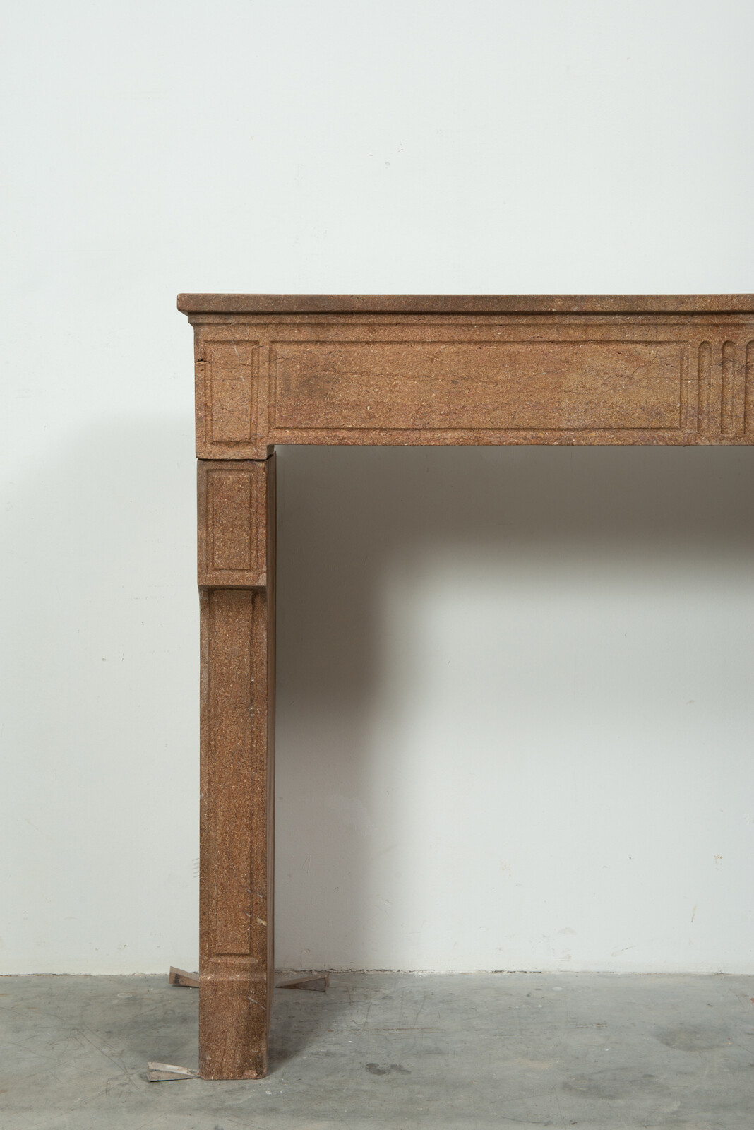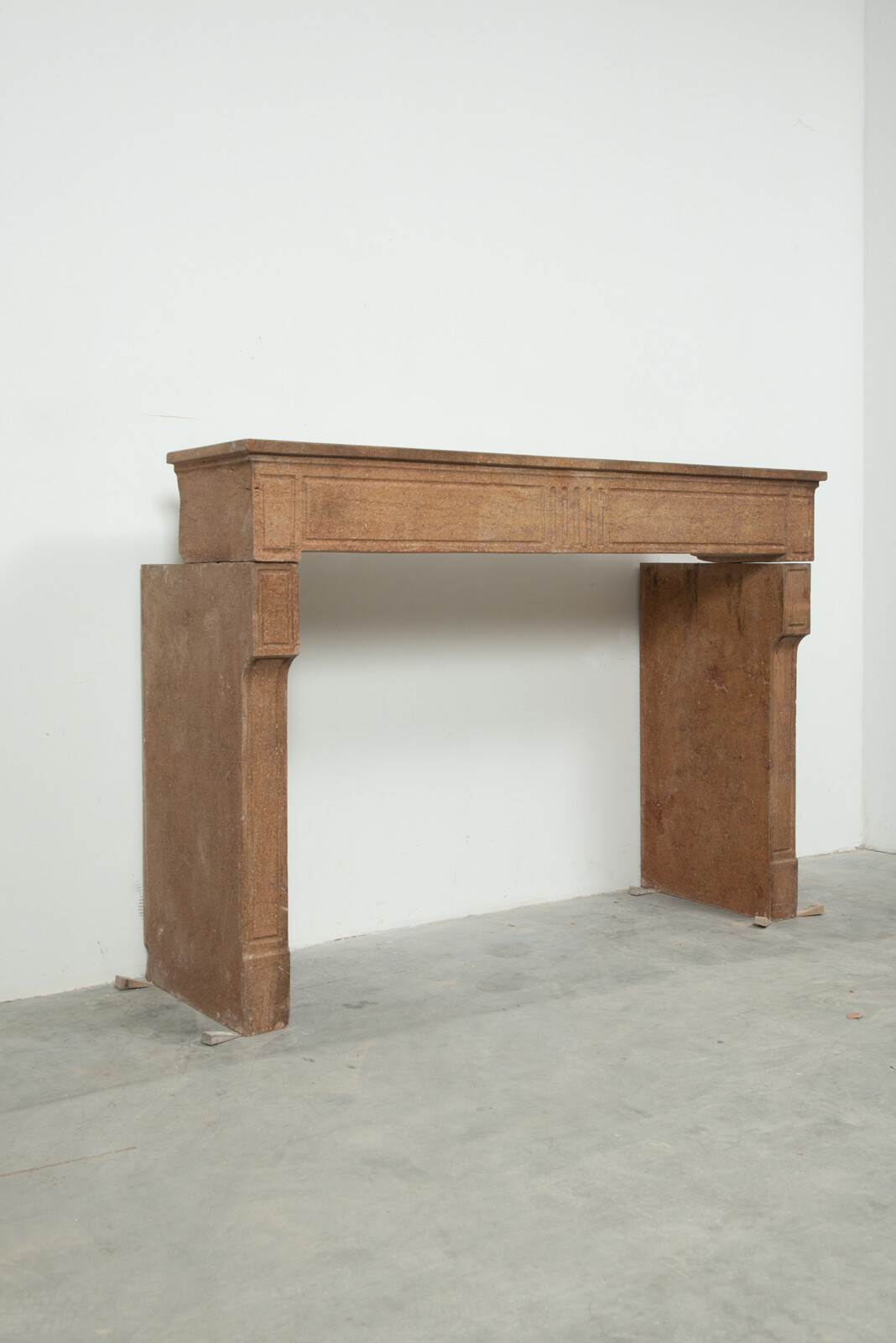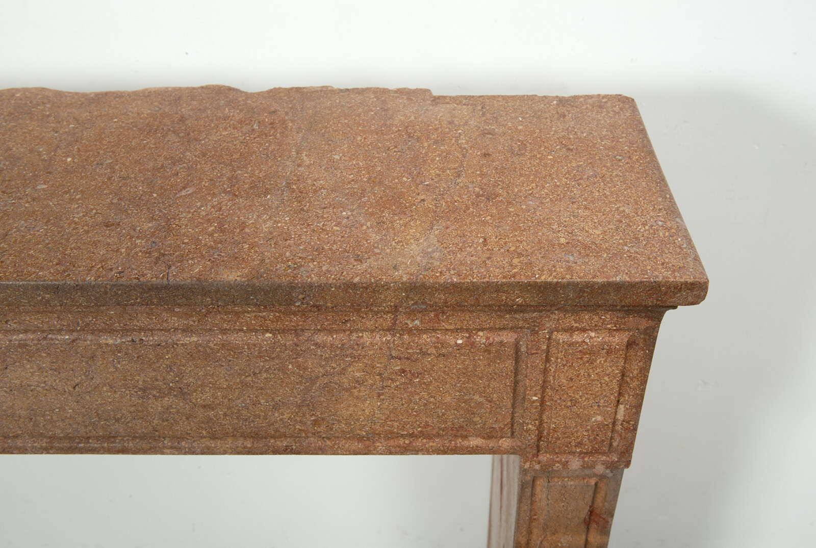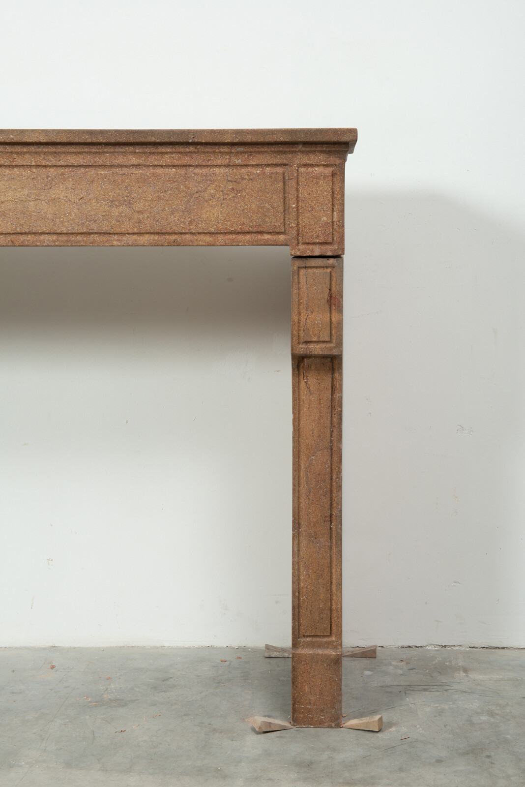 Deze schouw heeft strakke lijnen, en is voorzien van panelering als decoratie, zowel in het front als op de stijlen. In het midden van het front een vijftal cannelure’s. De stijlen hebben de vorm van hoekige consoles die het front dragen. Deze kalksteen heeft een warme kleur, dat van dichtbij een bijzonder patroon laat zien met verschillende kleuren en vormen, wat zorgt voor een fascinerend oppervlak. Met deze kalkstenen Louis XVI schouw haalt u tegelijkertijd een robuust stuk met historie en verfijnende uitstraling in huis.