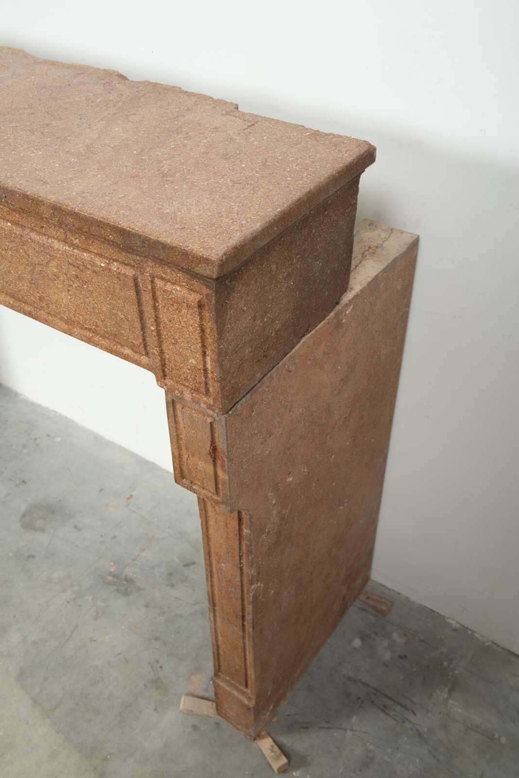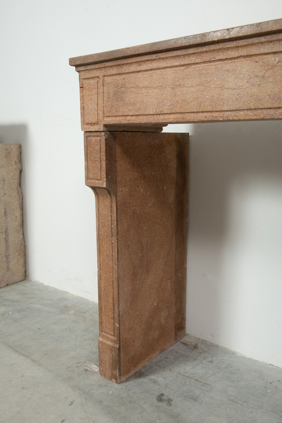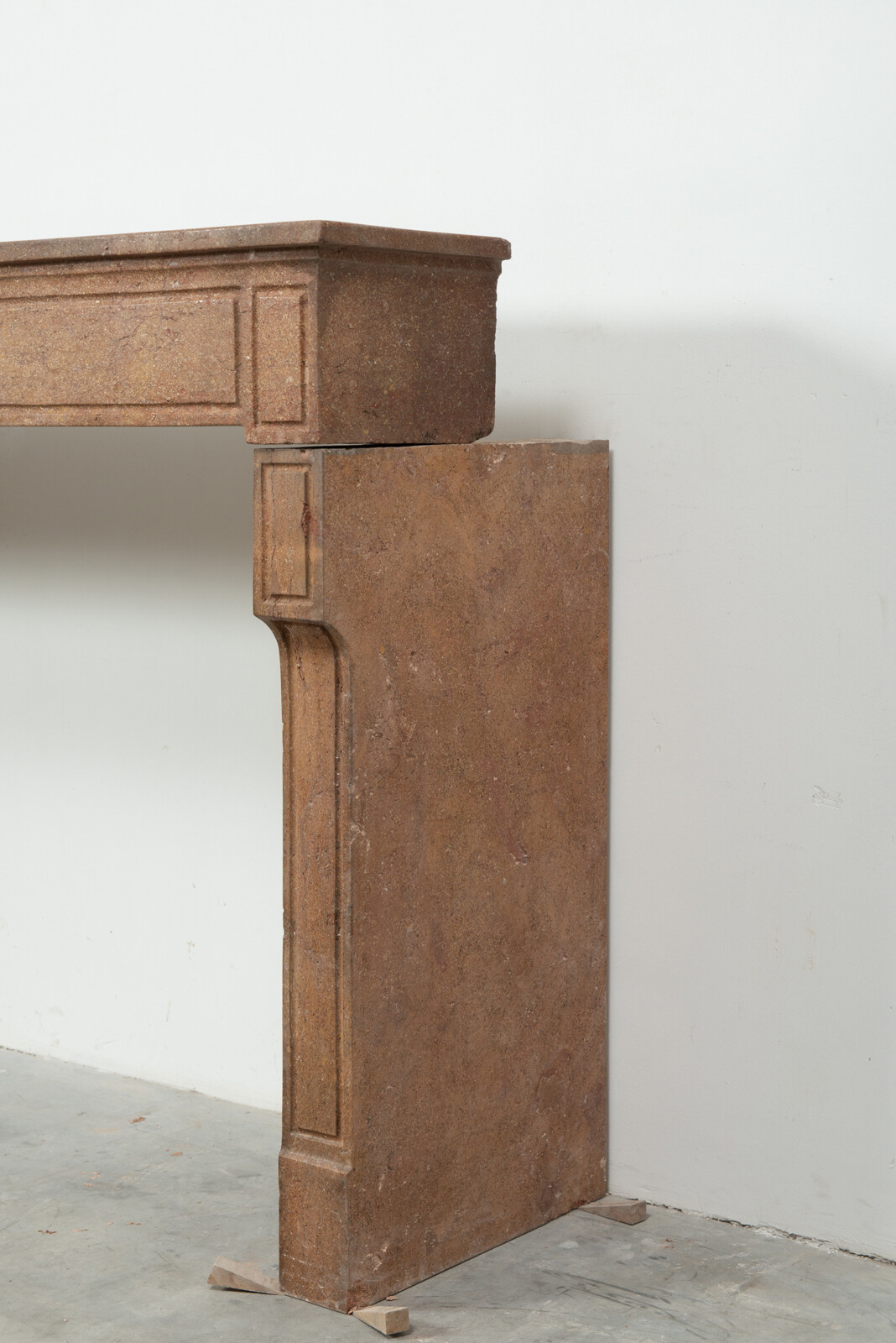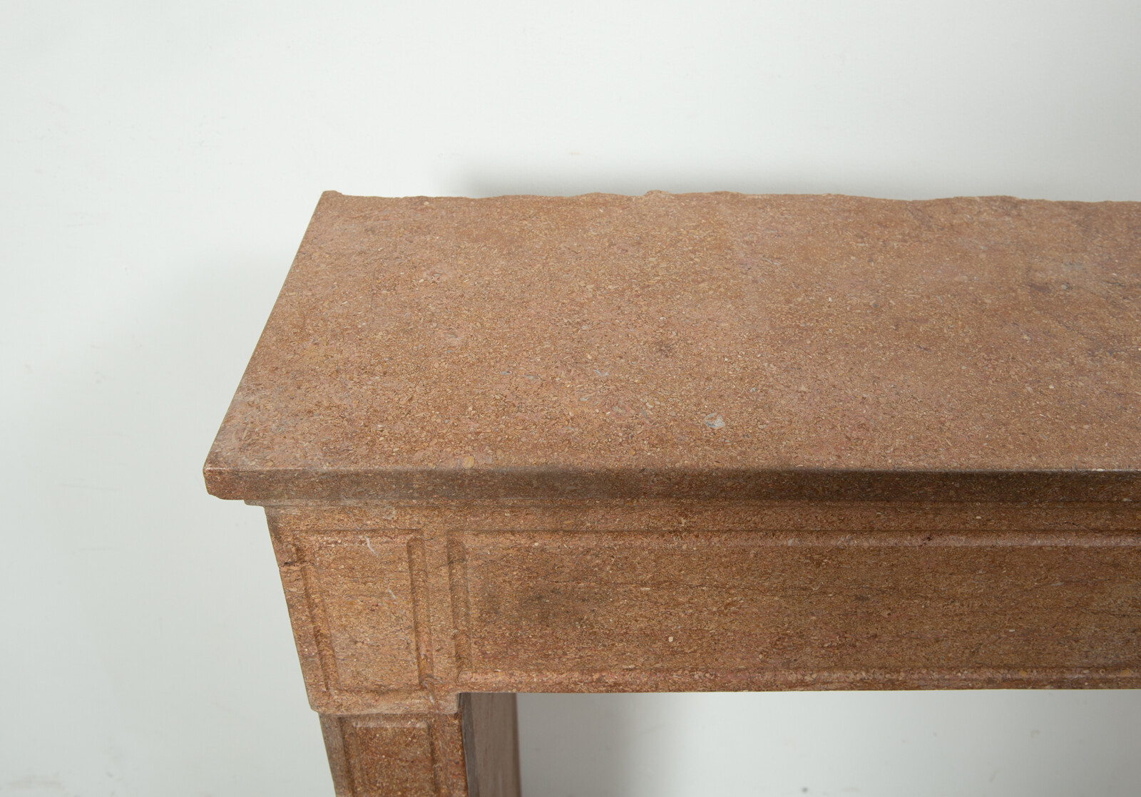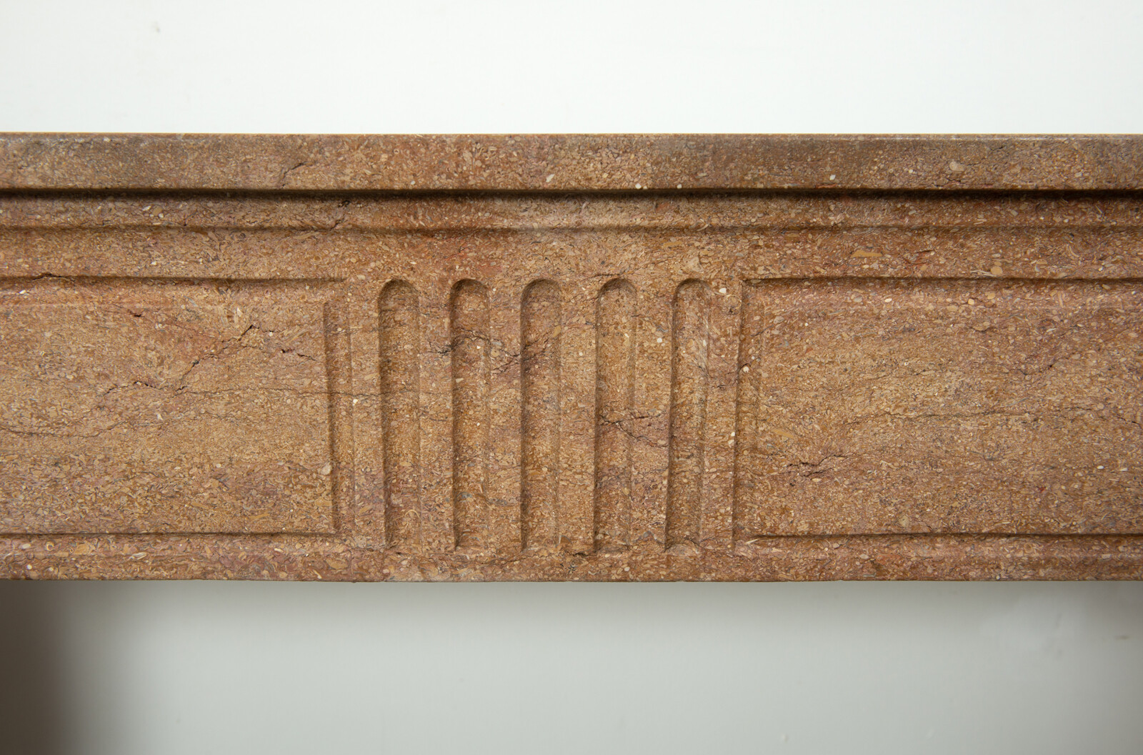 Deze schouw heeft strakke lijnen, en is voorzien van panelering als decoratie, zowel in het front als op de stijlen. In het midden van het front een vijftal cannelure’s. De stijlen hebben de vorm van hoekige consoles die het front dragen. Deze kalksteen heeft een warme kleur, dat van dichtbij een bijzonder patroon laat zien met verschillende kleuren en vormen, wat zorgt voor een fascinerend oppervlak. Met deze kalkstenen Louis XVI schouw haalt u tegelijkertijd een robuust stuk met historie en verfijnende uitstraling in huis.
