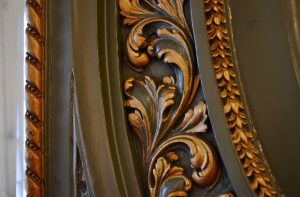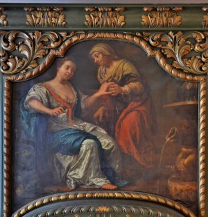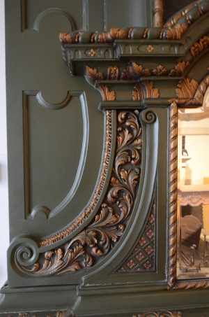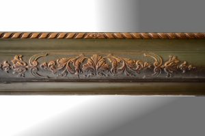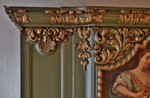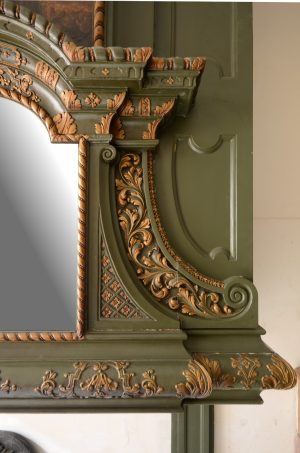 De prachtig gesneden trumeau is rijkelijk gedecoreerd en versier met een tot de verbeelding sprekend schilderij met daaronder een spiegel.