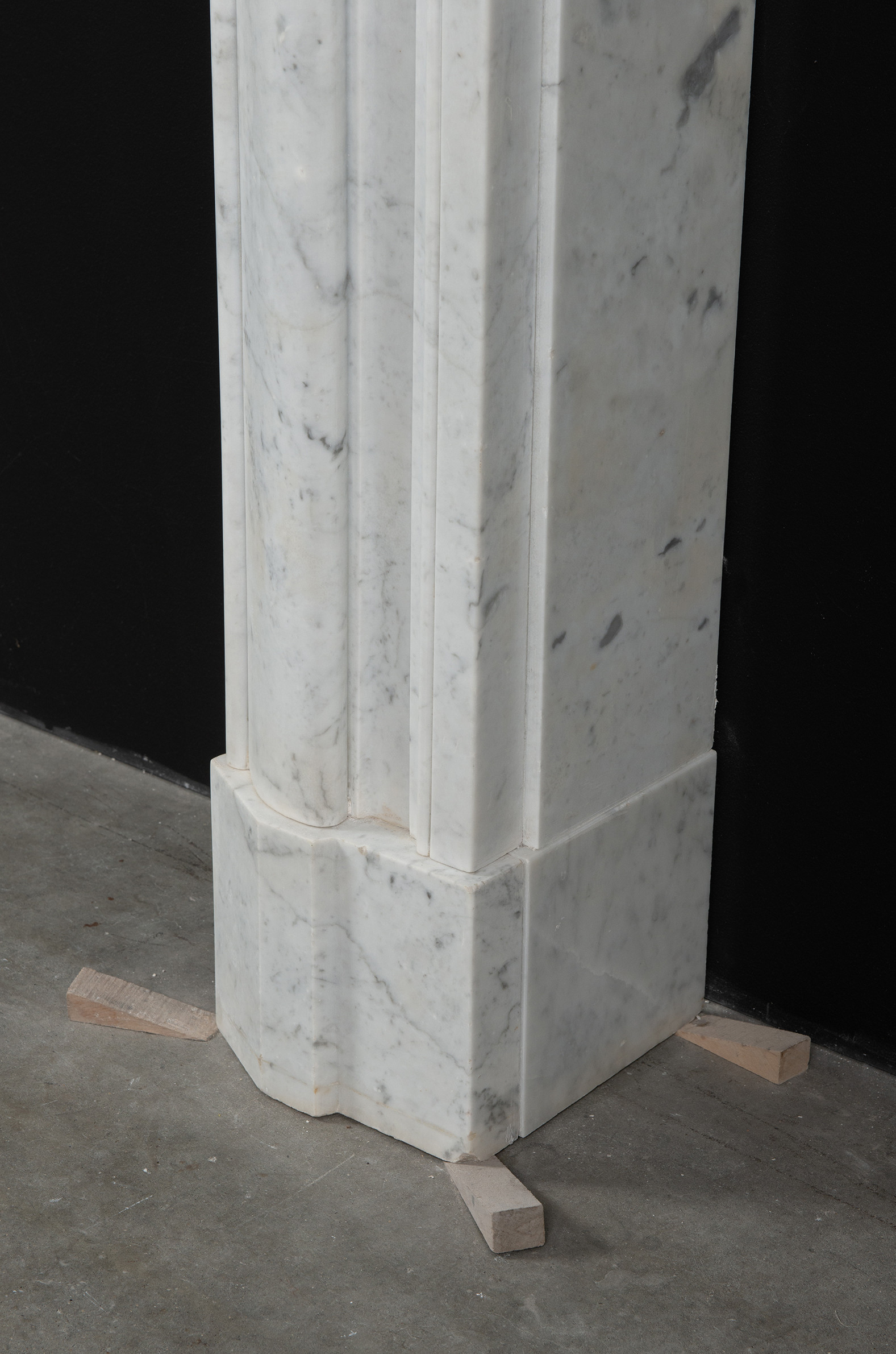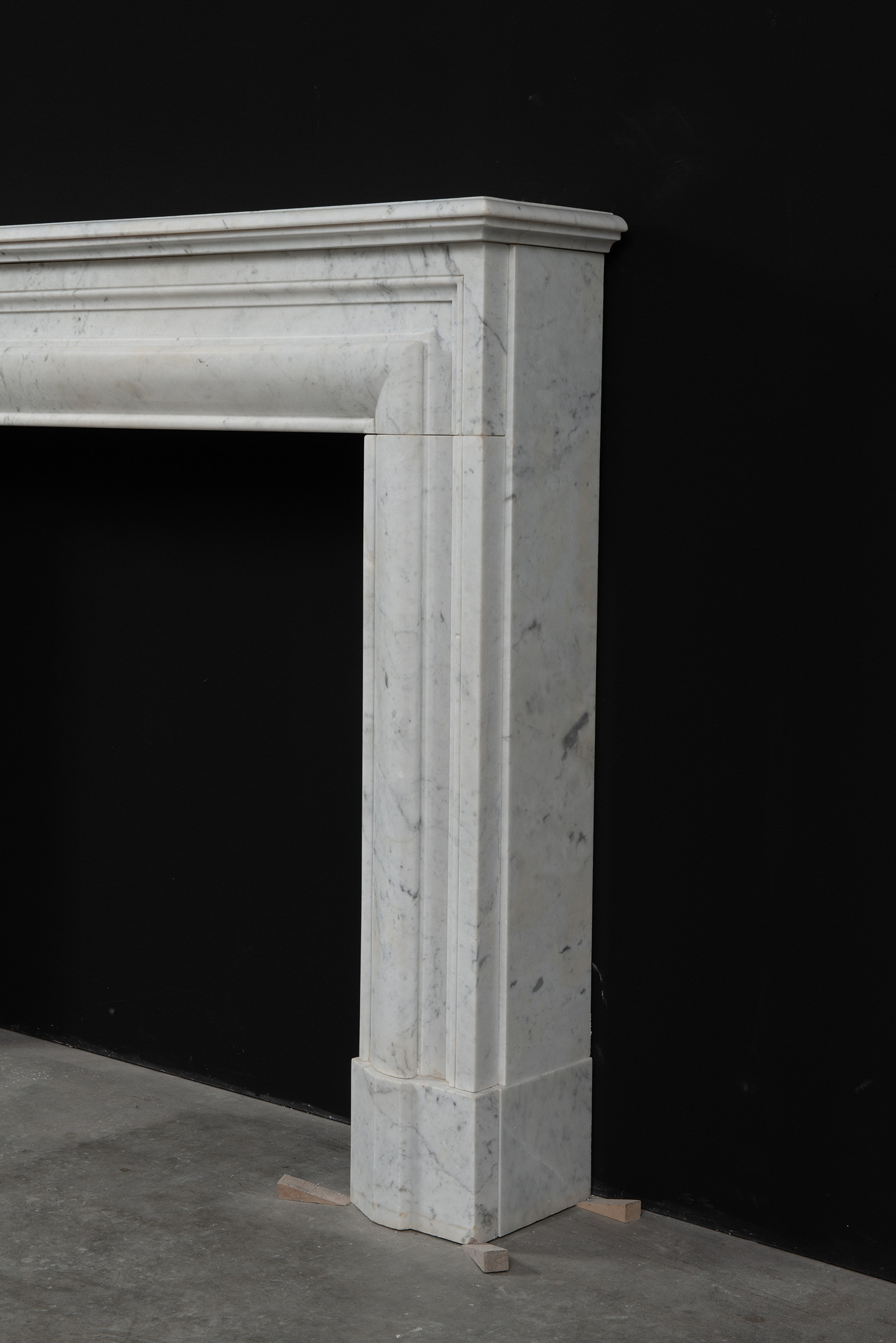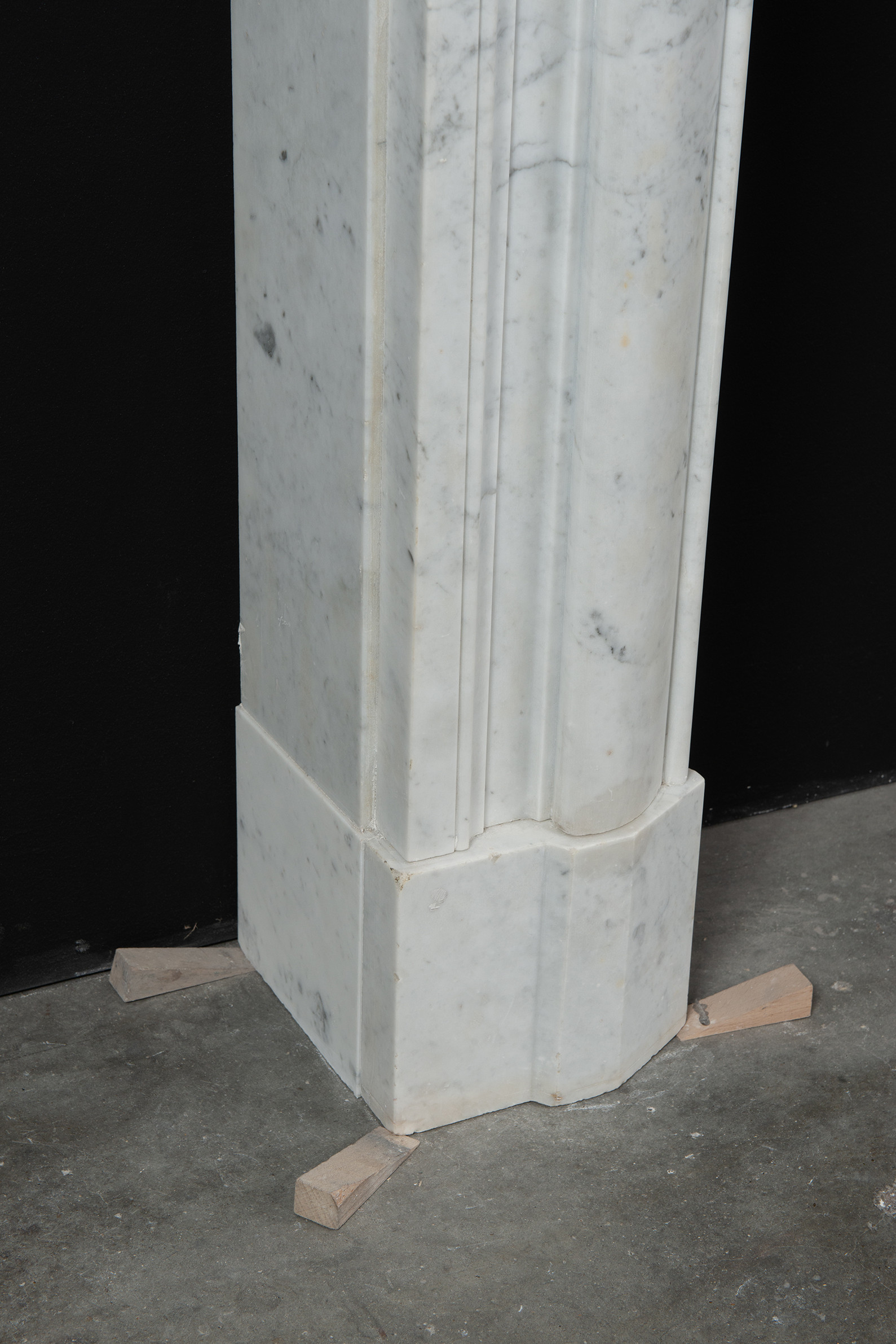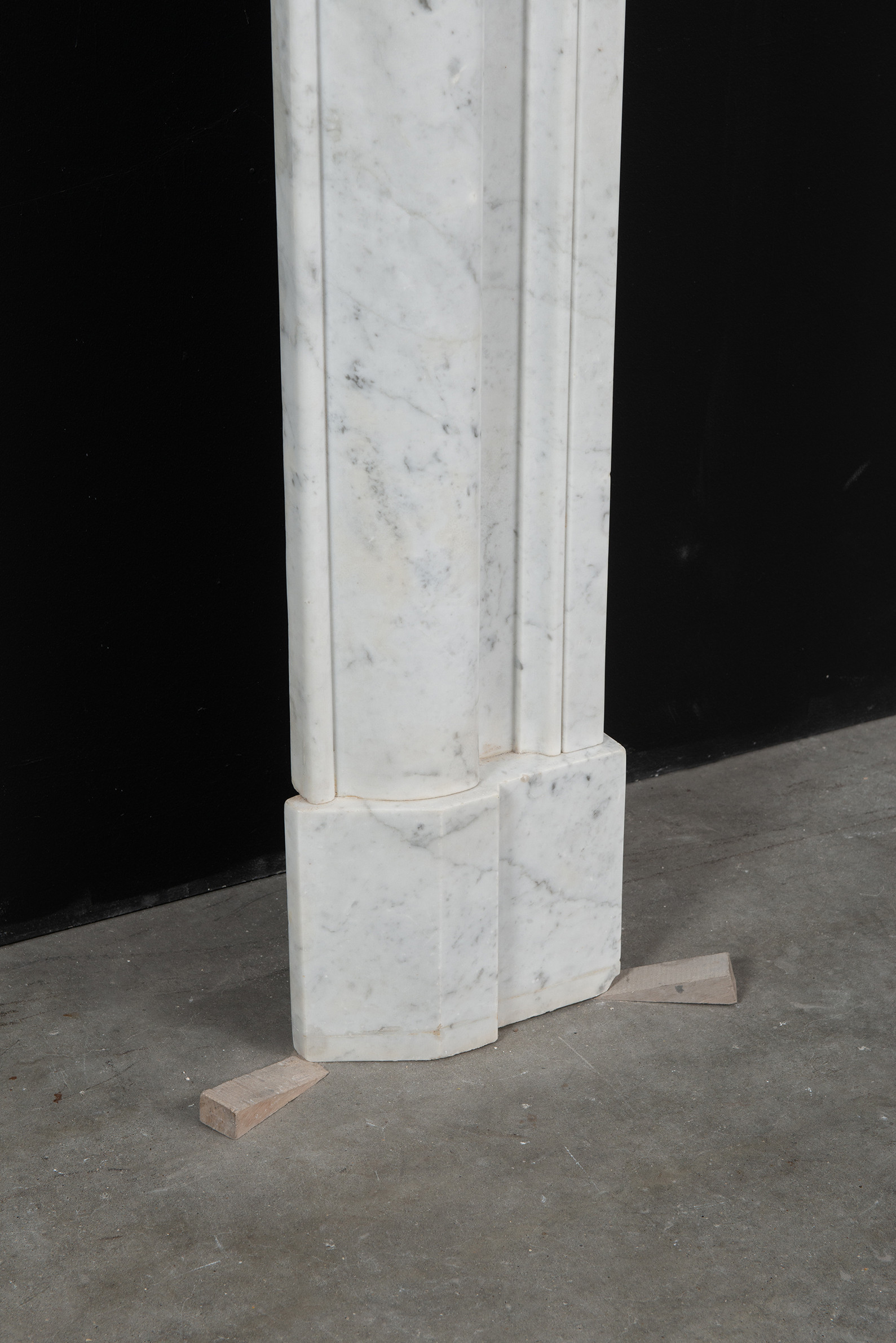 Deze rechte schouw is vervaardigd uit helder wit marmer en kenmerkt zich door haar enkele, grote profiel, wat zorgt voor een krachtig en minimalistisch statement. Het strakke, rechte ontwerp legt volledig de nadruk op het marmer zelf, waarbij de witte kleur en de subtiele grijze aders van het materiaal tot hun recht komen.