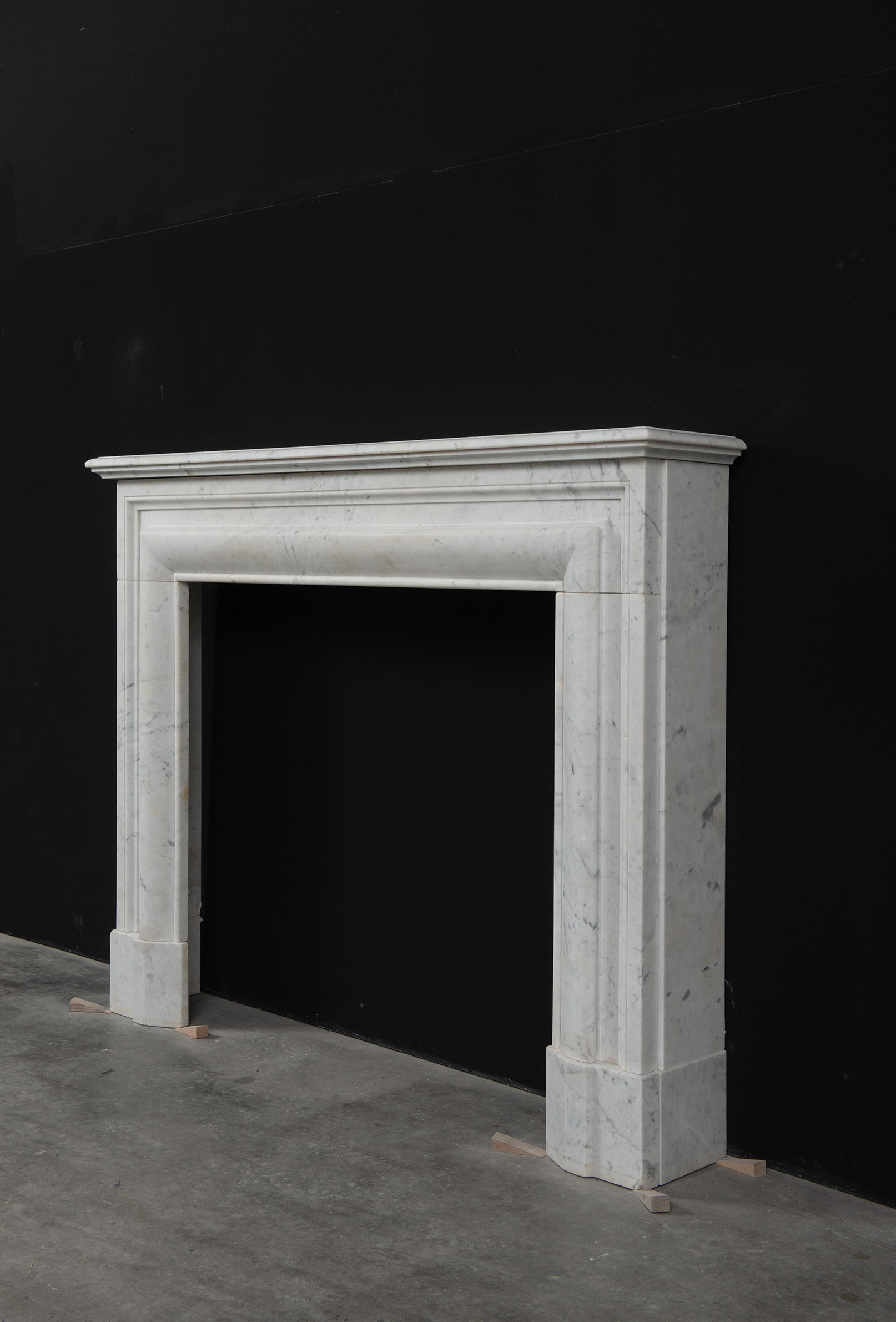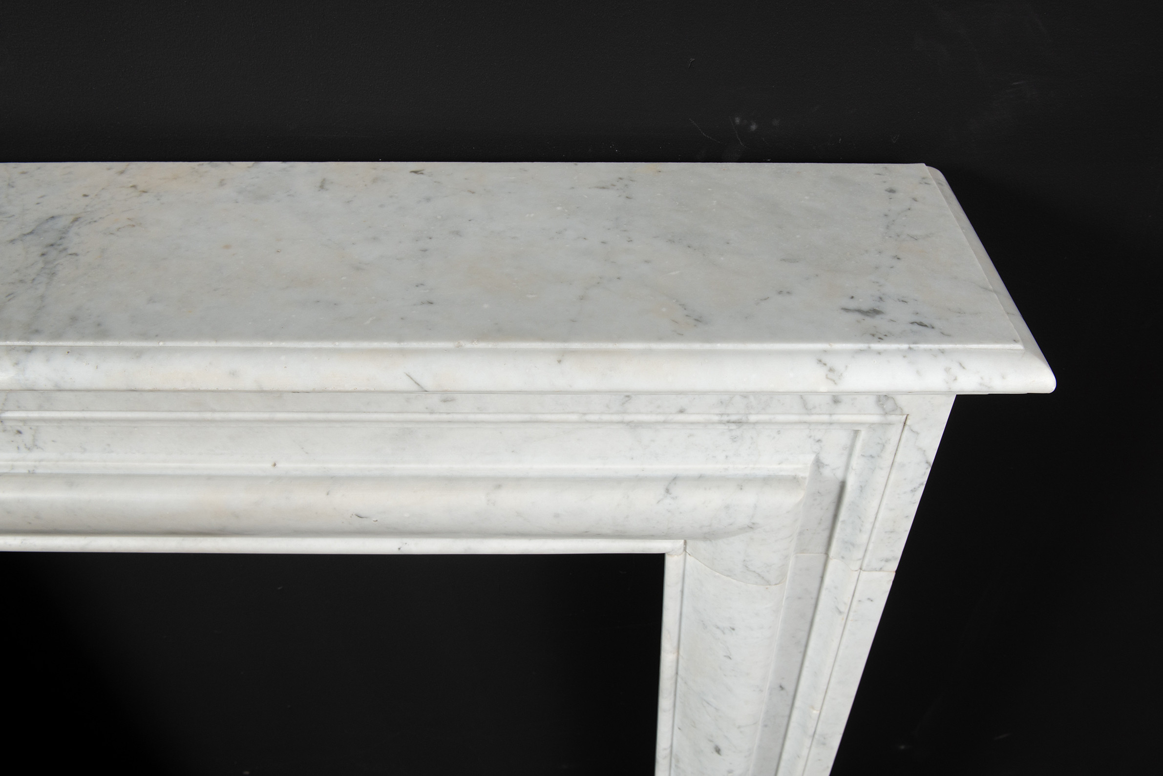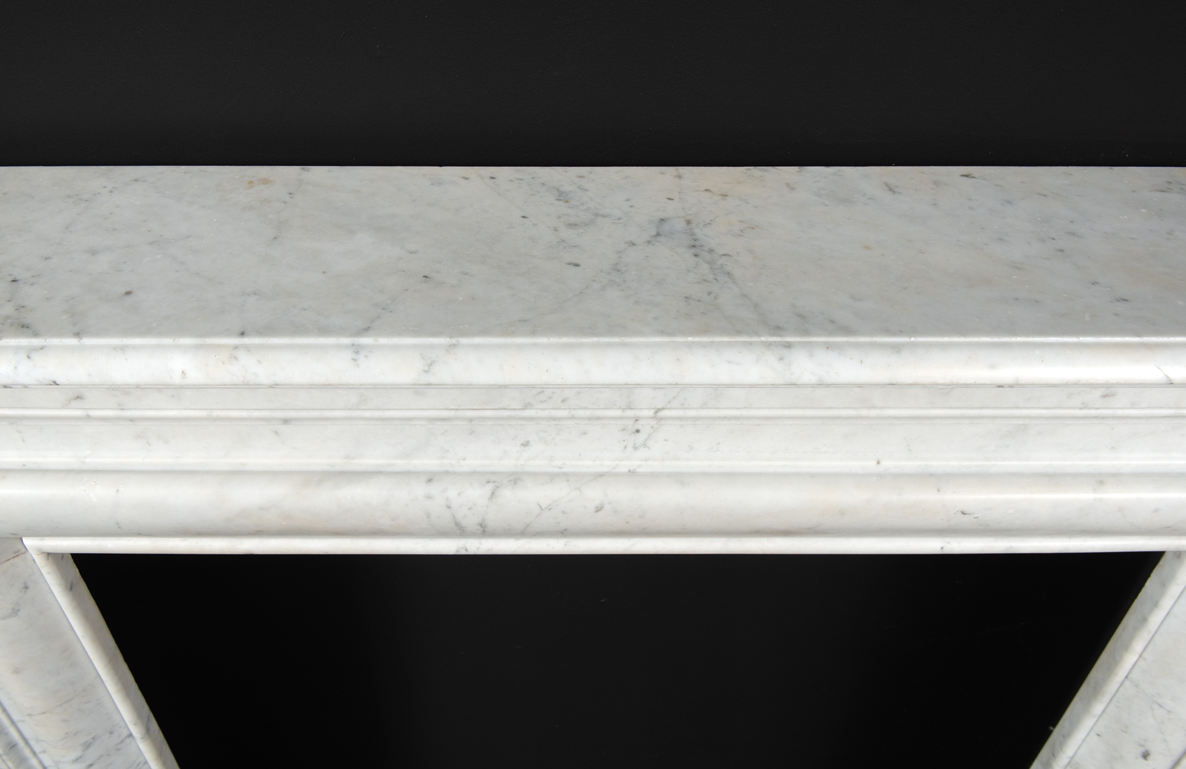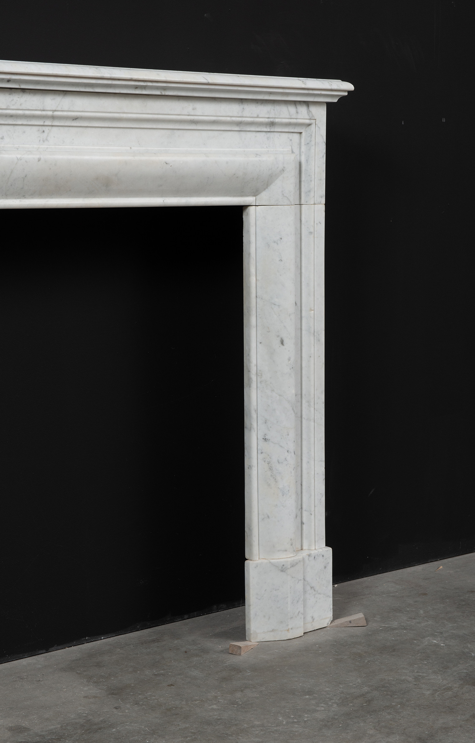 Deze rechte schouw is vervaardigd uit helder wit marmer en kenmerkt zich door haar enkele, grote profiel, wat zorgt voor een krachtig en minimalistisch statement. Het strakke, rechte ontwerp legt volledig de nadruk op het marmer zelf, waarbij de witte kleur en de subtiele grijze aders van het materiaal tot hun recht komen.