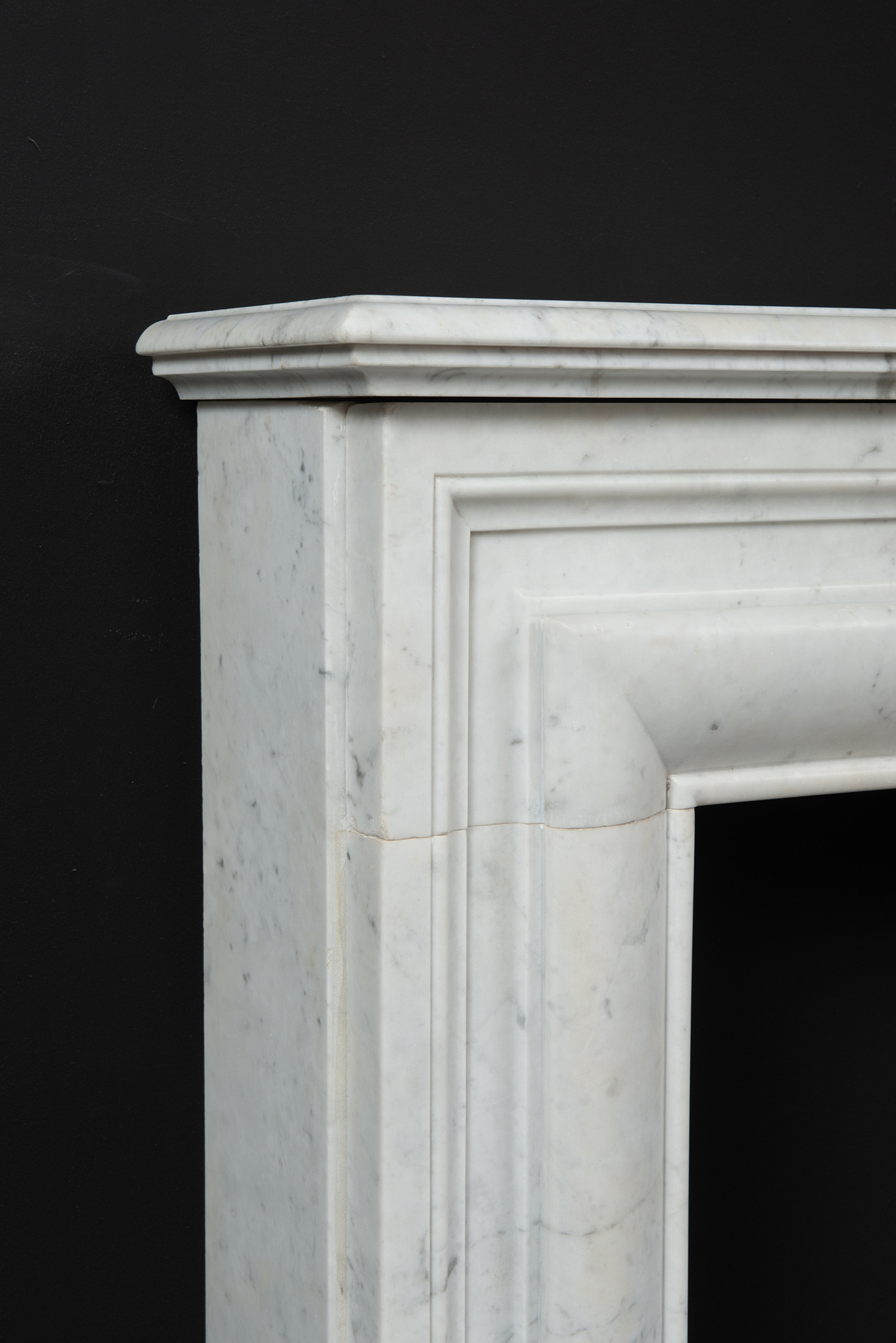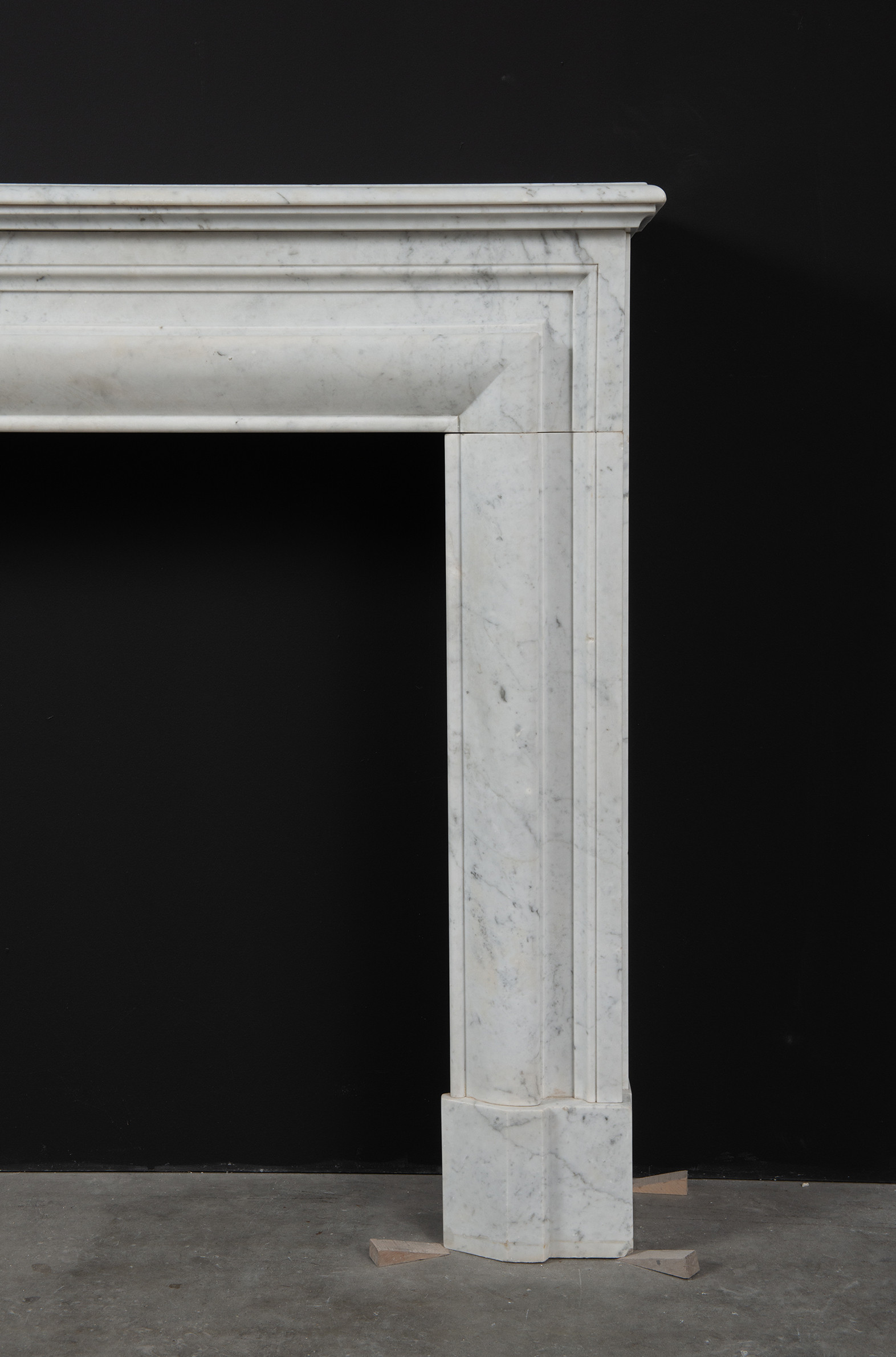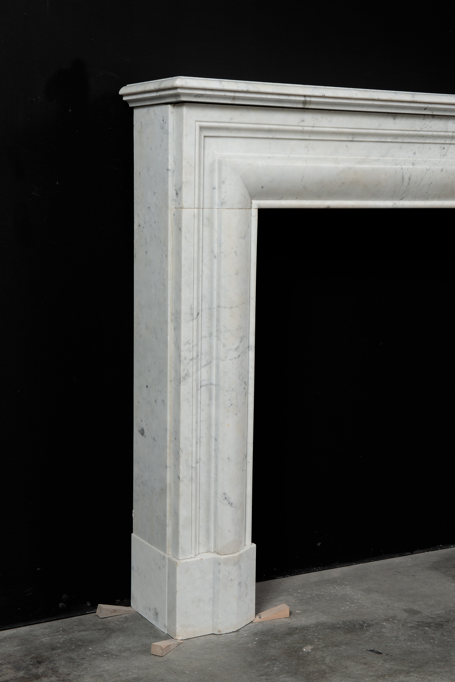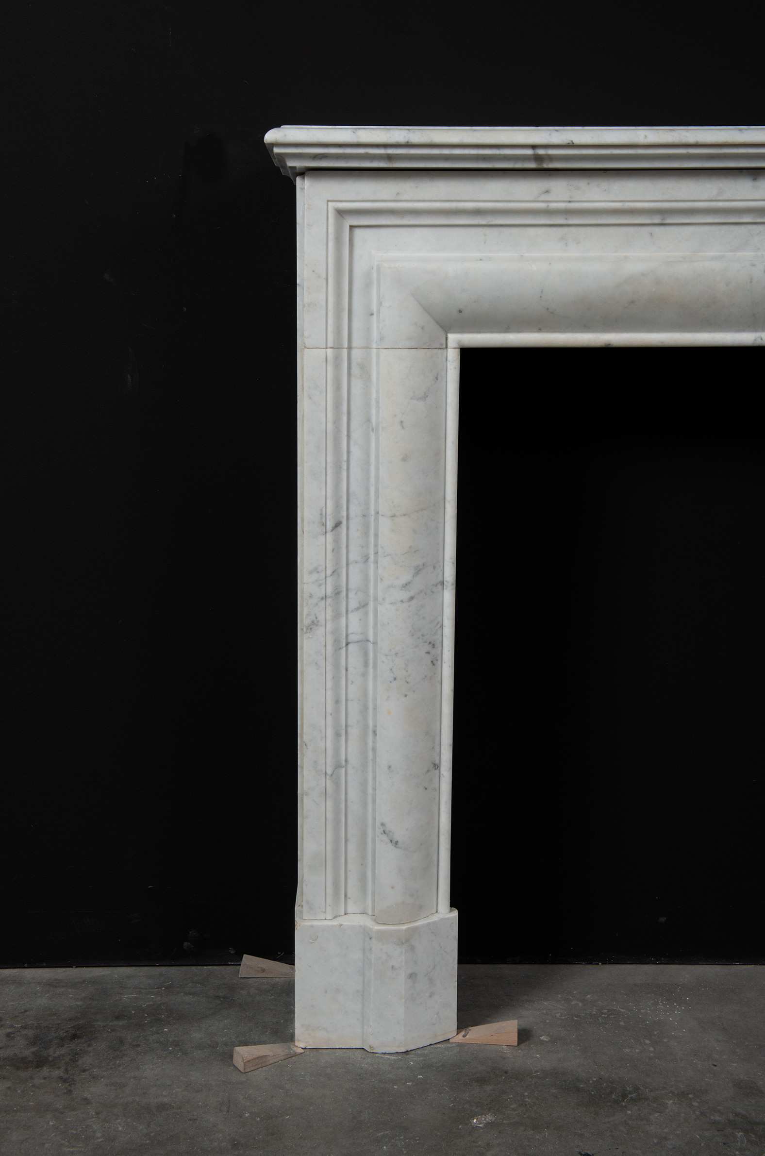 Deze rechte schouw is vervaardigd uit helder wit marmer en kenmerkt zich door haar enkele, grote profiel, wat zorgt voor een krachtig en minimalistisch statement. Het strakke, rechte ontwerp legt volledig de nadruk op het marmer zelf, waarbij de witte kleur en de subtiele grijze aders van het materiaal tot hun recht komen.