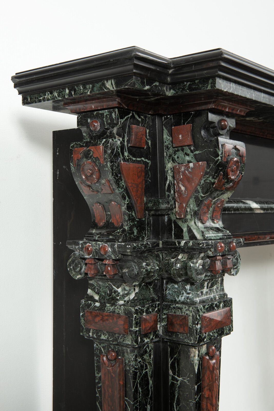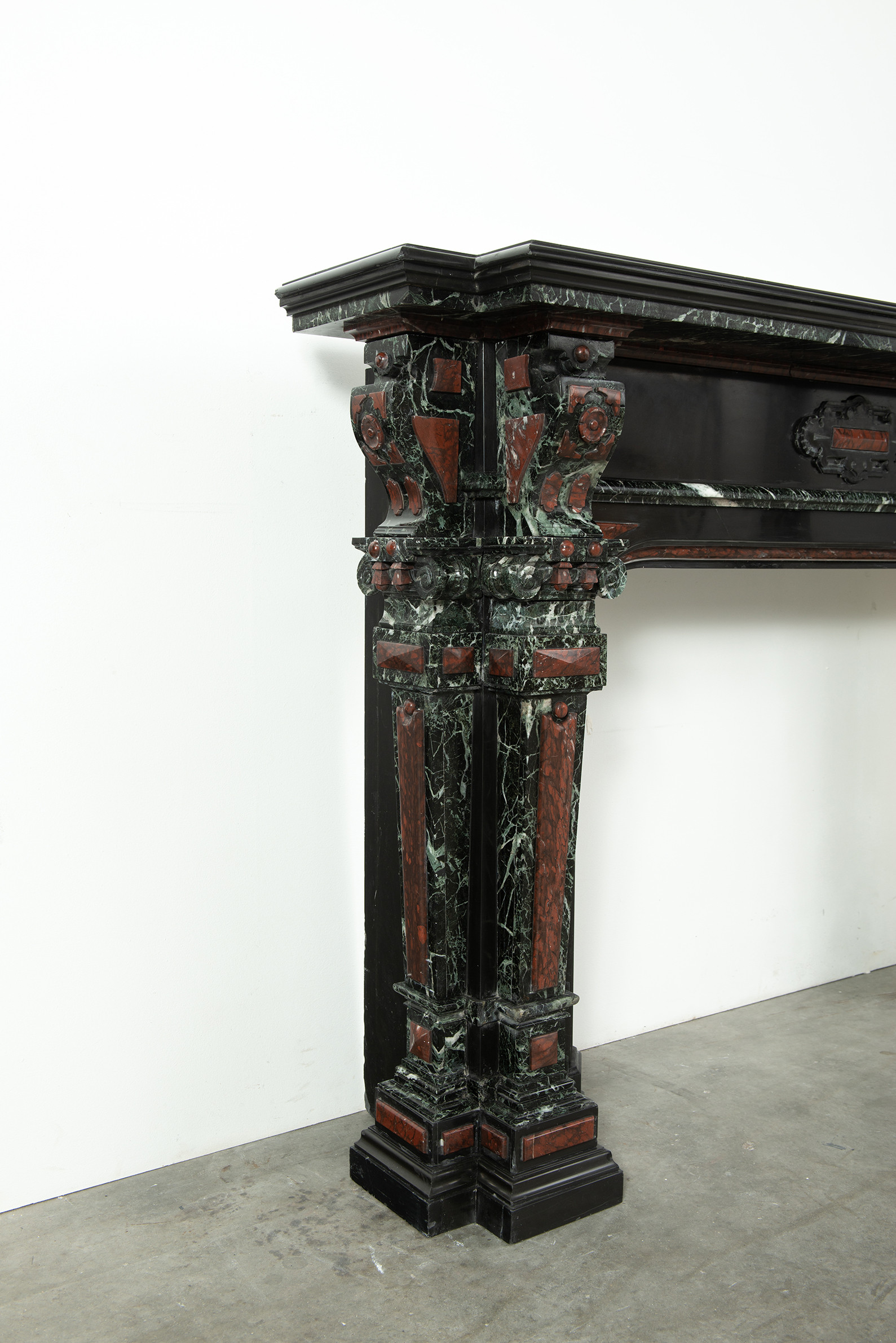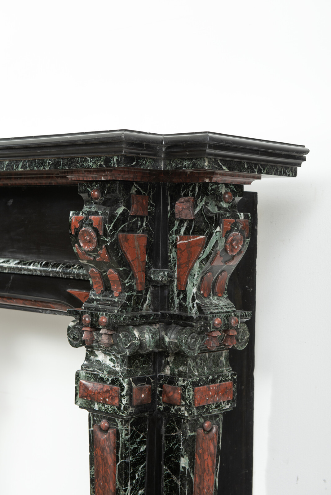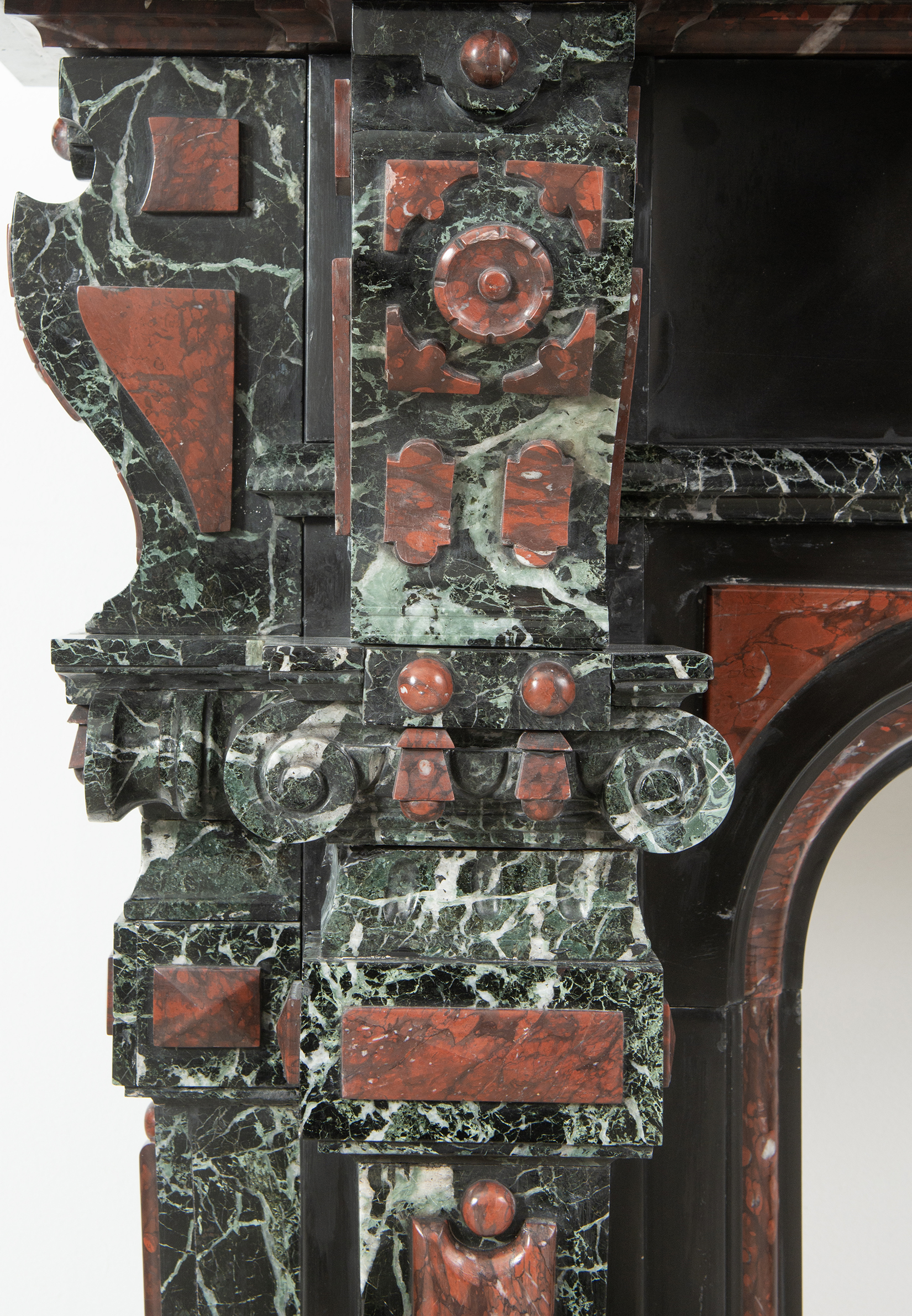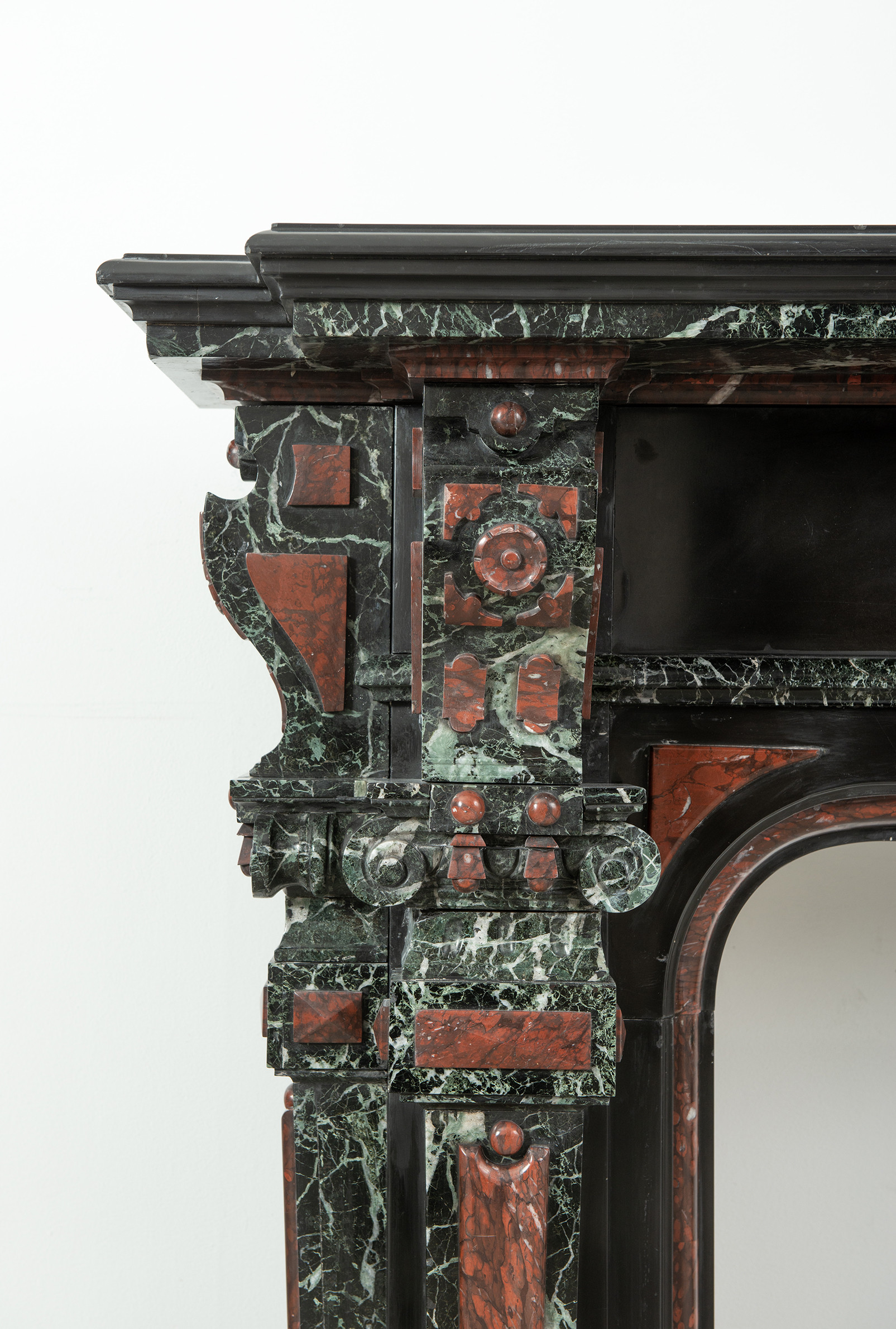 Deze imposante schouw is een echt statementpiece in een interieur. Zowel in ornamentiek als in materiaalkeuze is deze schouw uitbundig. Het groen Verde Alpi marmer heeft een drukke, boeiende tekening om te zien. Rood marmer is gebruikt voor de accenten van de ornamentiek, die in neorenaissance-stijl zijn ontworpen. De stijlen hebben de vorm van Ionische pilasters. Deze zwart marmeren schouw met gekleurde opleg vormt een visueel krachtig element voor een bijzonder interieur.
