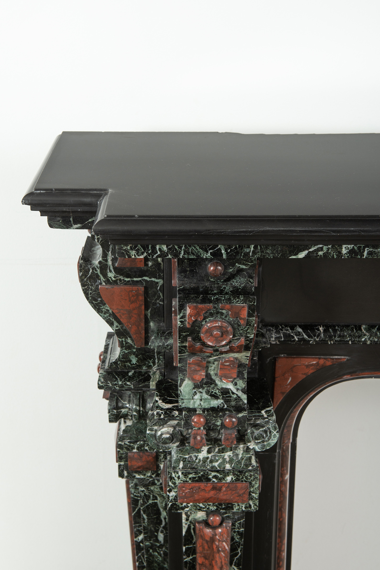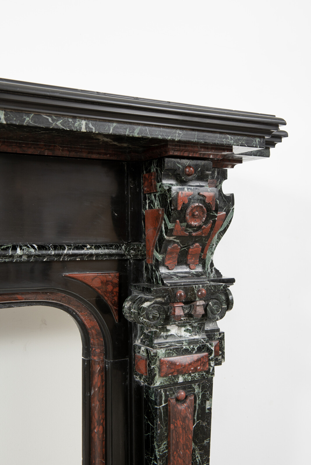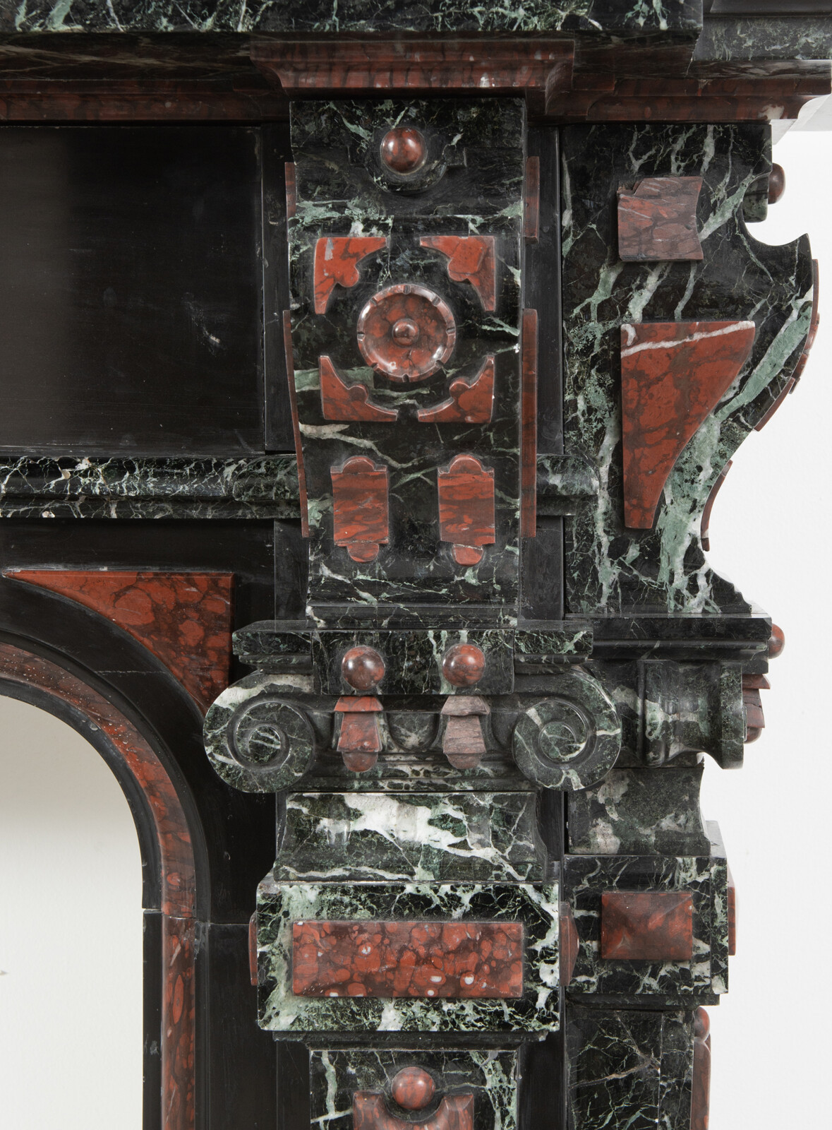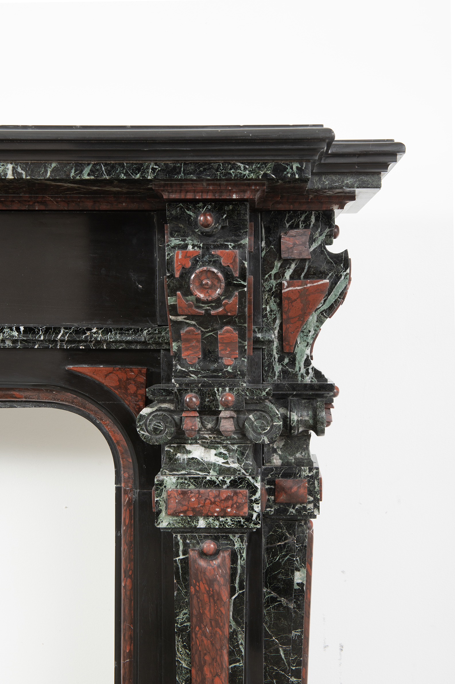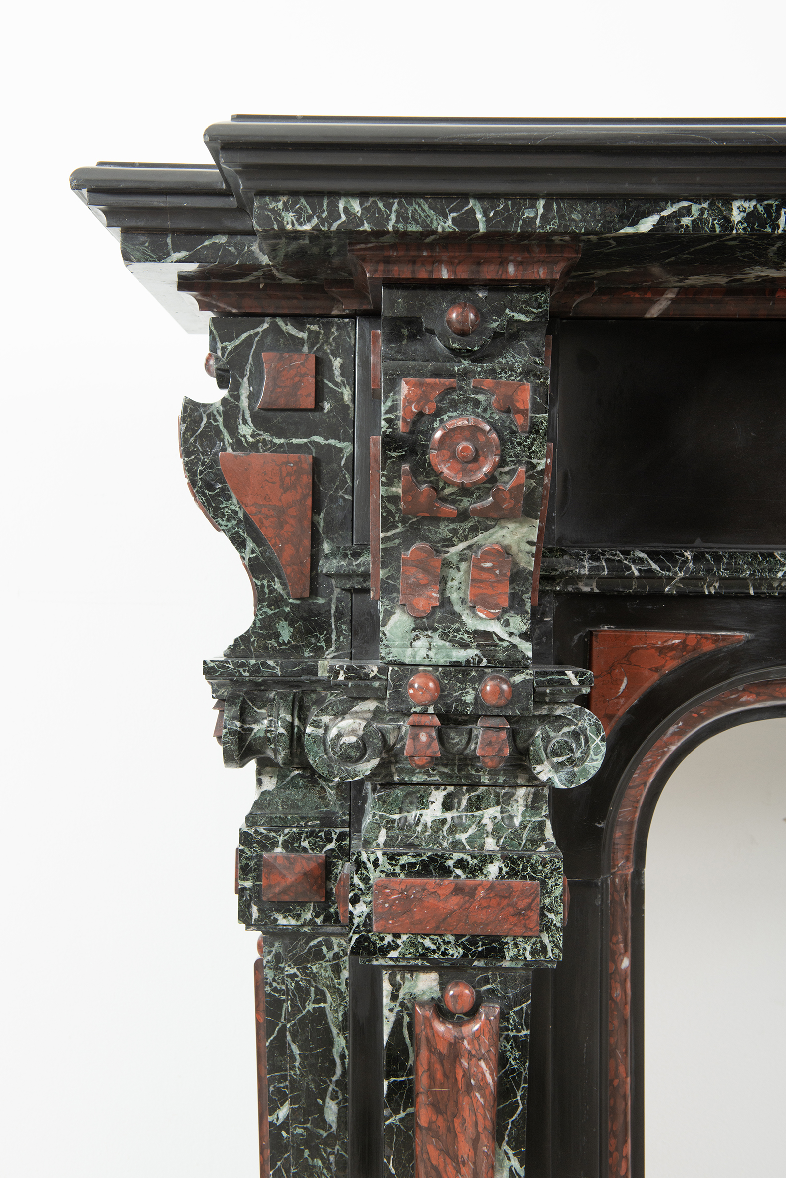 Deze imposante schouw is een echt statementpiece in een interieur. Zowel in ornamentiek als in materiaalkeuze is deze schouw uitbundig. Het groen Verde Alpi marmer heeft een drukke, boeiende tekening om te zien. Rood marmer is gebruikt voor de accenten van de ornamentiek, die in neorenaissance-stijl zijn ontworpen. De stijlen hebben de vorm van Ionische pilasters. Deze zwart marmeren schouw met gekleurde opleg vormt een visueel krachtig element voor een bijzonder interieur.