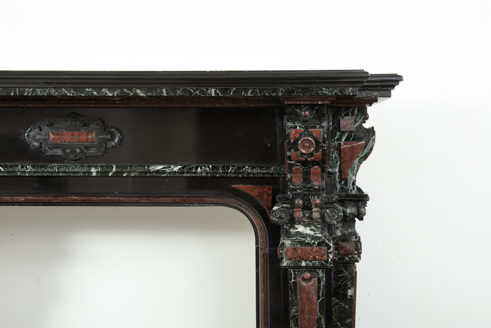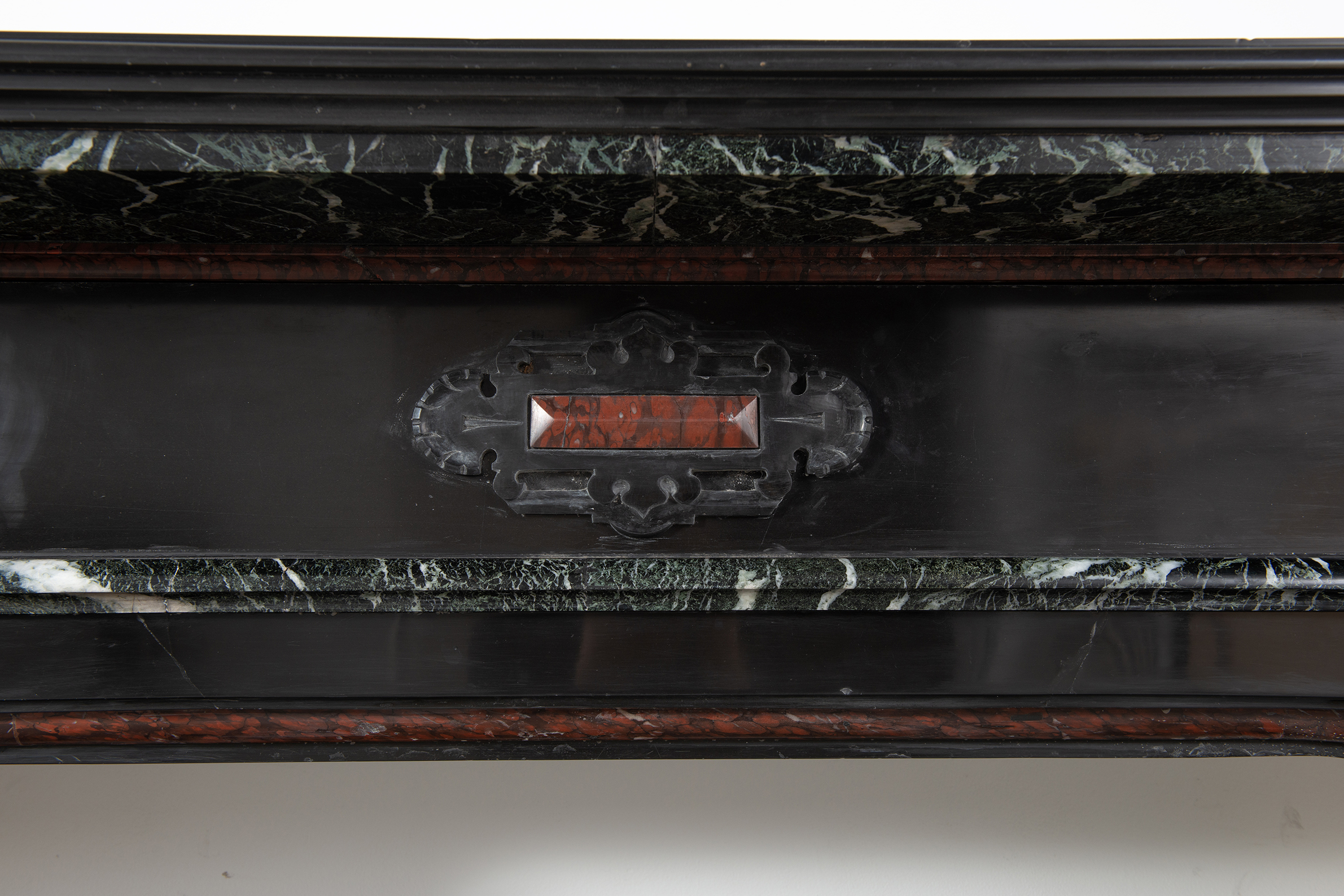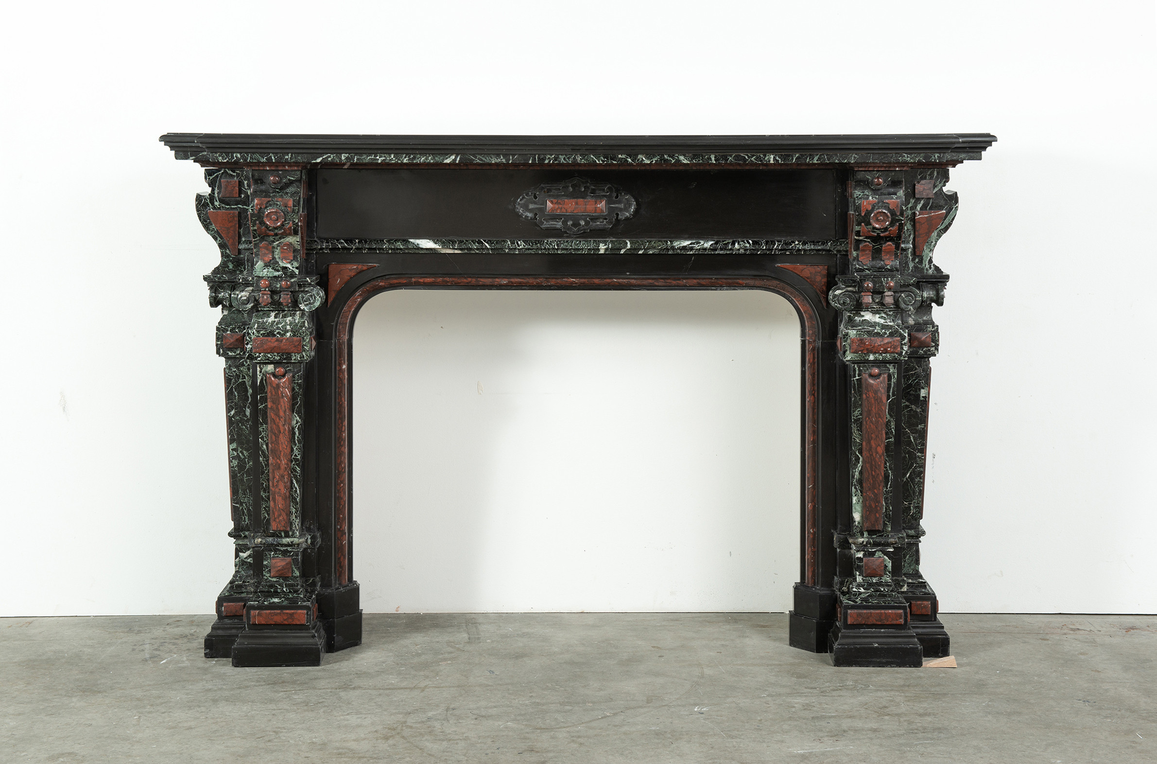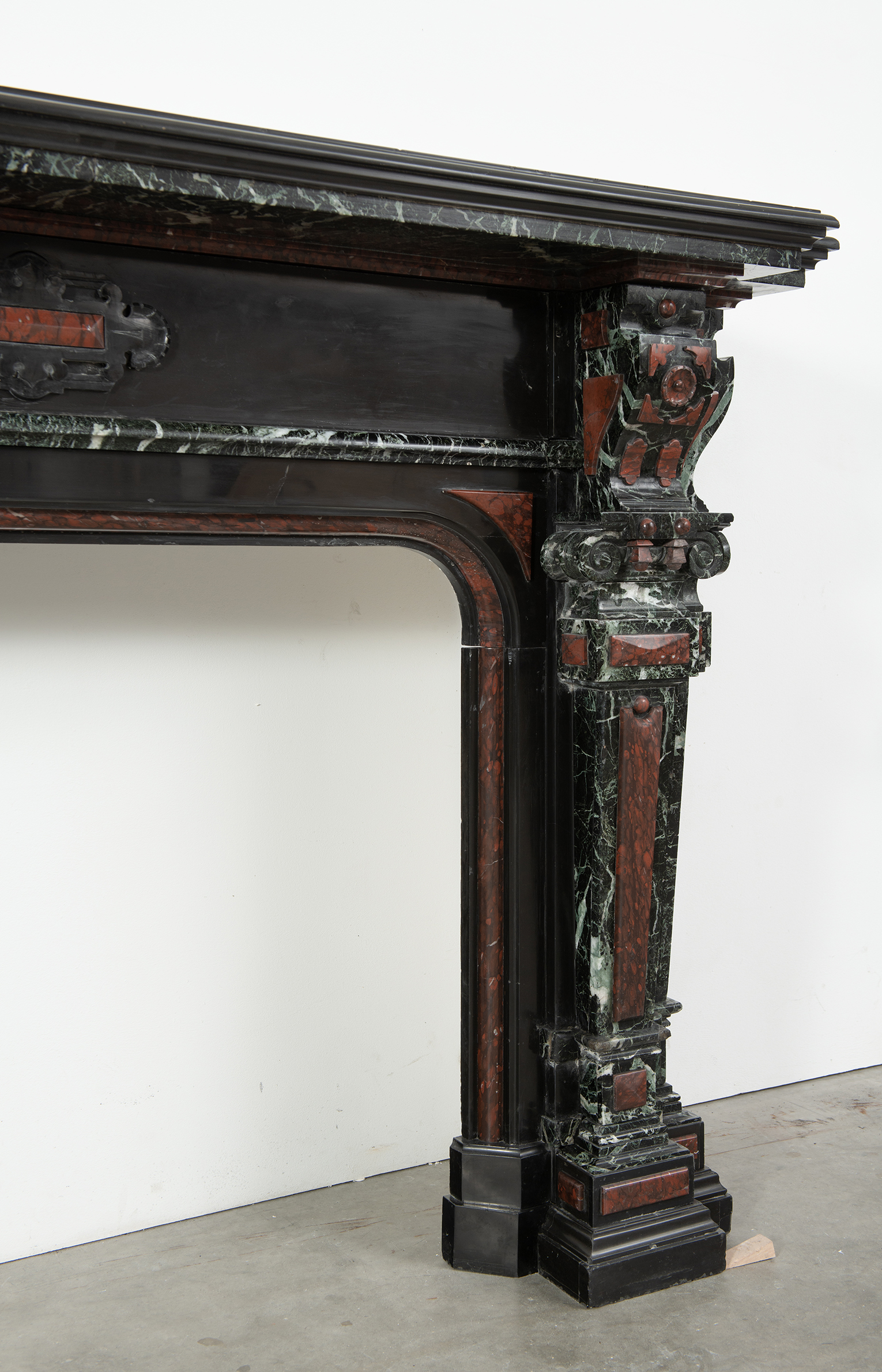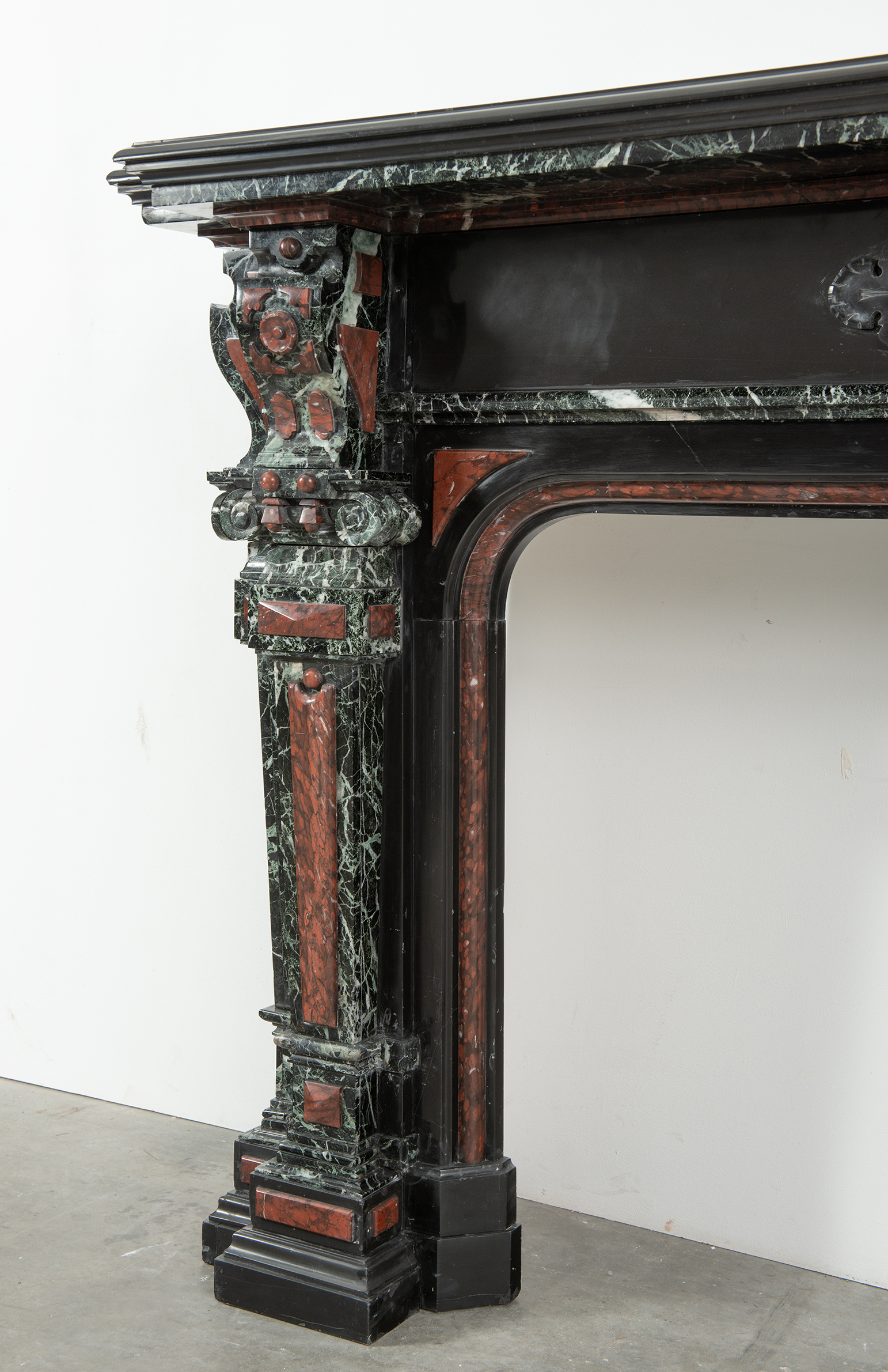 Deze imposante schouw is een echt statementpiece in een interieur. Zowel in ornamentiek als in materiaalkeuze is deze schouw uitbundig. Het groen Verde Alpi marmer heeft een drukke, boeiende tekening om te zien. Rood marmer is gebruikt voor de accenten van de ornamentiek, die in neorenaissance-stijl zijn ontworpen. De stijlen hebben de vorm van Ionische pilasters. Deze zwart marmeren schouw met gekleurde opleg vormt een visueel krachtig element voor een bijzonder interieur.