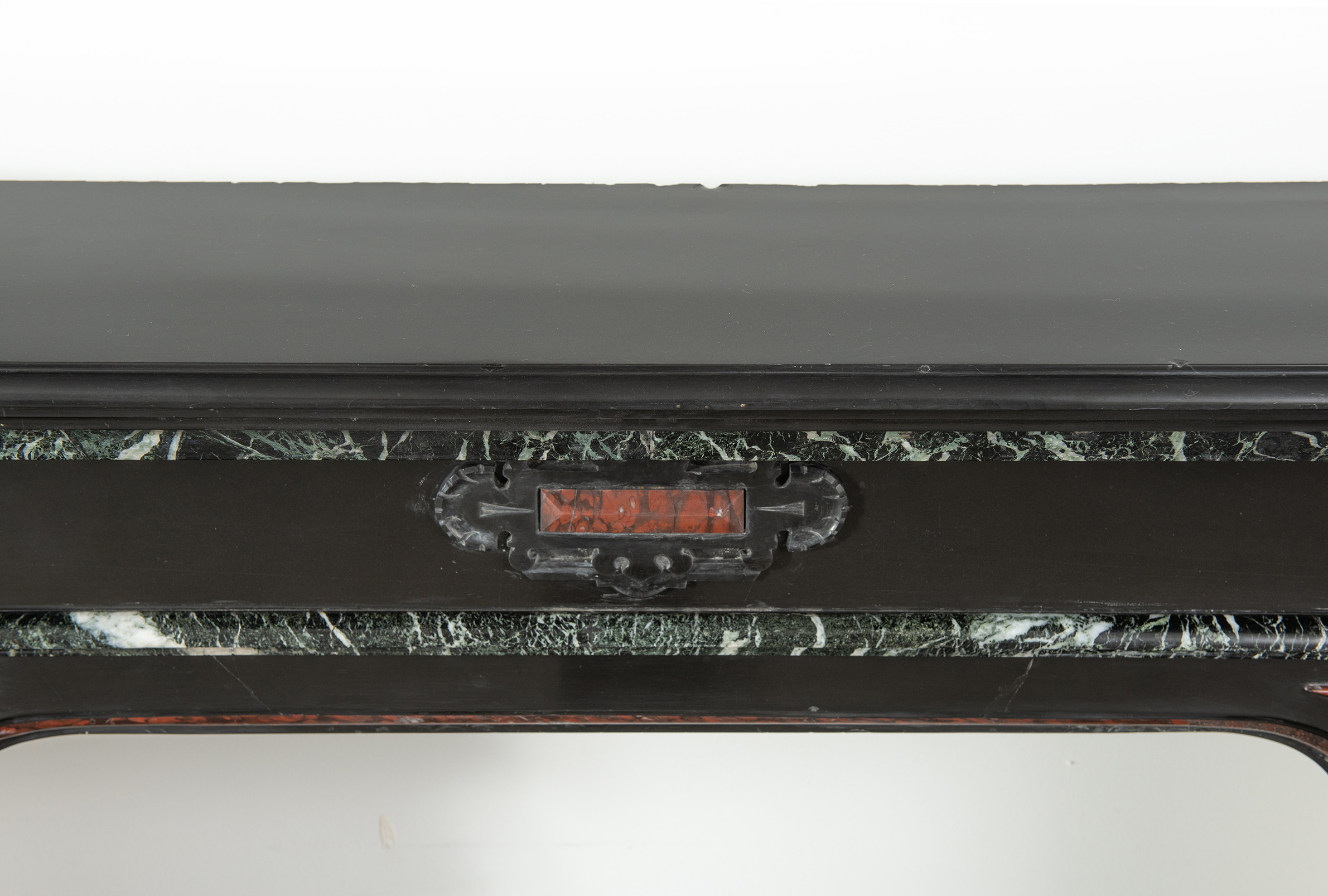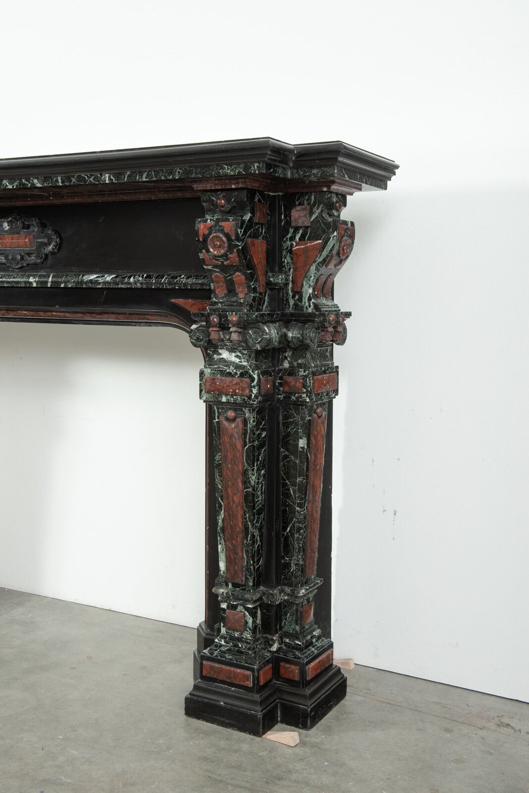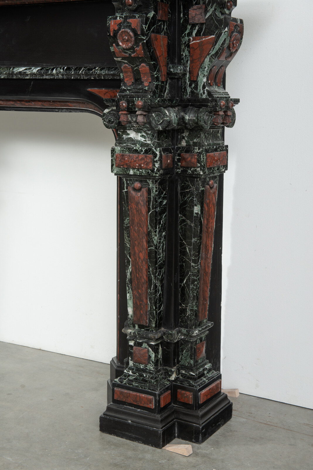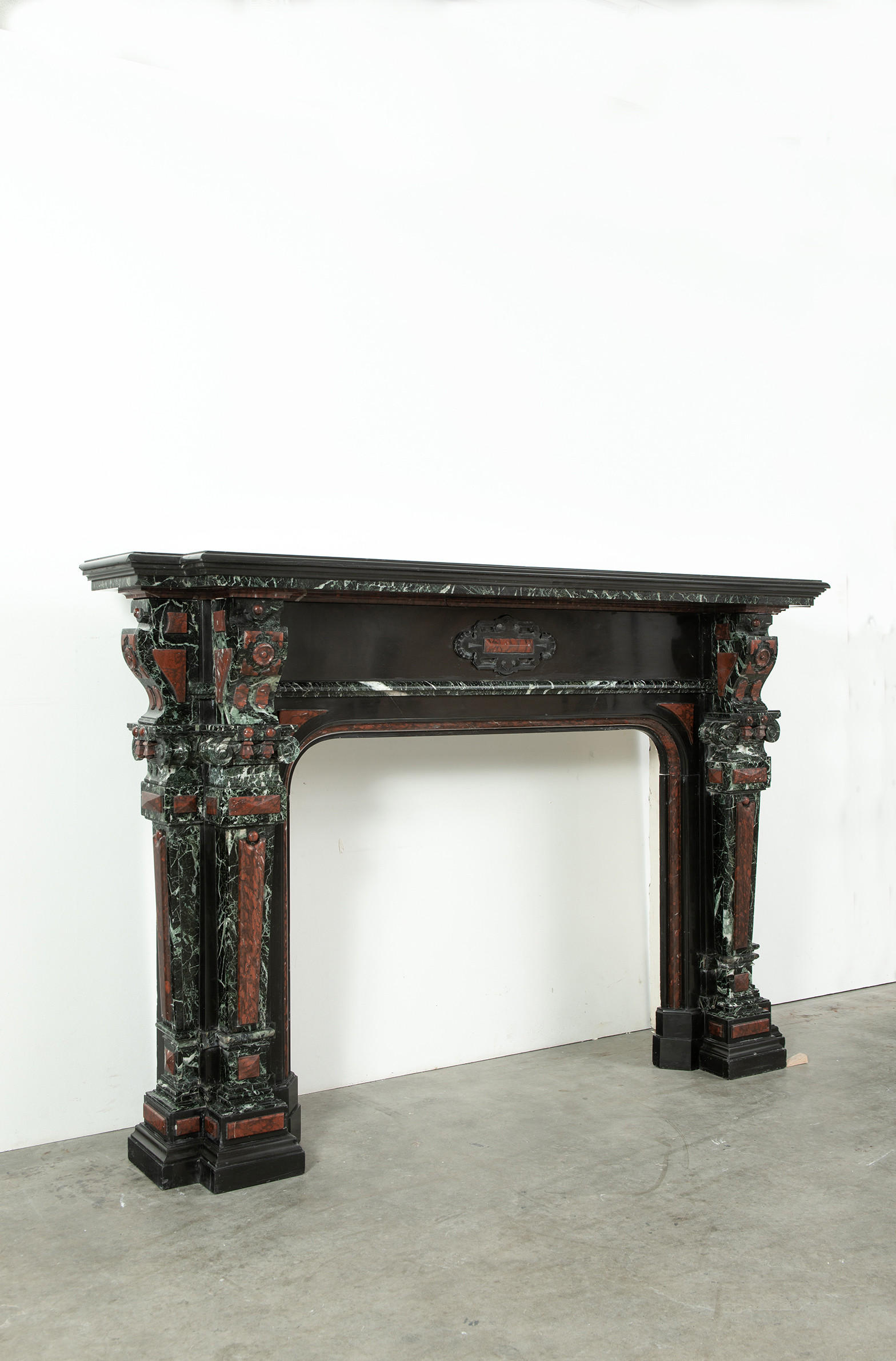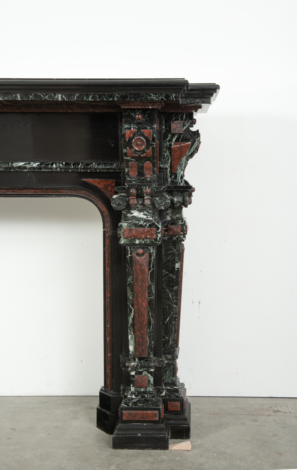 Deze imposante schouw is een echt statementpiece in een interieur. Zowel in ornamentiek als in materiaalkeuze is deze schouw uitbundig. Het groen Verde Alpi marmer heeft een drukke, boeiende tekening om te zien. Rood marmer is gebruikt voor de accenten van de ornamentiek, die in neorenaissance-stijl zijn ontworpen. De stijlen hebben de vorm van Ionische pilasters. Deze zwart marmeren schouw met gekleurde opleg vormt een visueel krachtig element voor een bijzonder interieur.