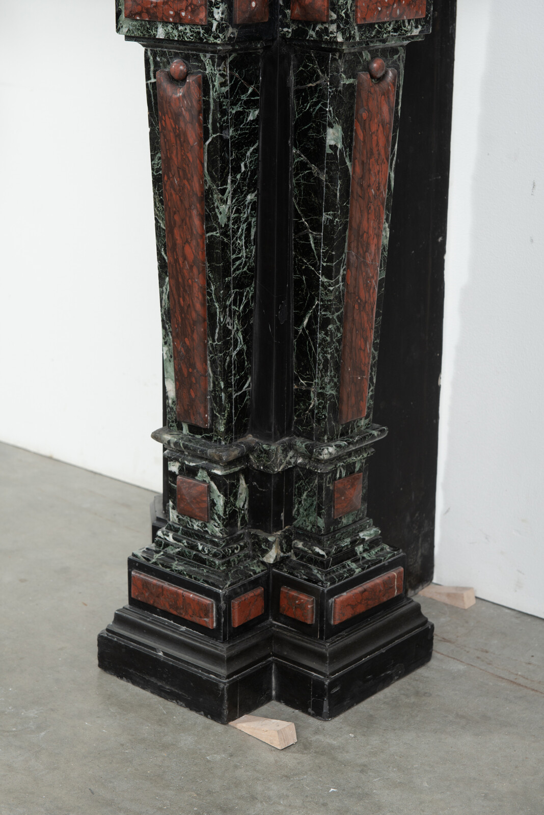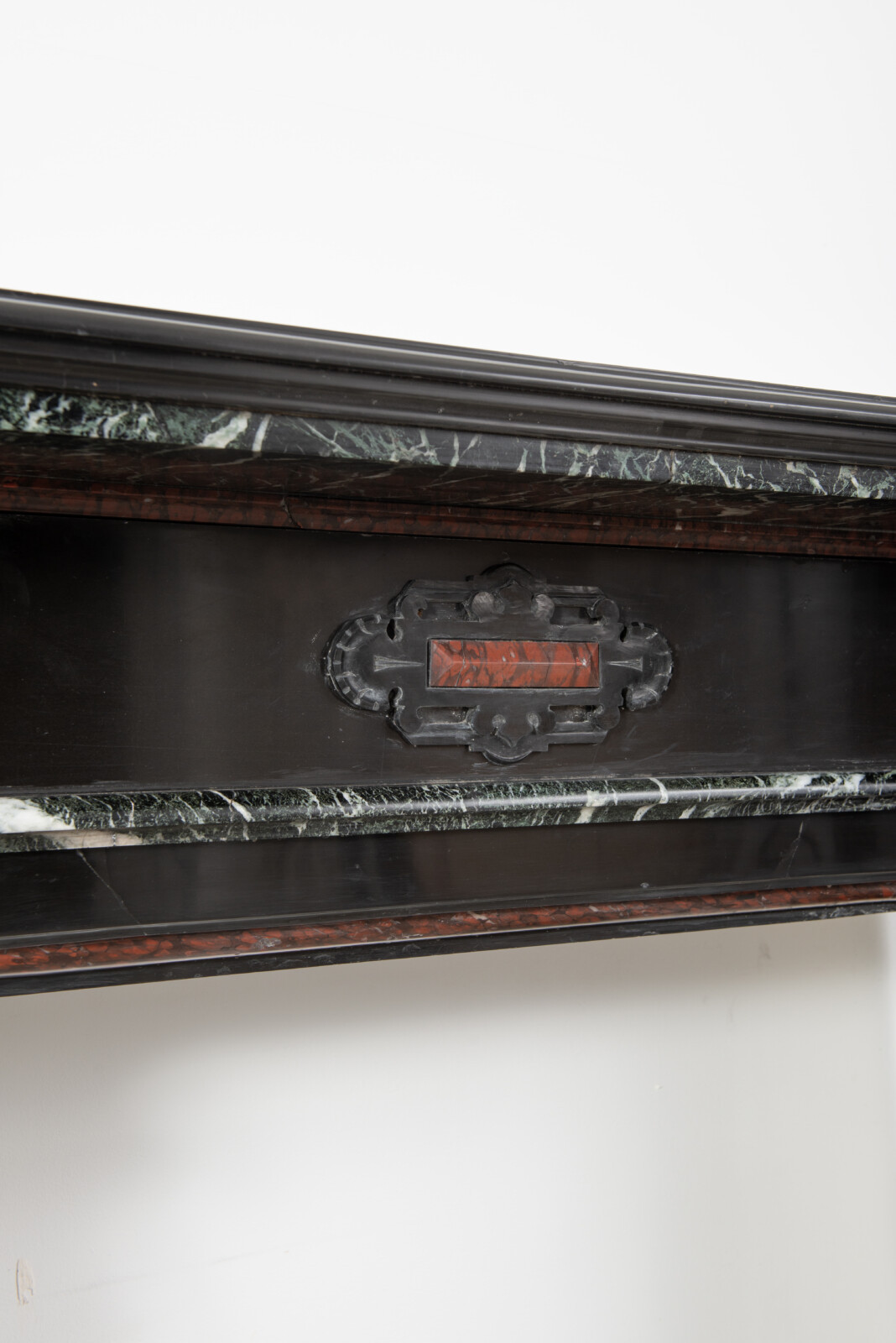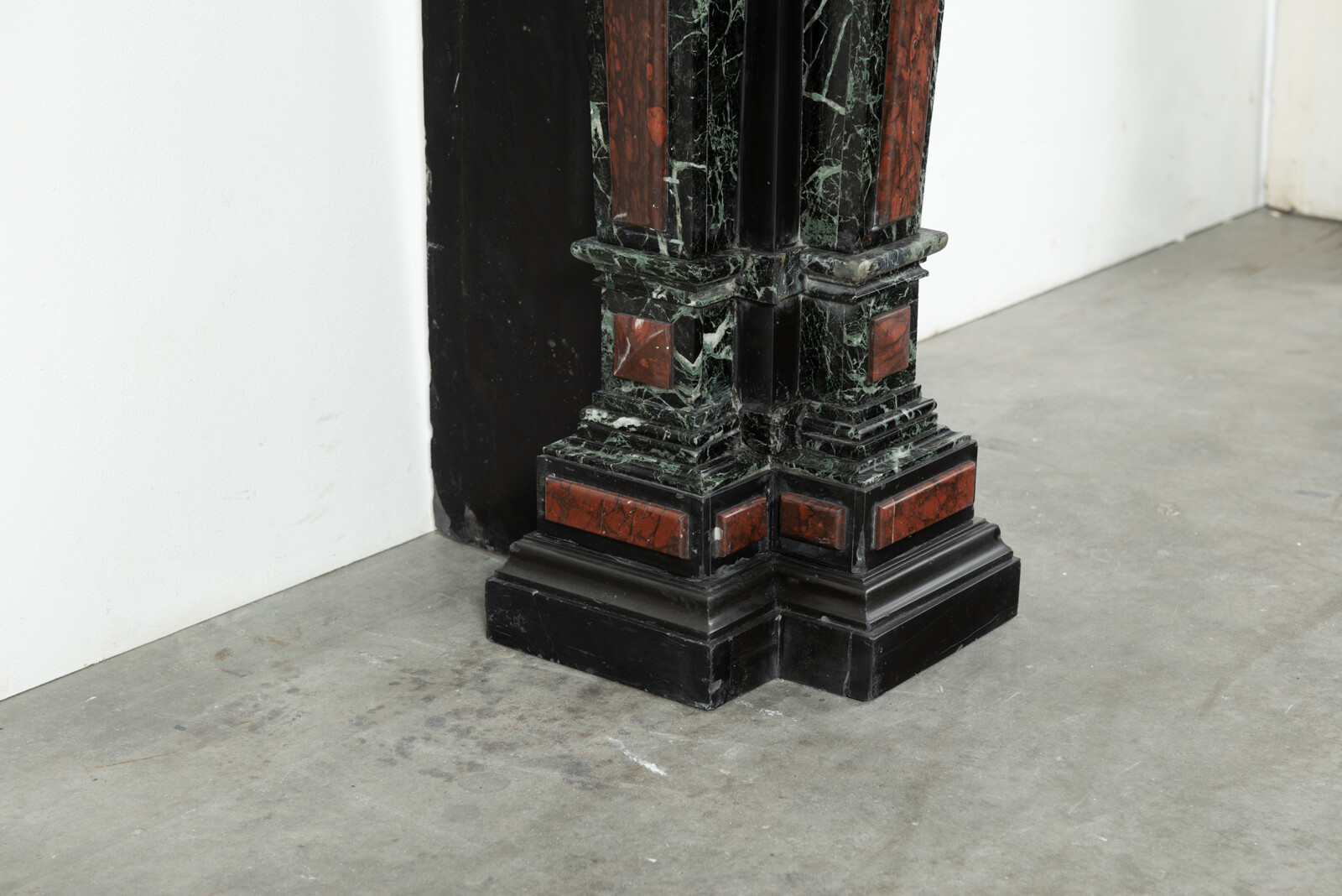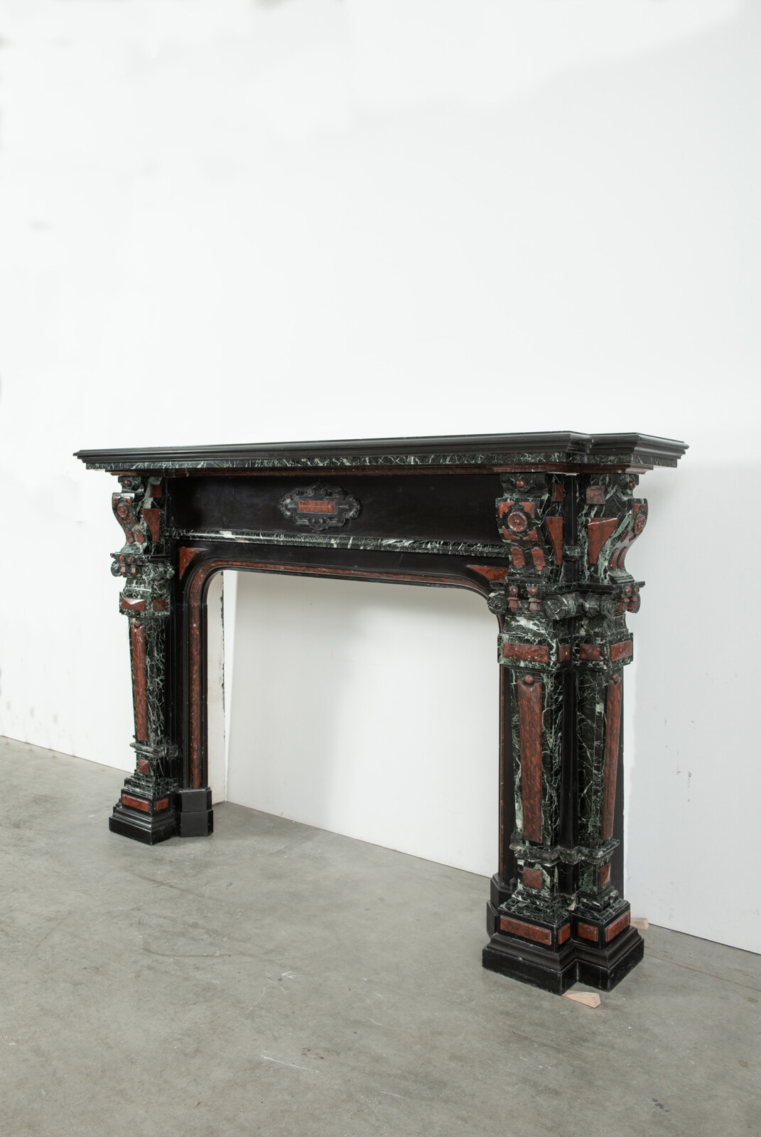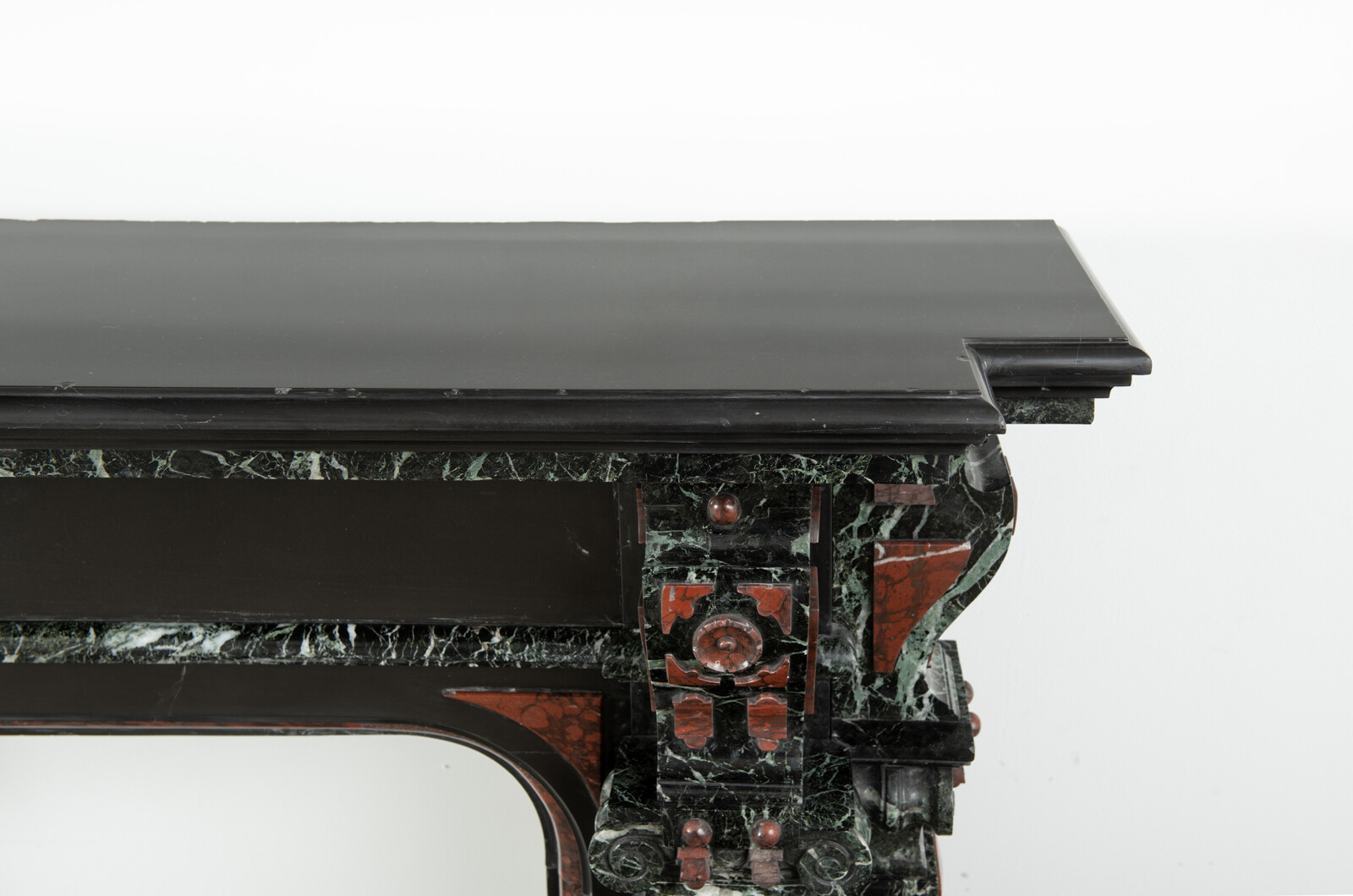Deze imposante schouw is een echt statementpiece in een interieur. Zowel in ornamentiek als in materiaalkeuze is deze schouw uitbundig. Het groen Verde Alpi marmer heeft een drukke, boeiende tekening om te zien. Rood marmer is gebruikt voor de accenten van de ornamentiek, die in neorenaissance-stijl zijn ontworpen. De stijlen hebben de vorm van Ionische pilasters. Deze zwart marmeren schouw met gekleurde opleg vormt een visueel krachtig element voor een bijzonder interieur.